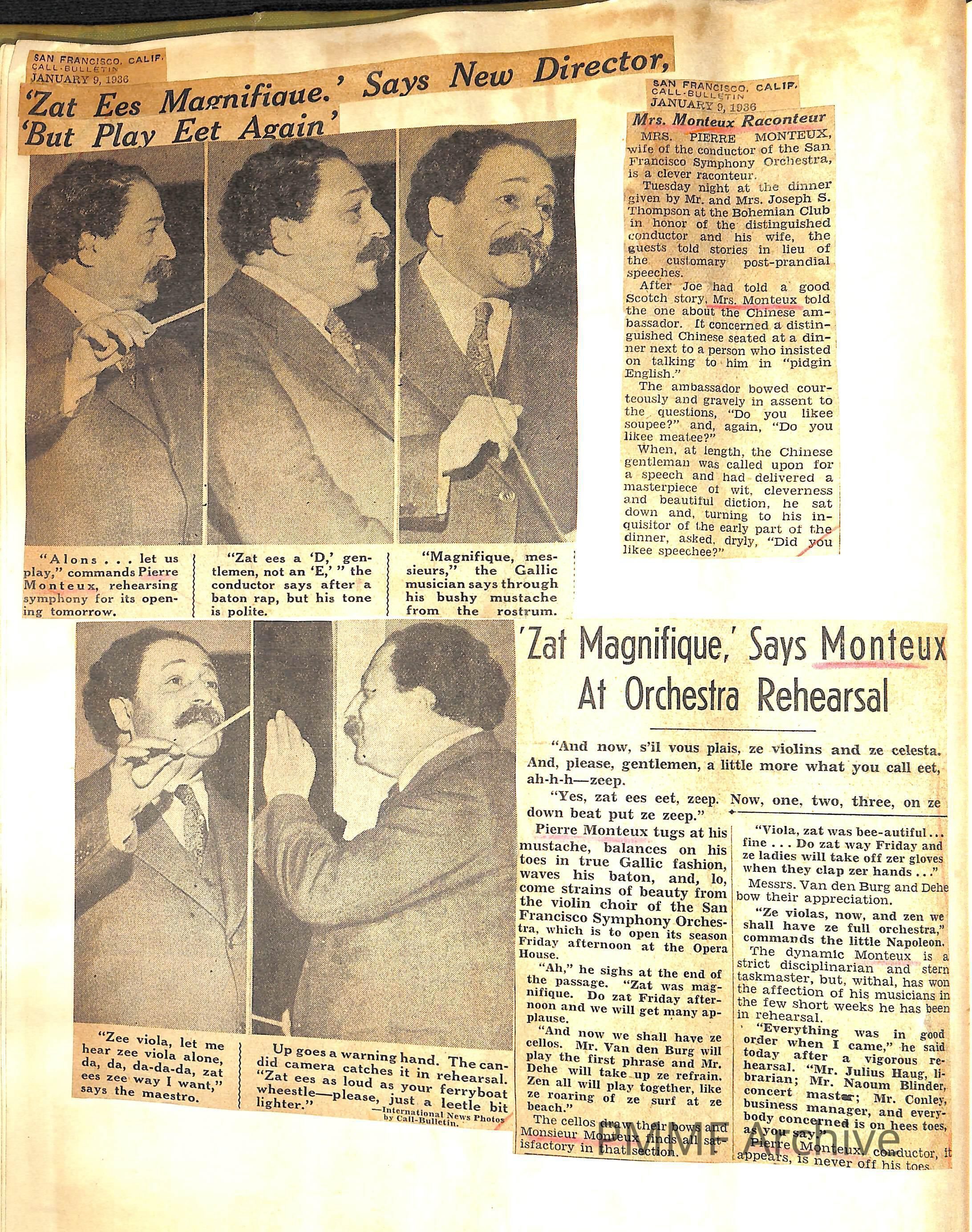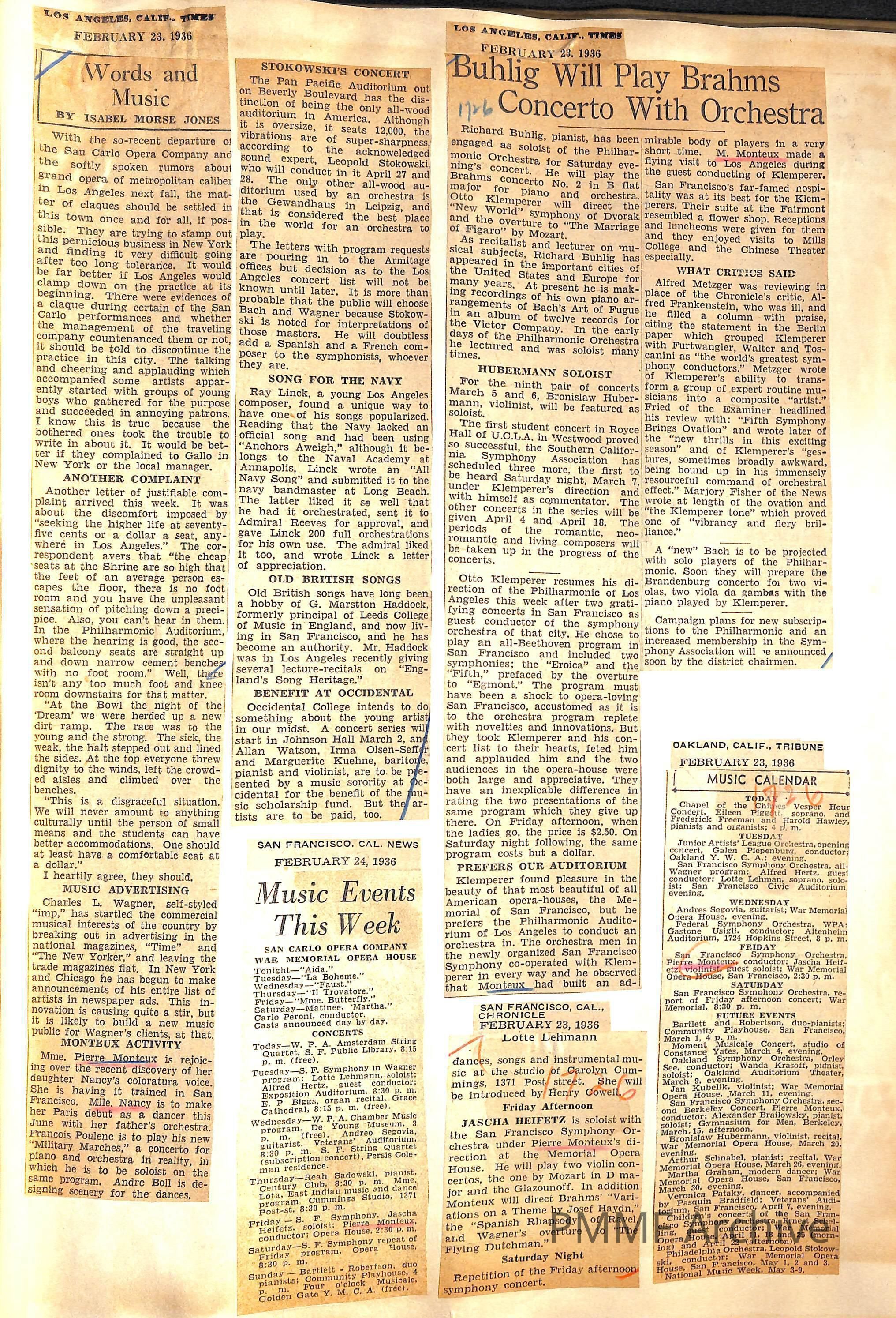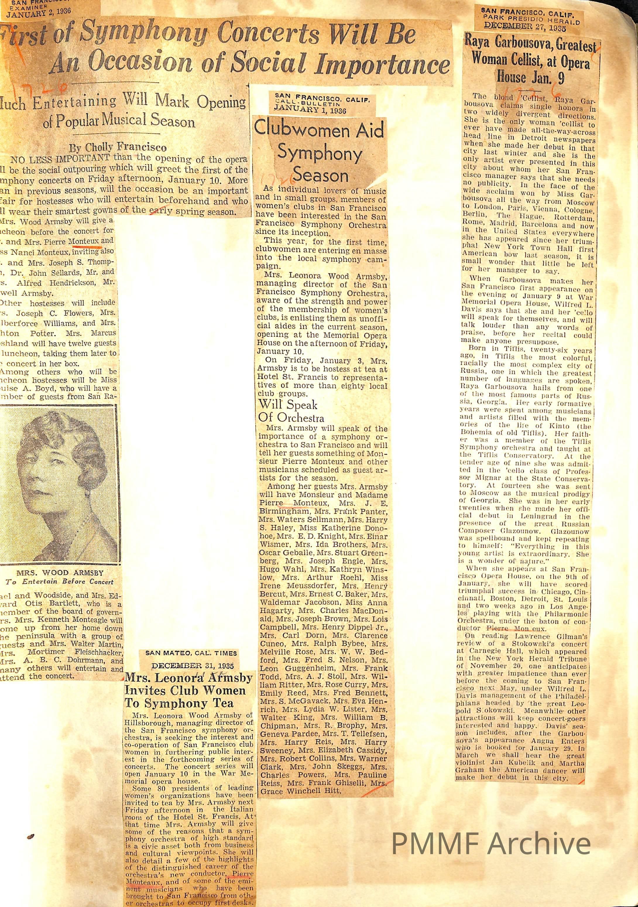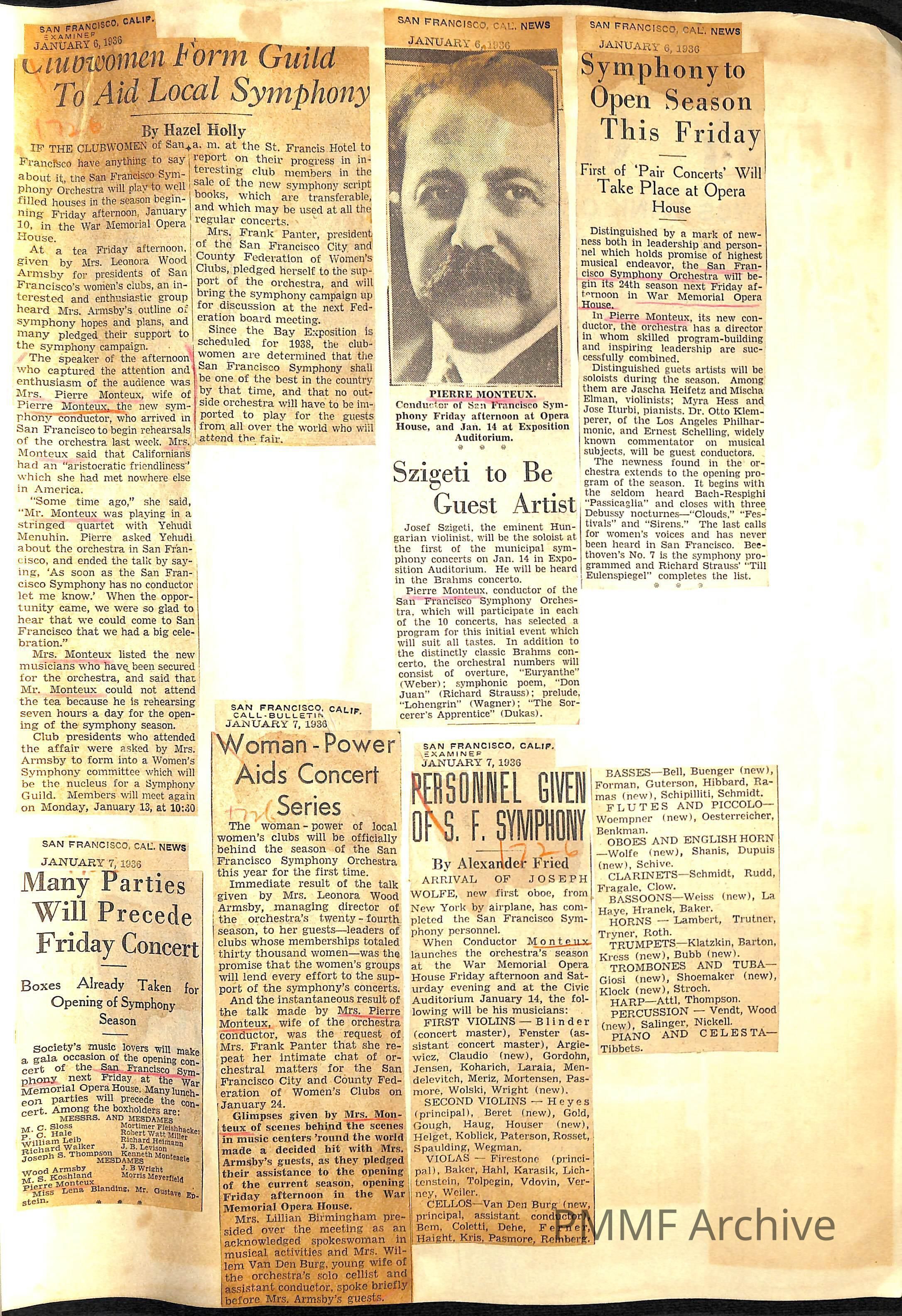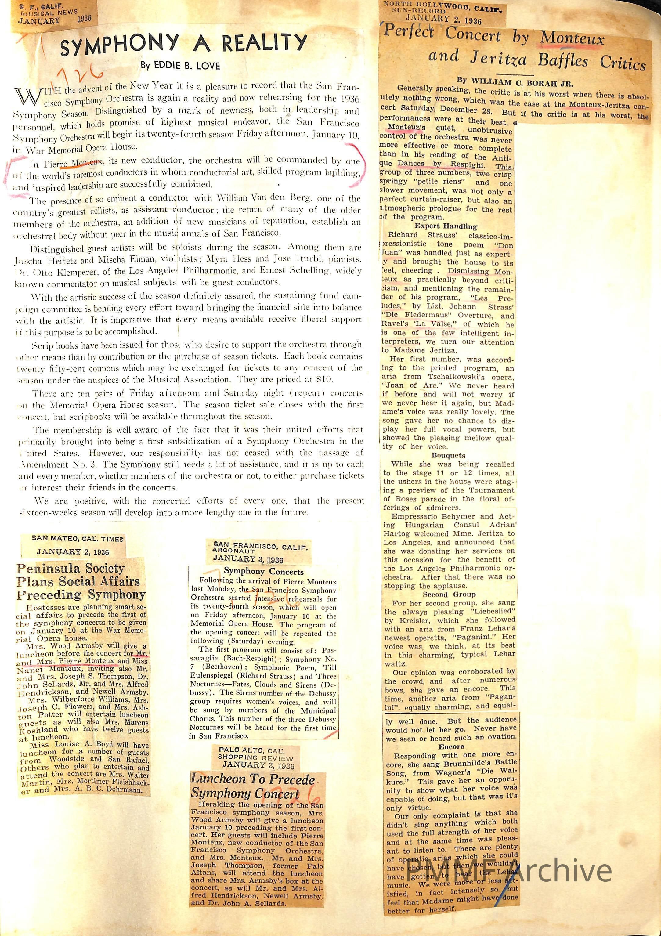 Scrapbook created by Doris Monteux of newspaper articles from 1935-1936 related to the first year of Monteux conducting the San Francisco Symphony Orchestra.