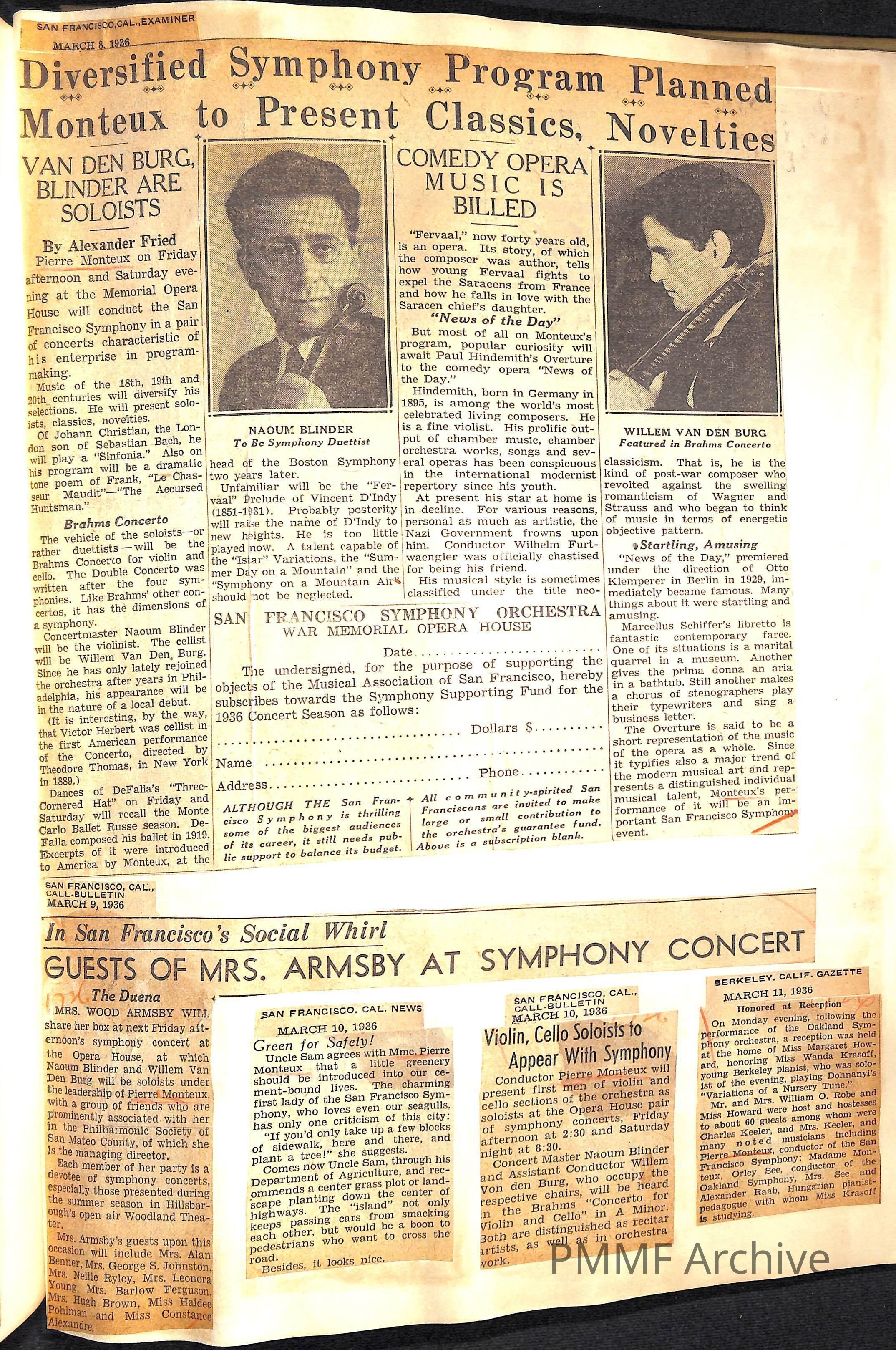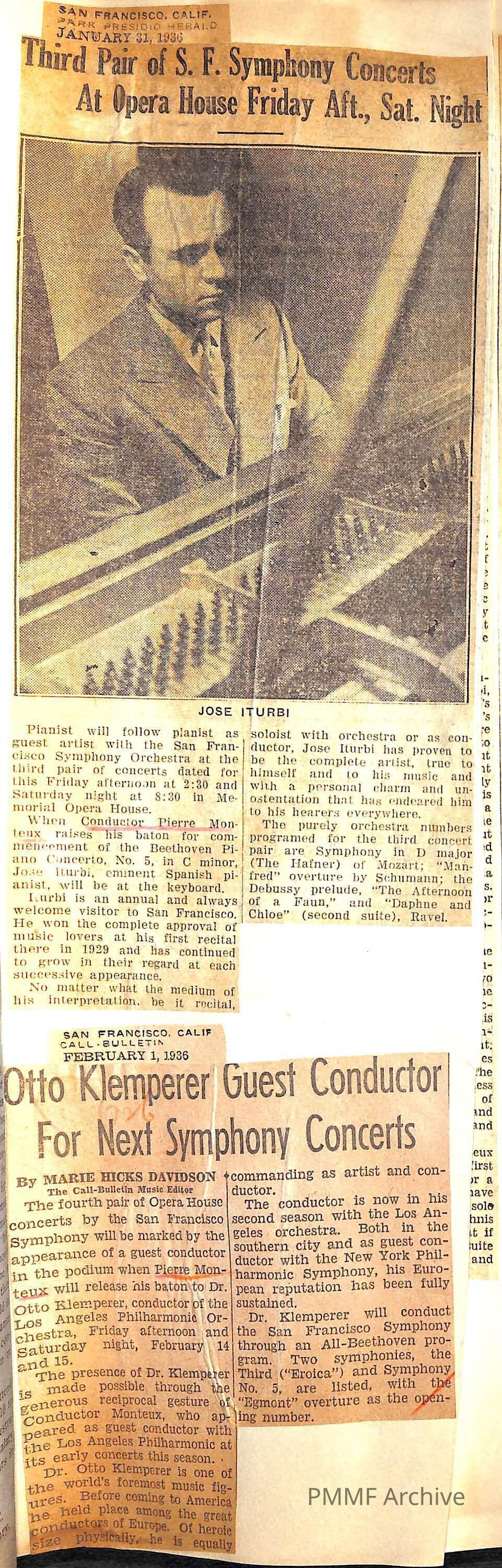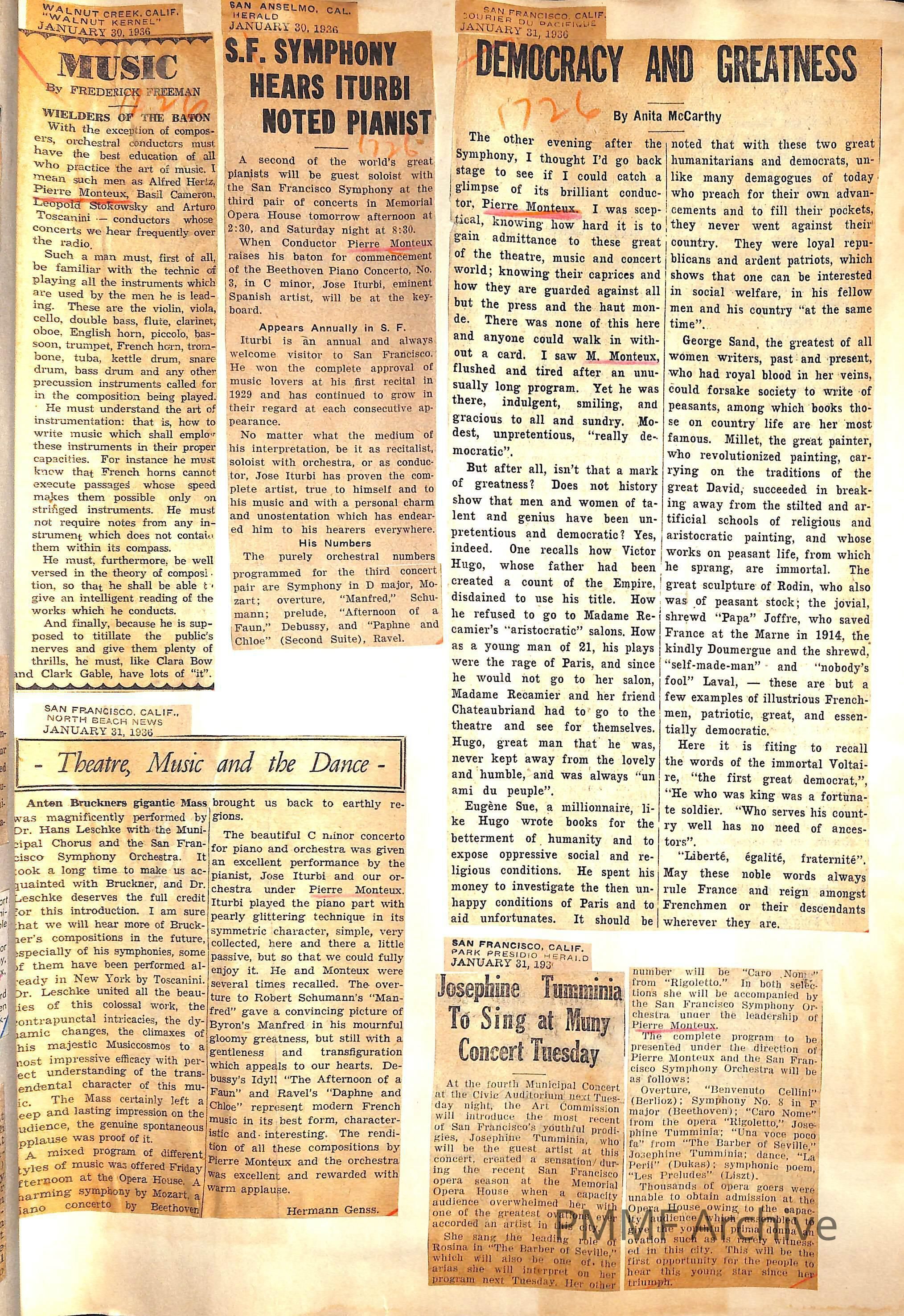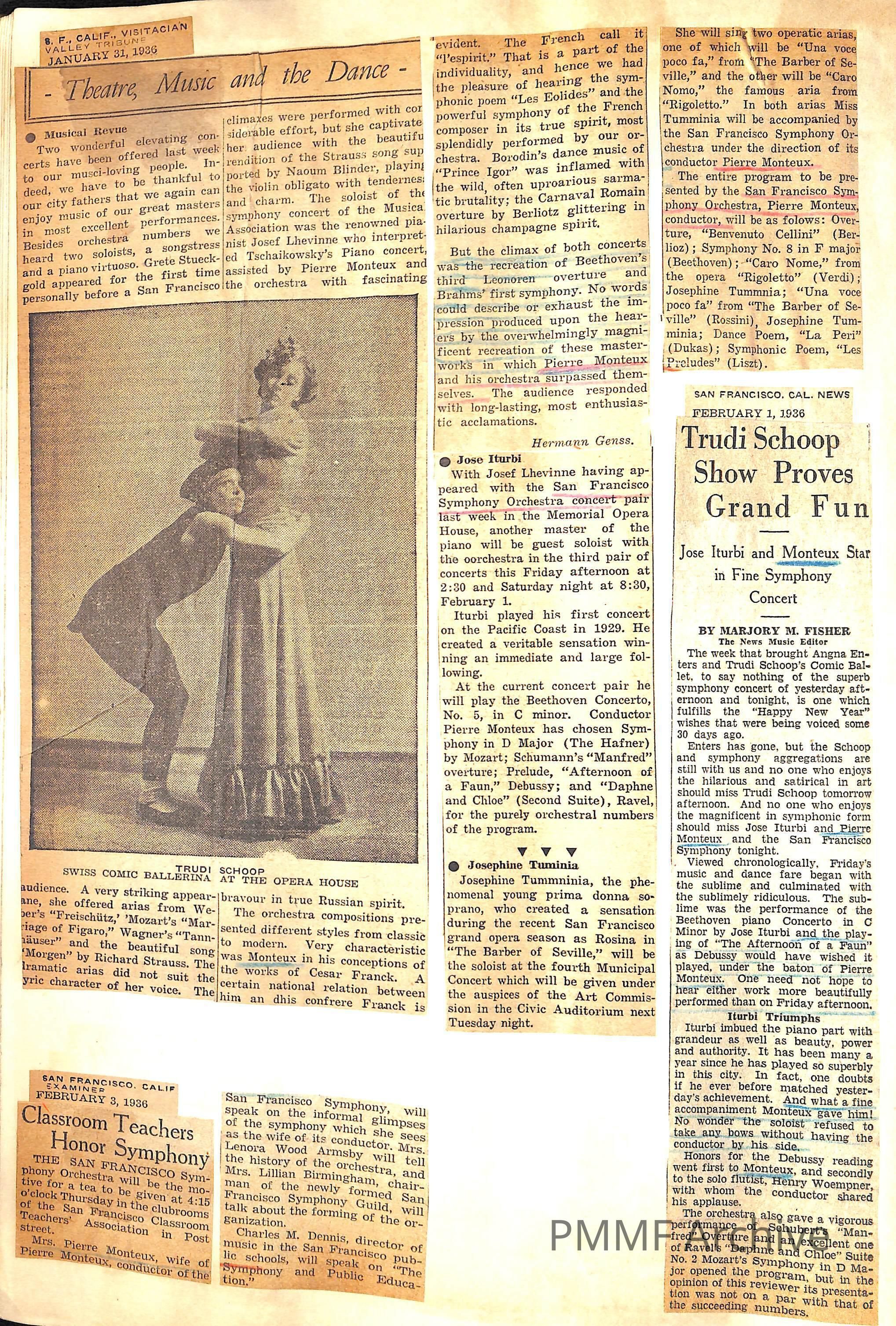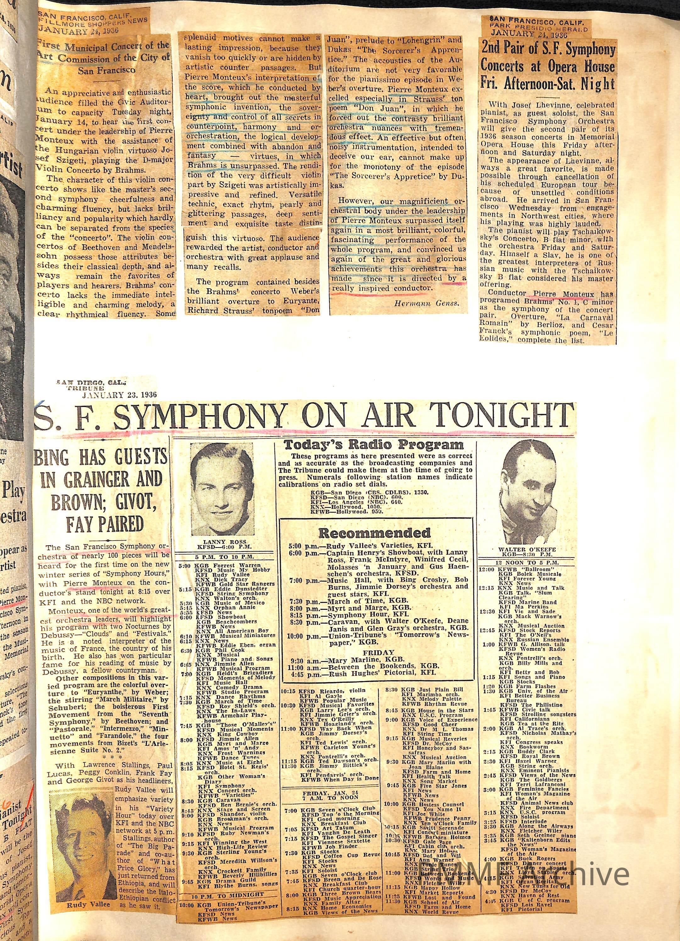 Scrapbook created by Doris Monteux of newspaper articles from 1935-1936 related to the first year of Monteux conducting the San Francisco Symphony Orchestra.
