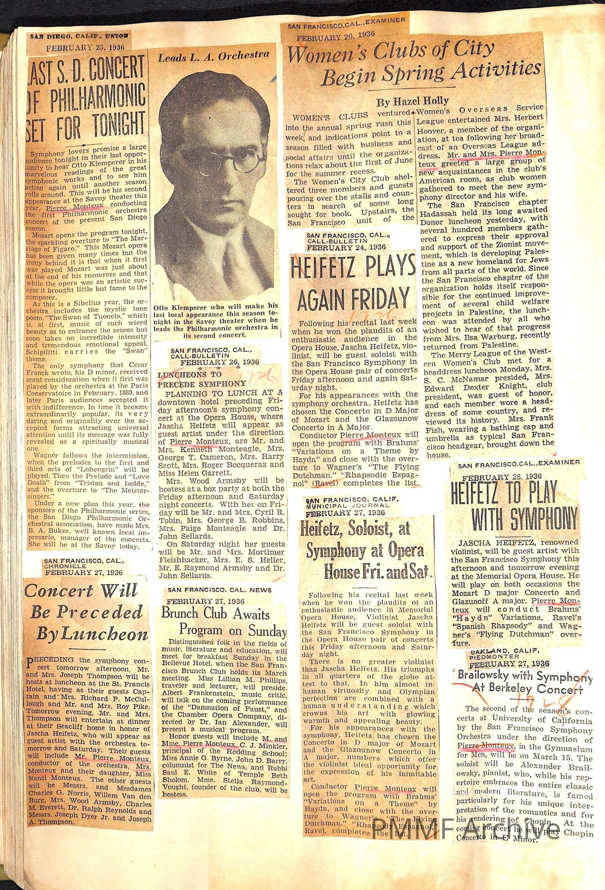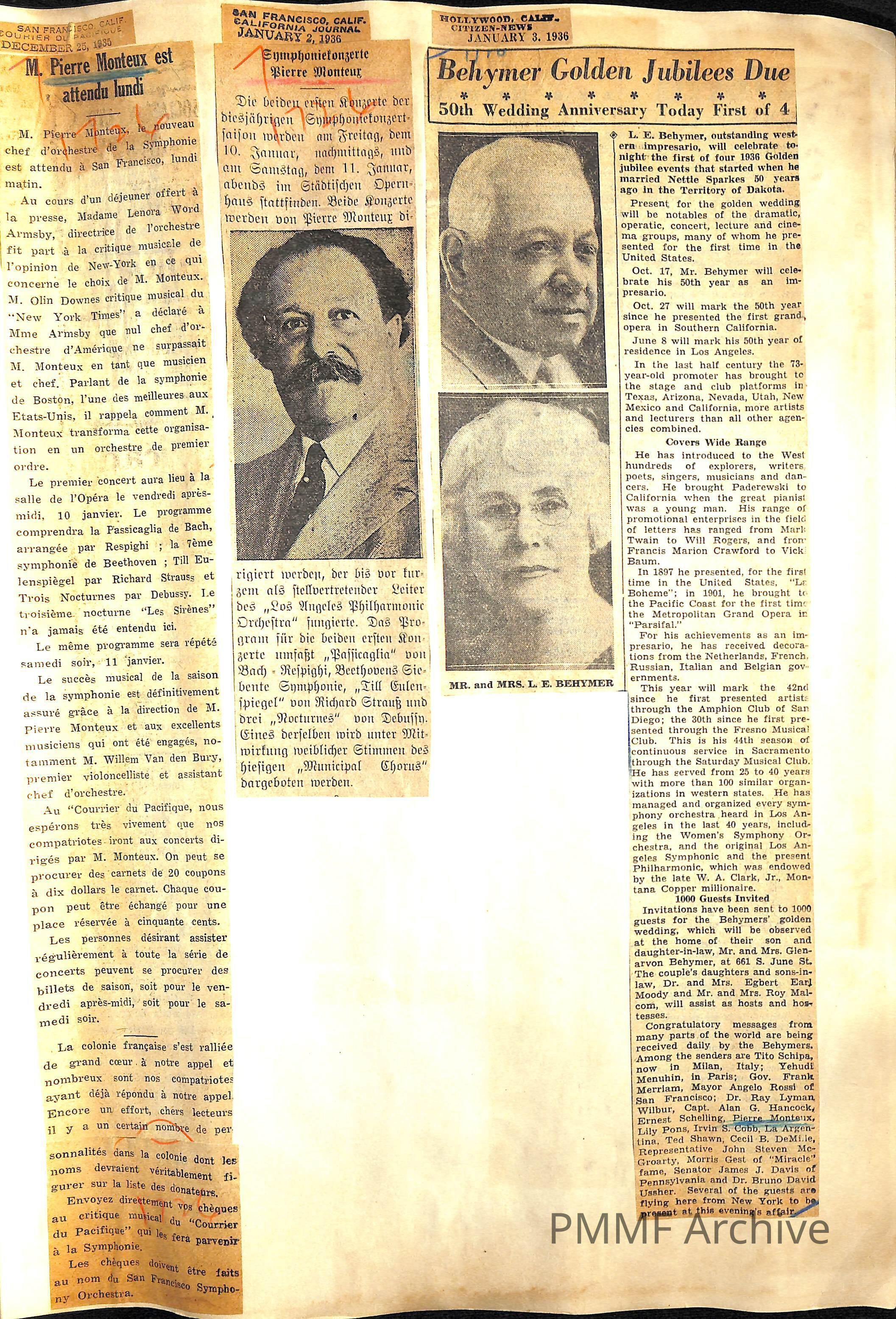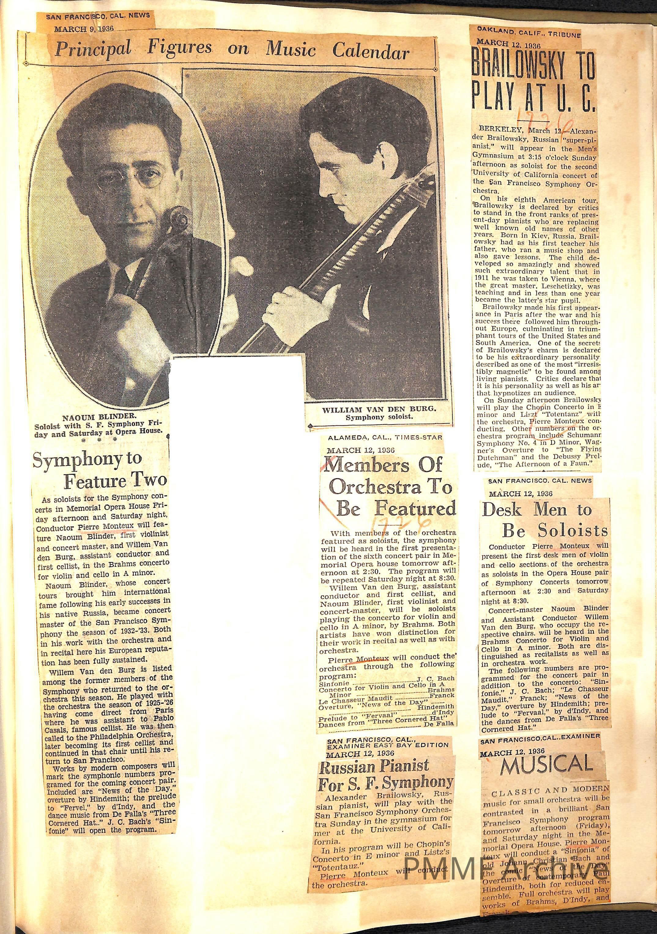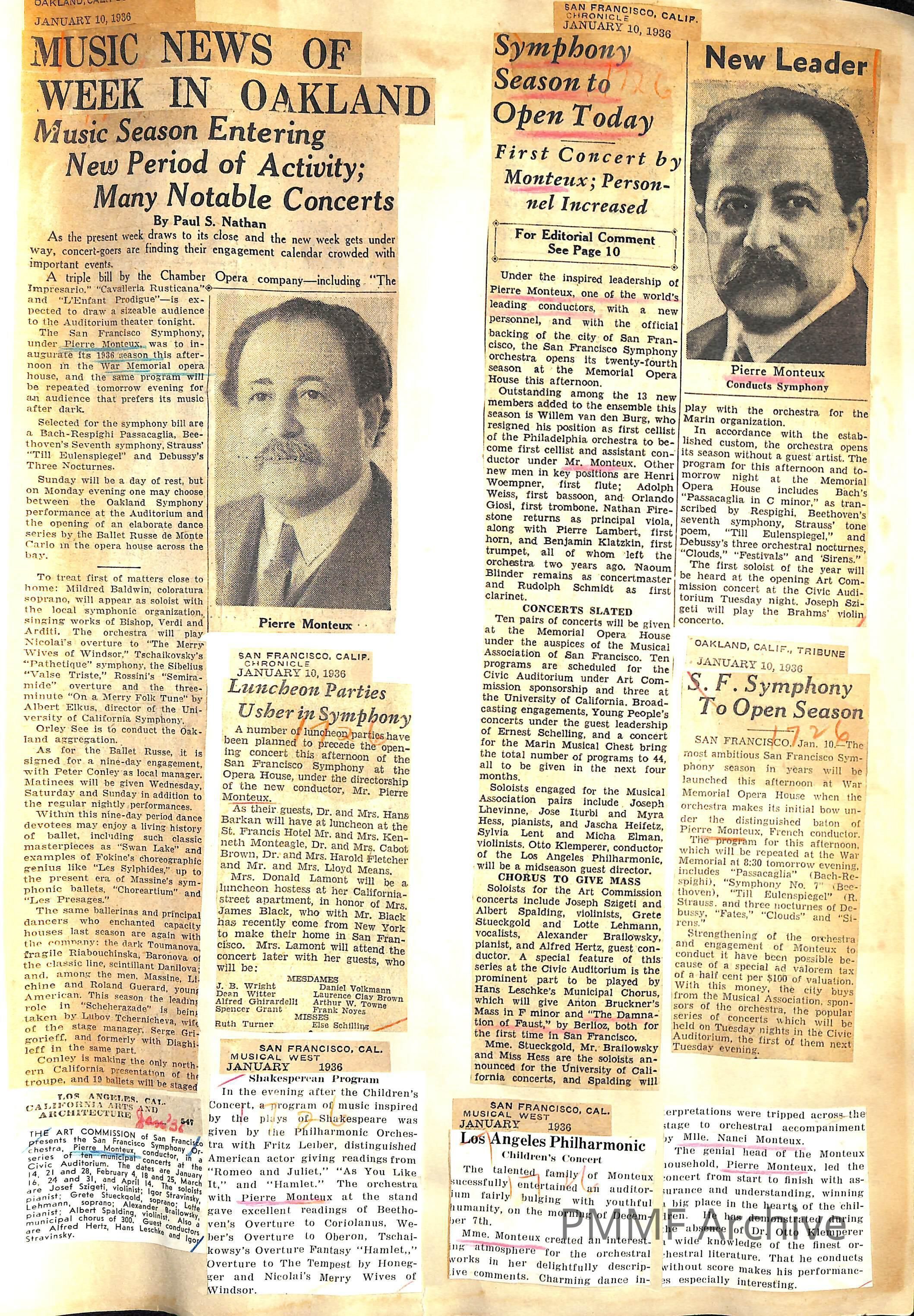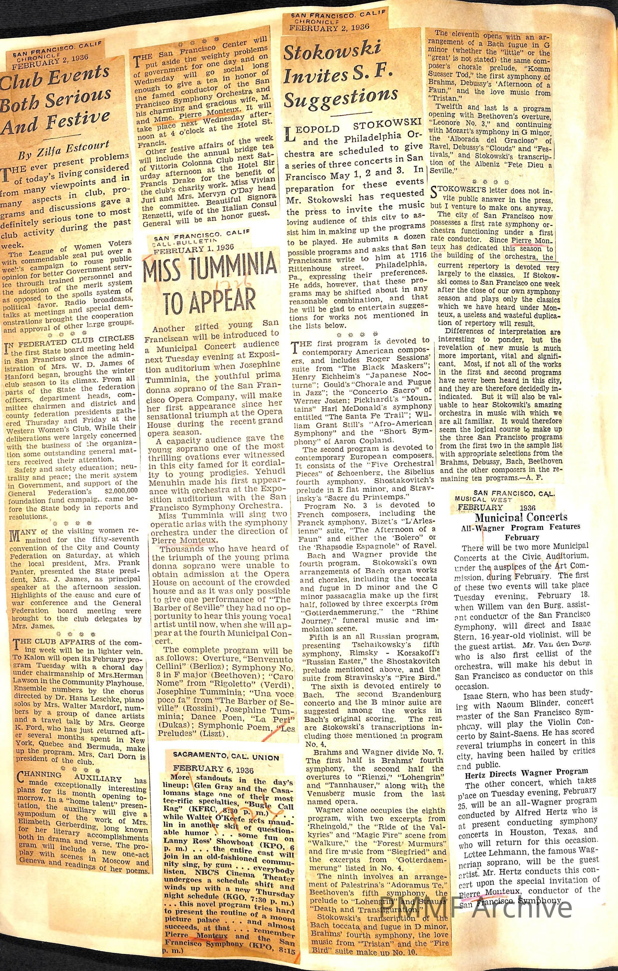 Scrapbook created by Doris Monteux of newspaper articles from 1935-1936 related to the first year of Monteux conducting the San Francisco Symphony Orchestra.