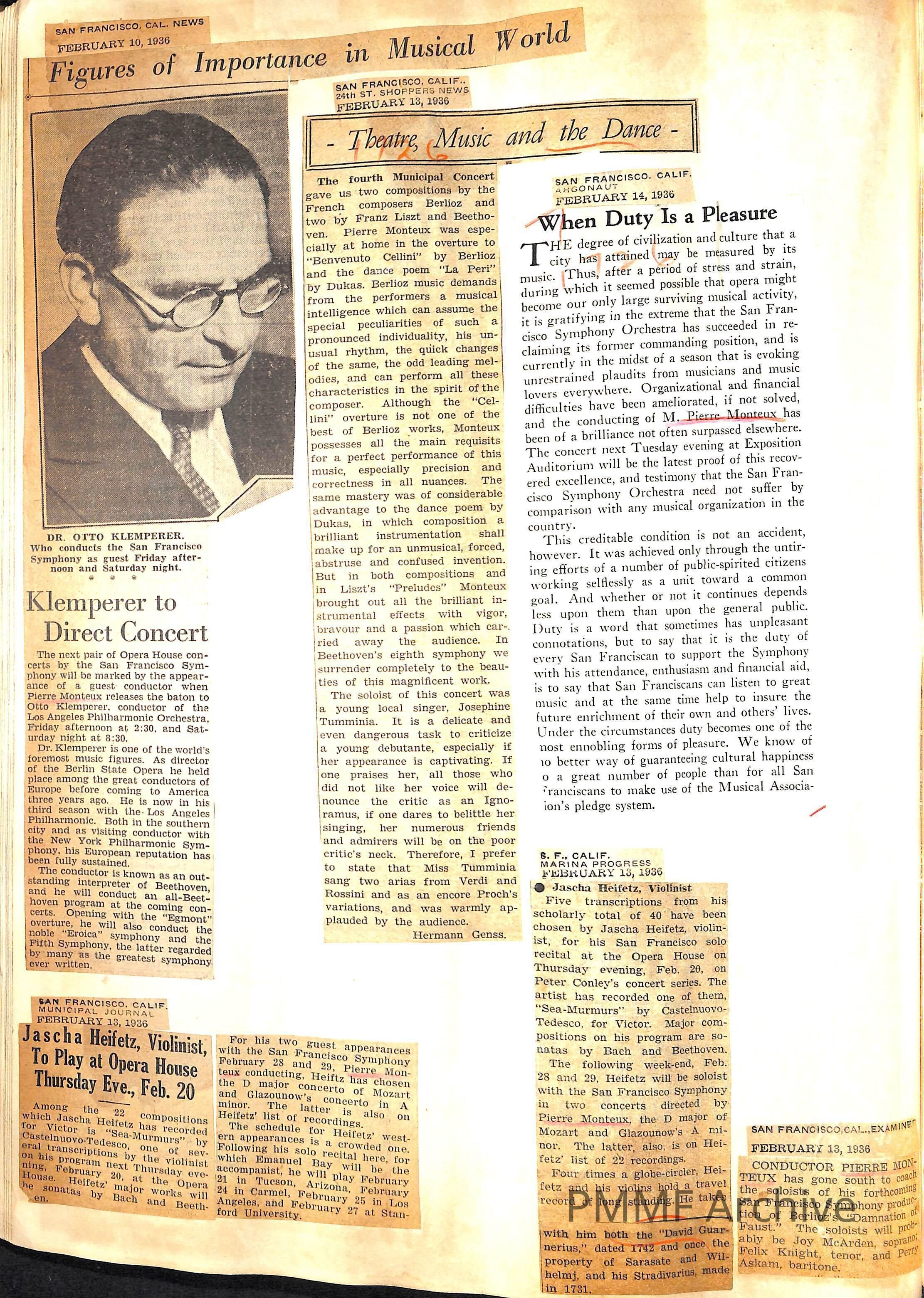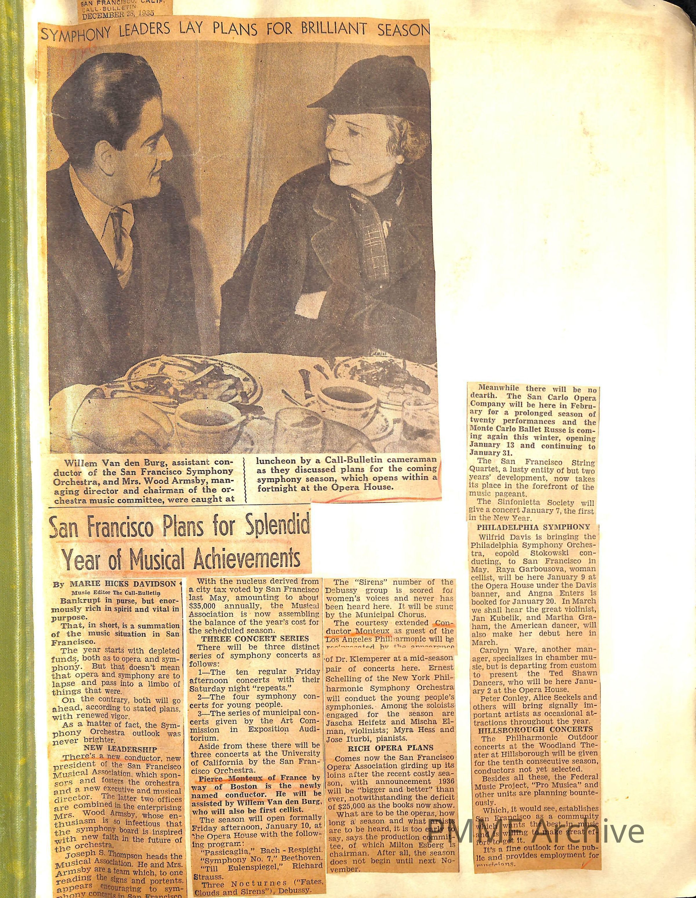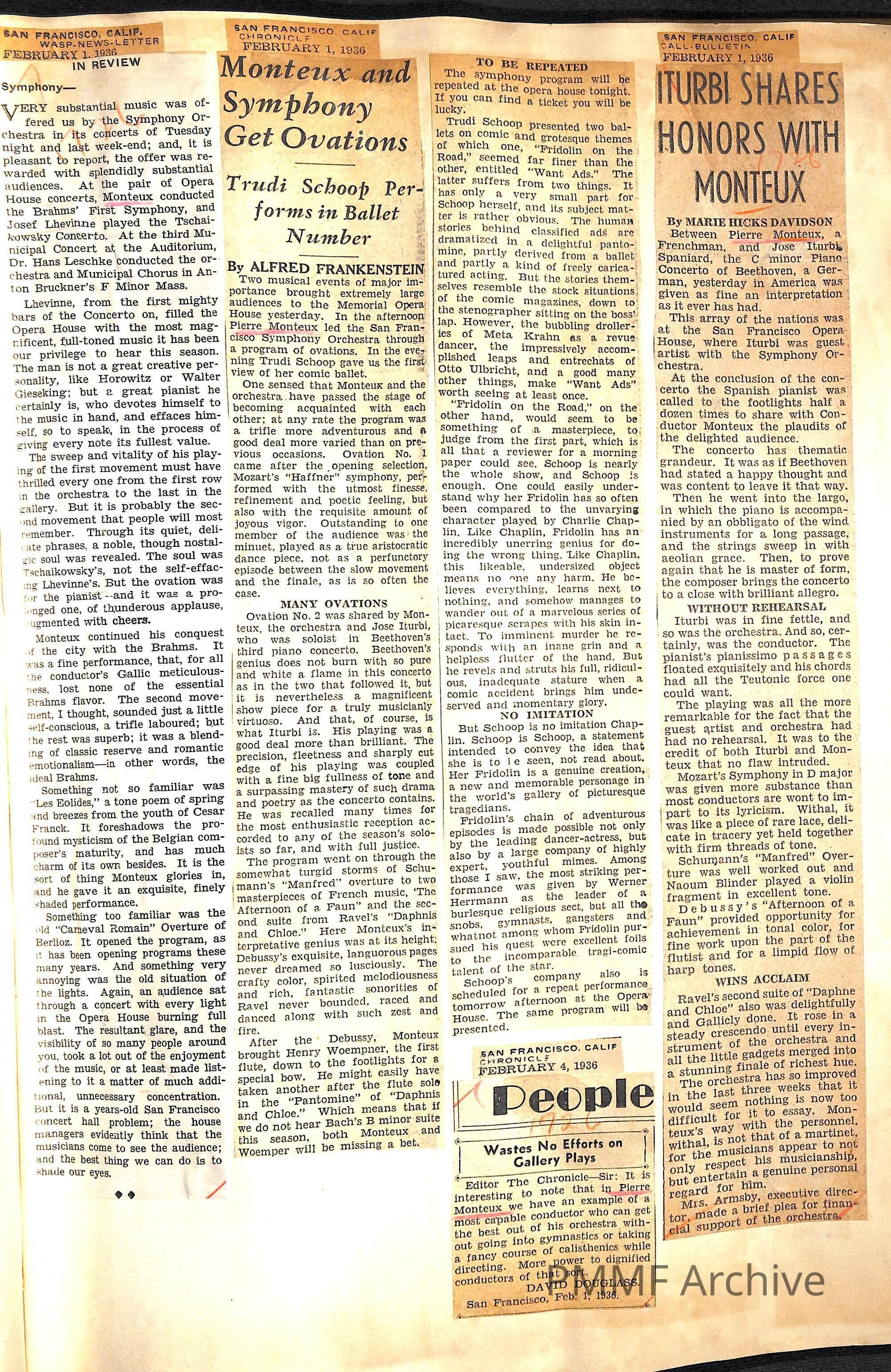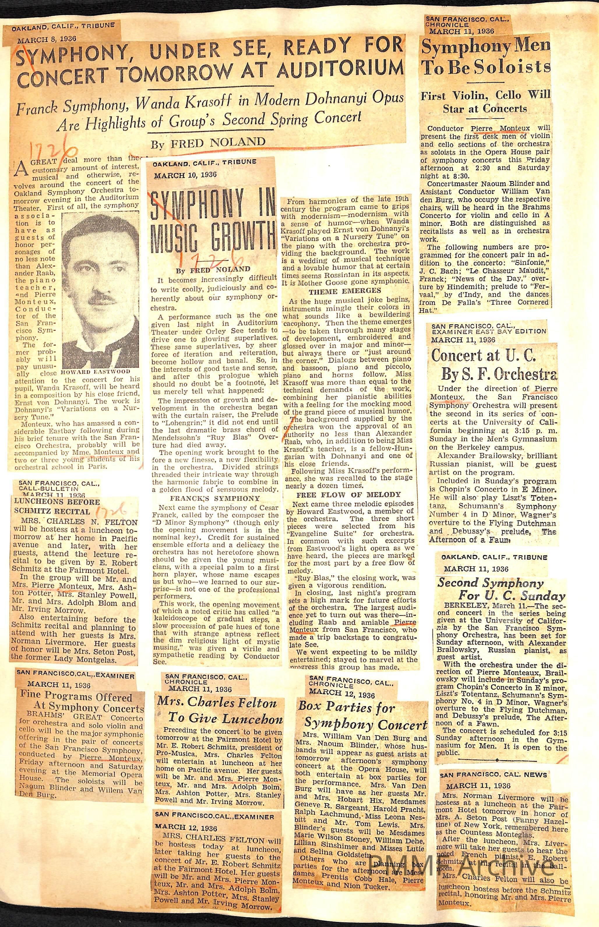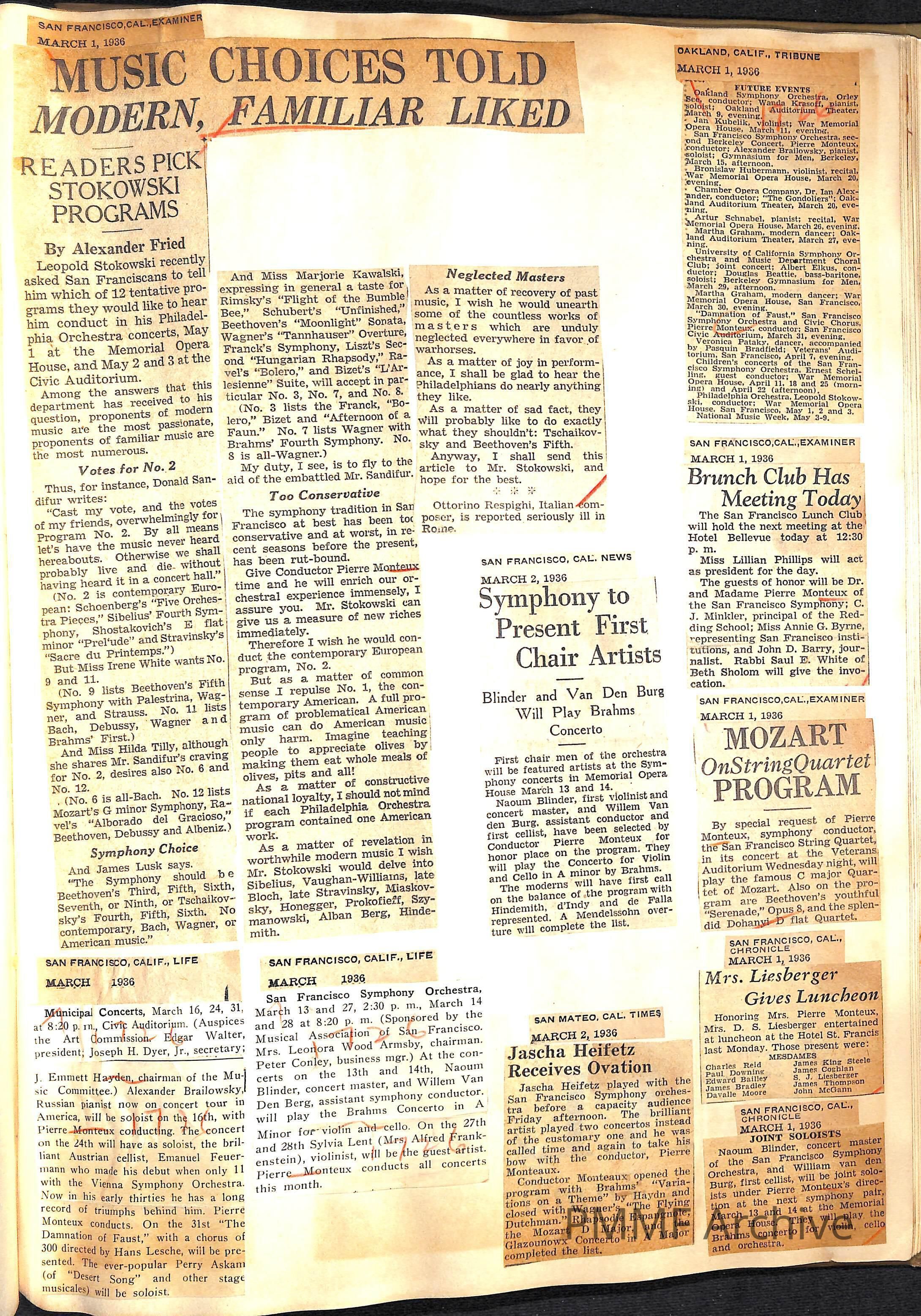 Scrapbook created by Doris Monteux of newspaper articles from 1935-1936 related to the first year of Monteux conducting the San Francisco Symphony Orchestra.