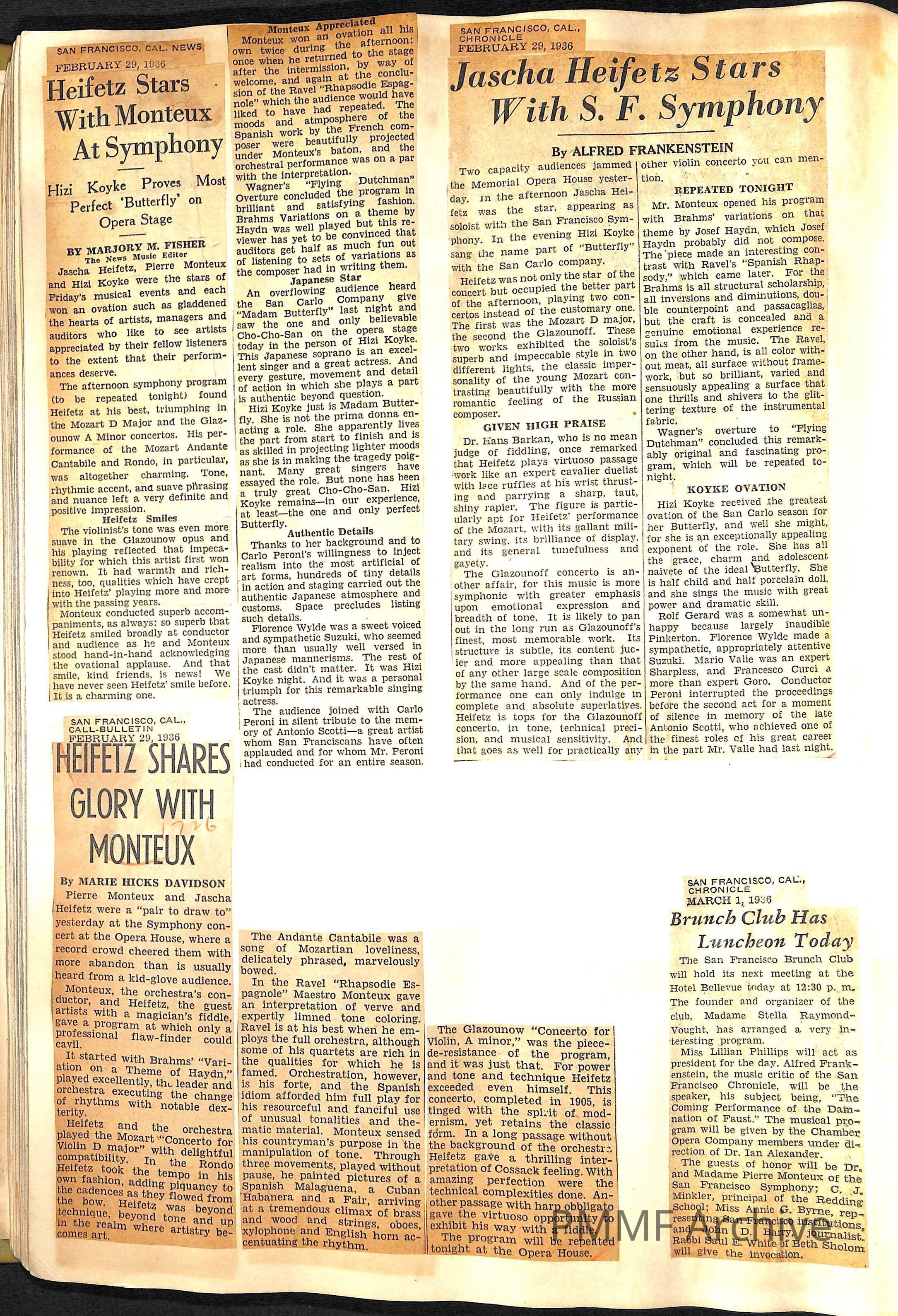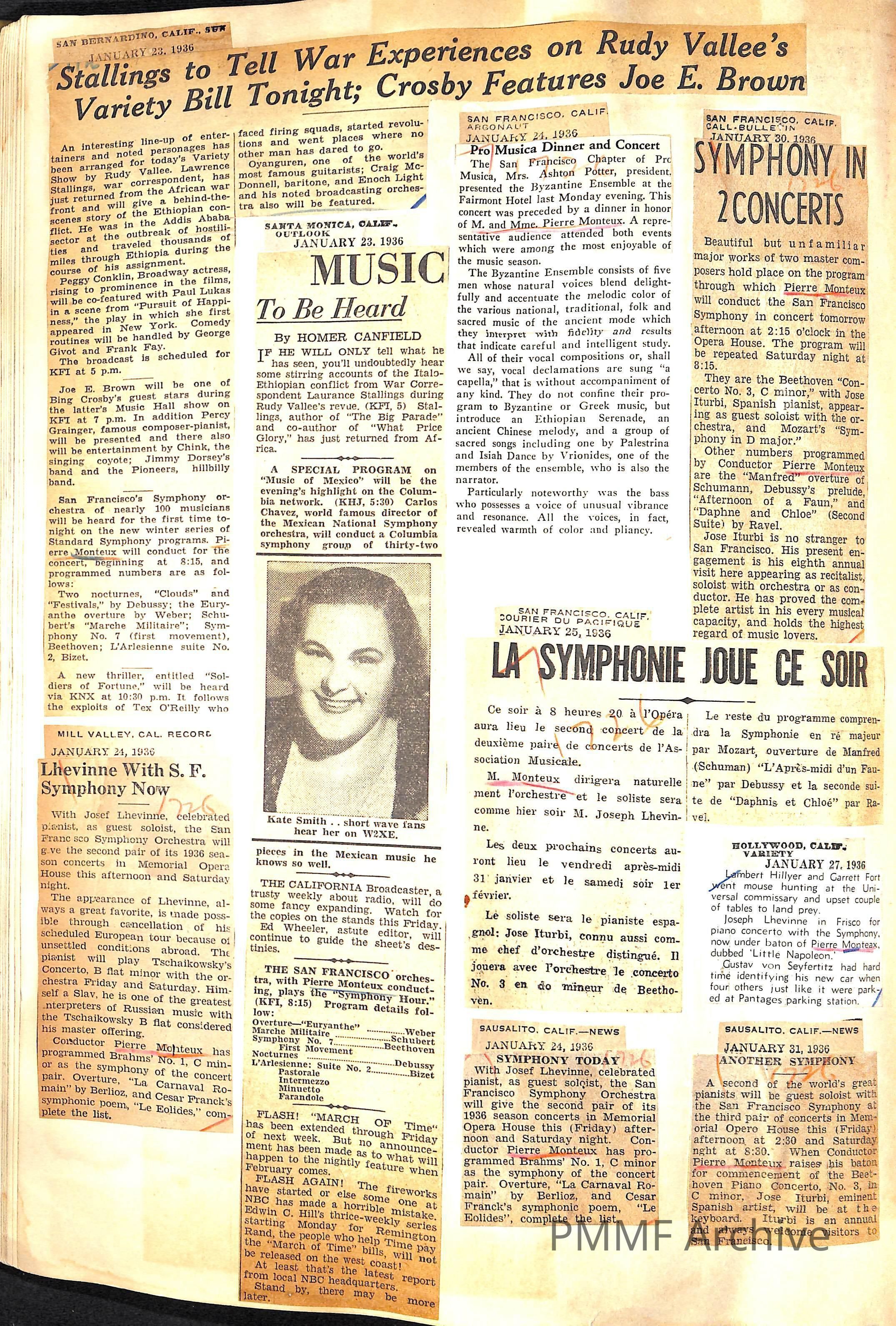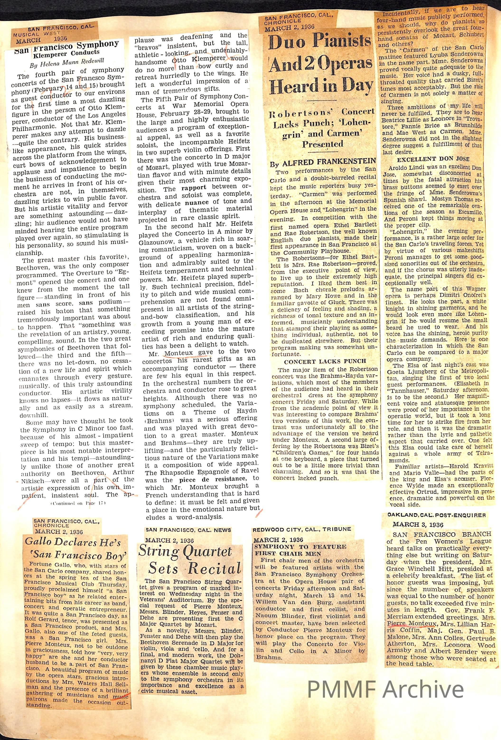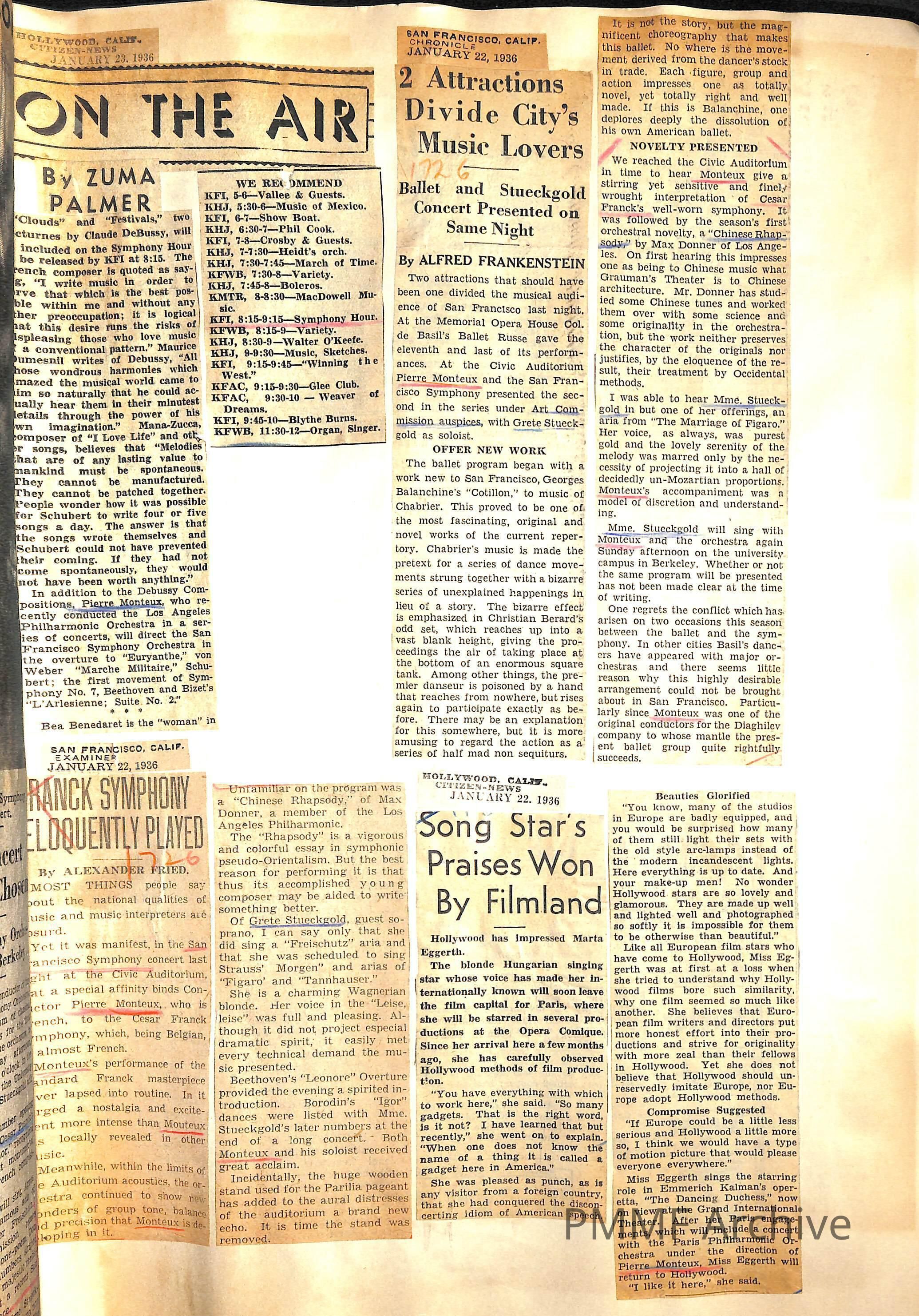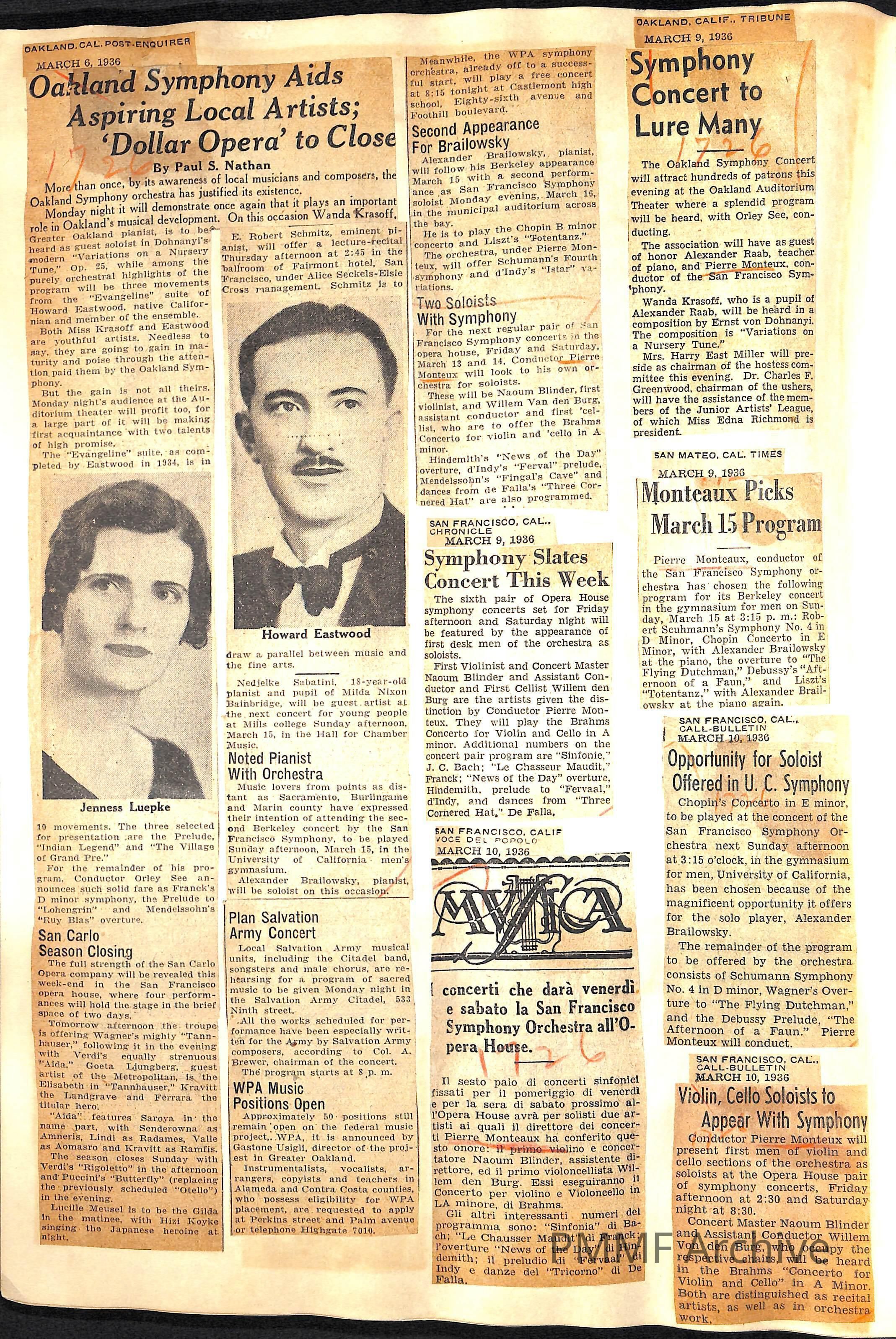 Scrapbook created by Doris Monteux of newspaper articles from 1935-1936 related to the first year of Monteux conducting the San Francisco Symphony Orchestra.