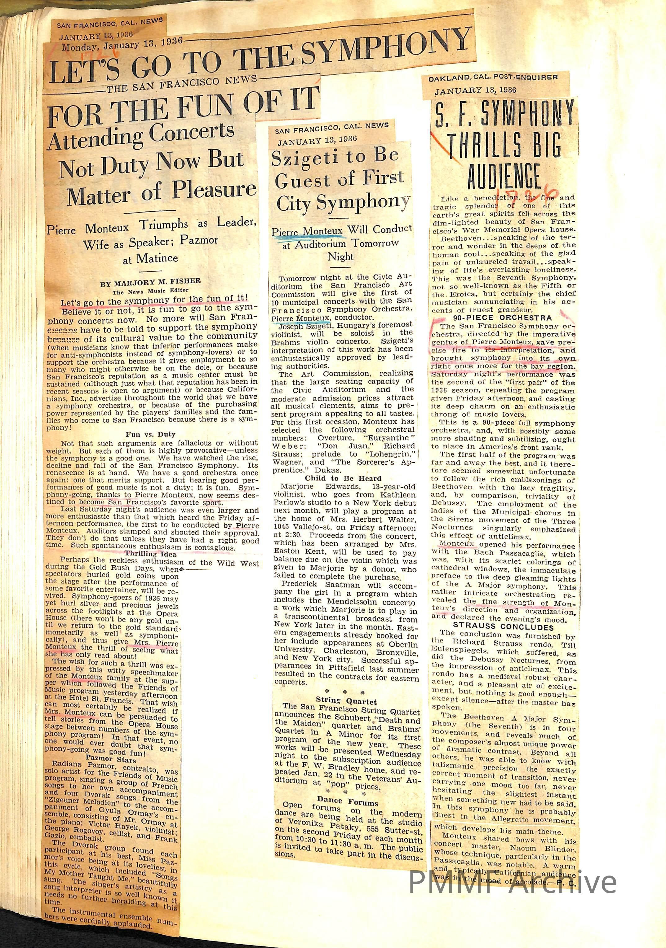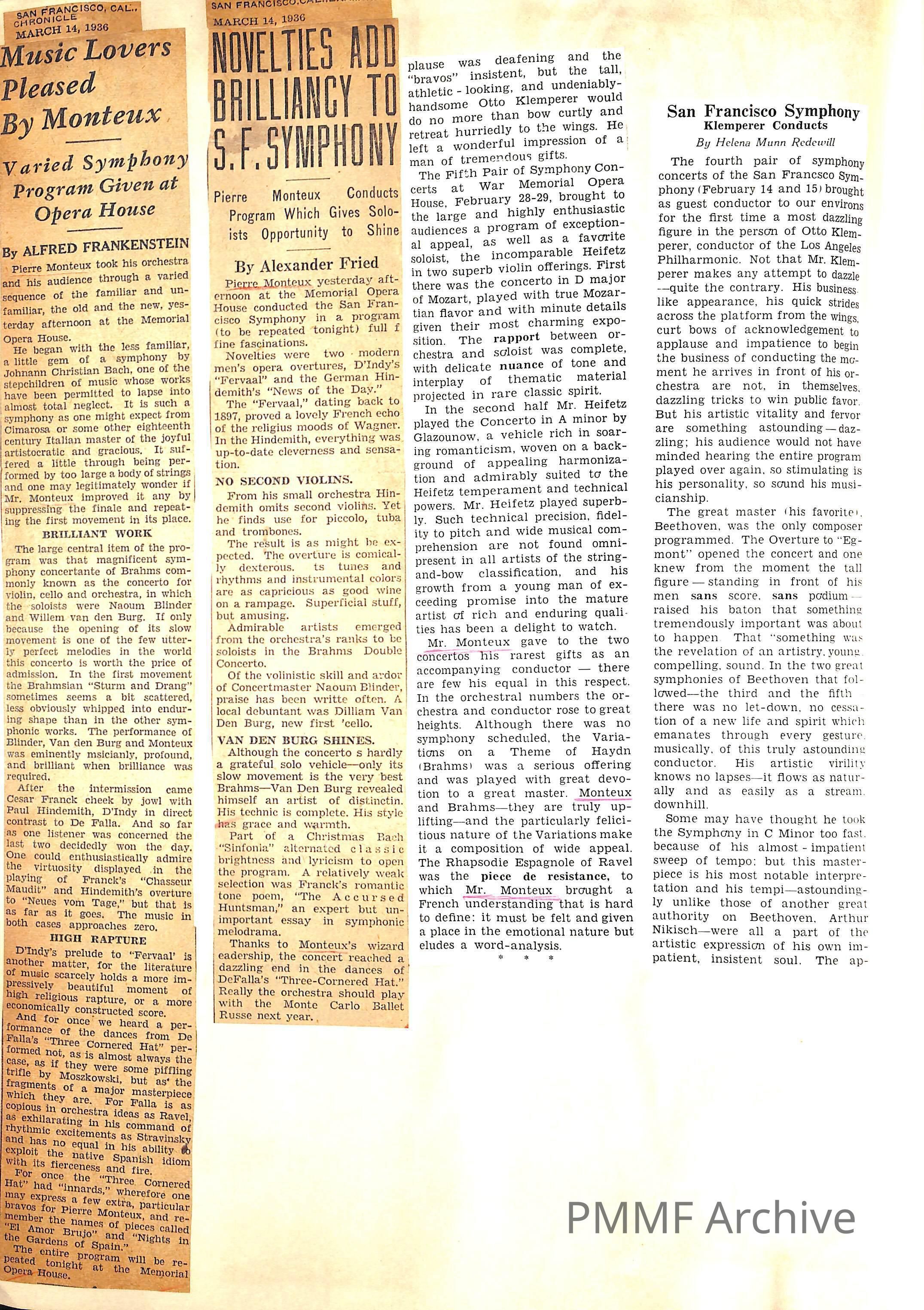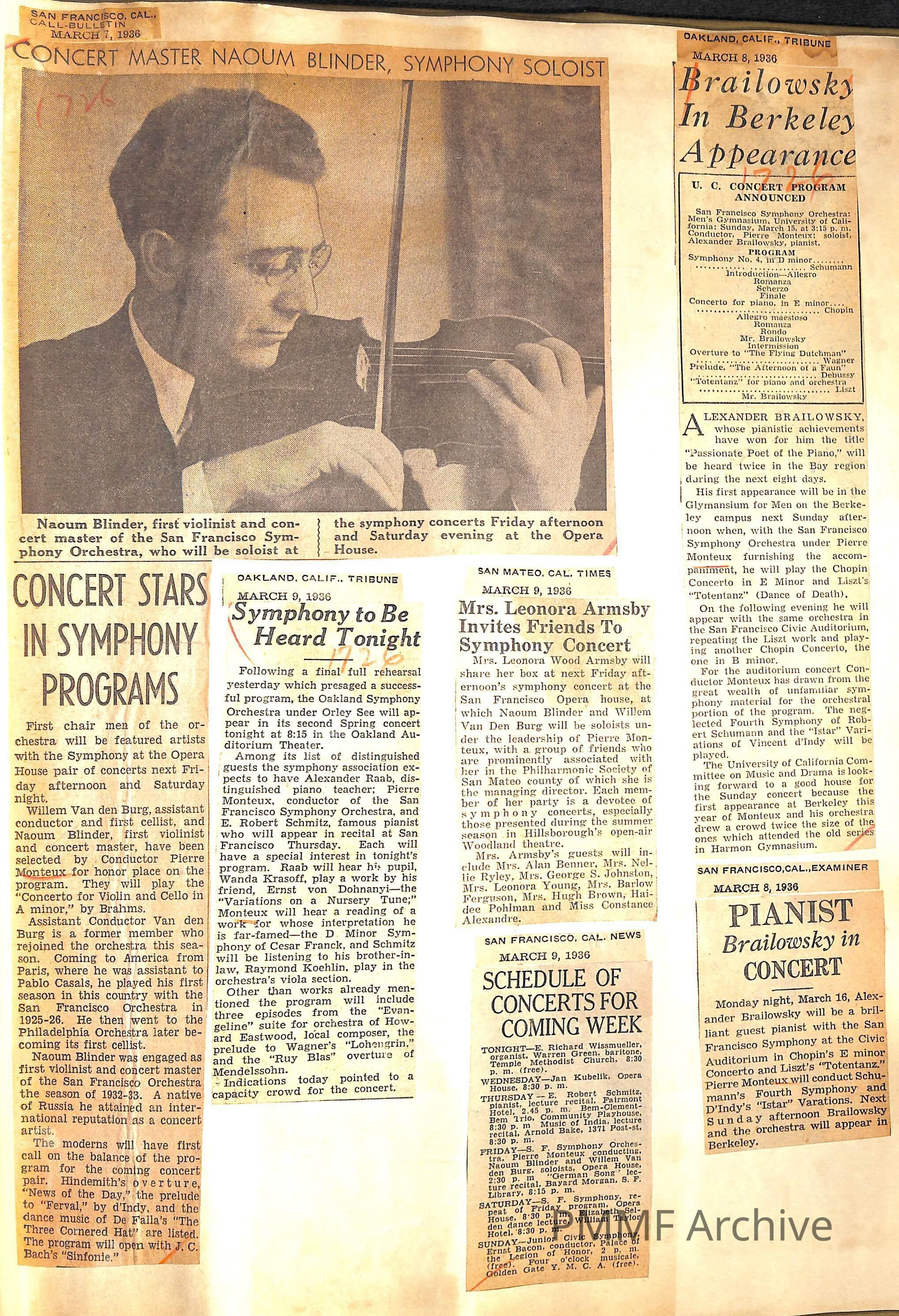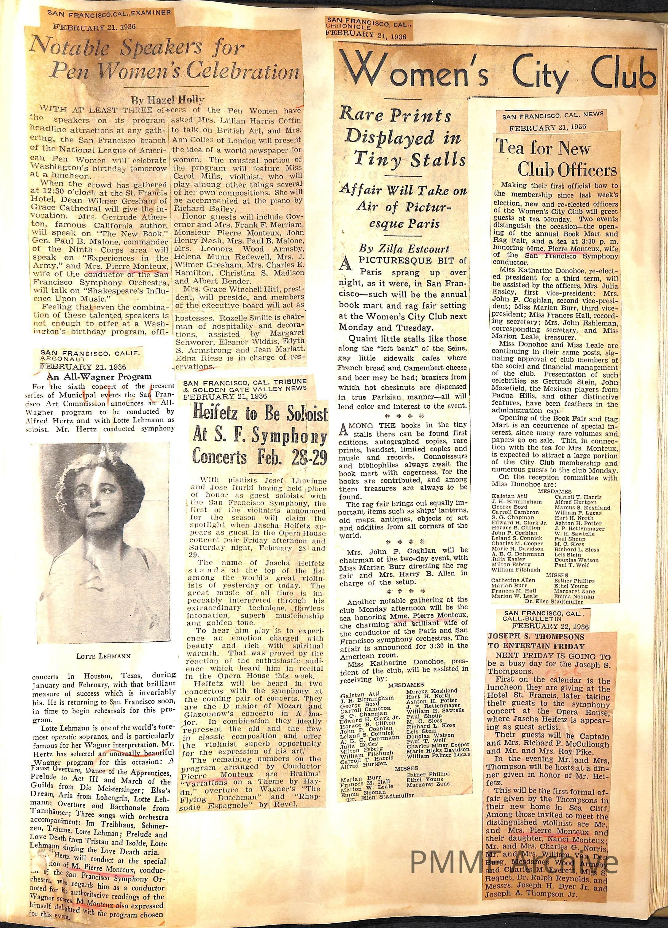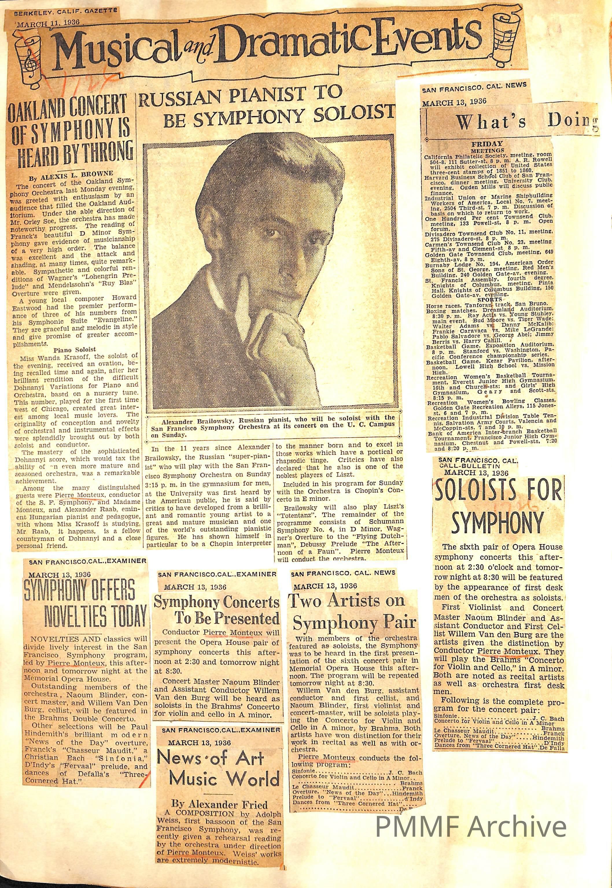 Scrapbook created by Doris Monteux of newspaper articles from 1935-1936 related to the first year of Monteux conducting the San Francisco Symphony Orchestra.