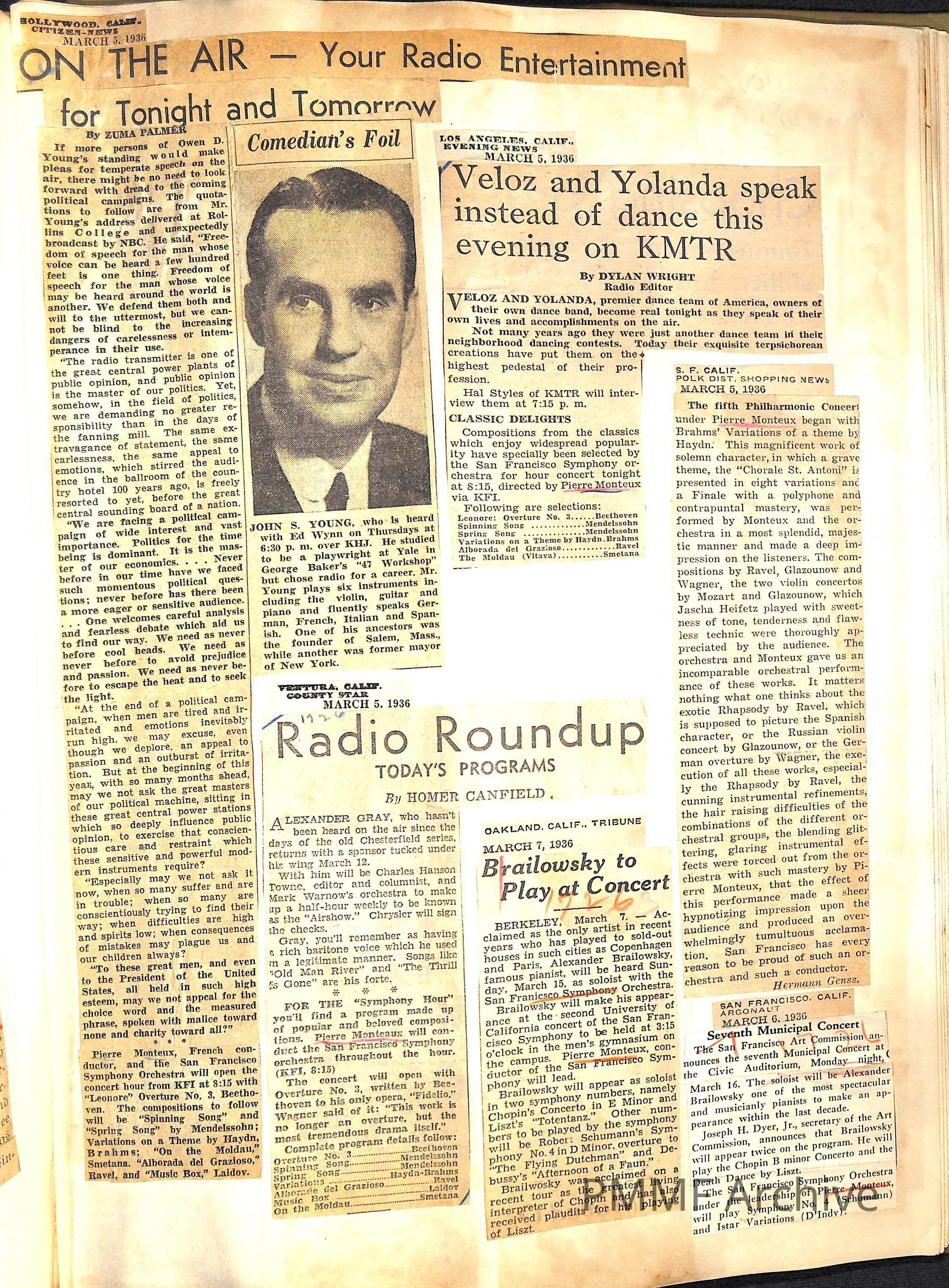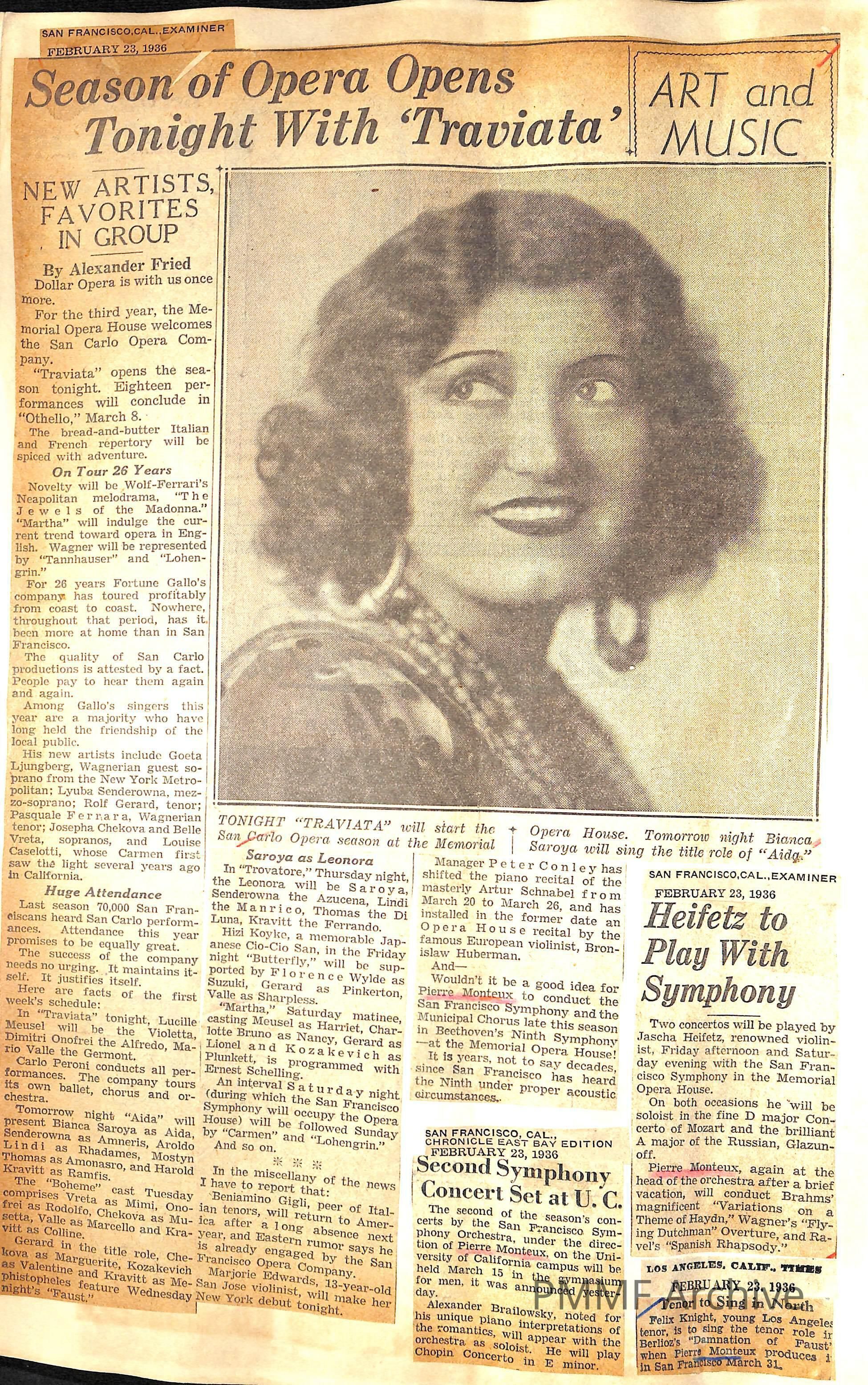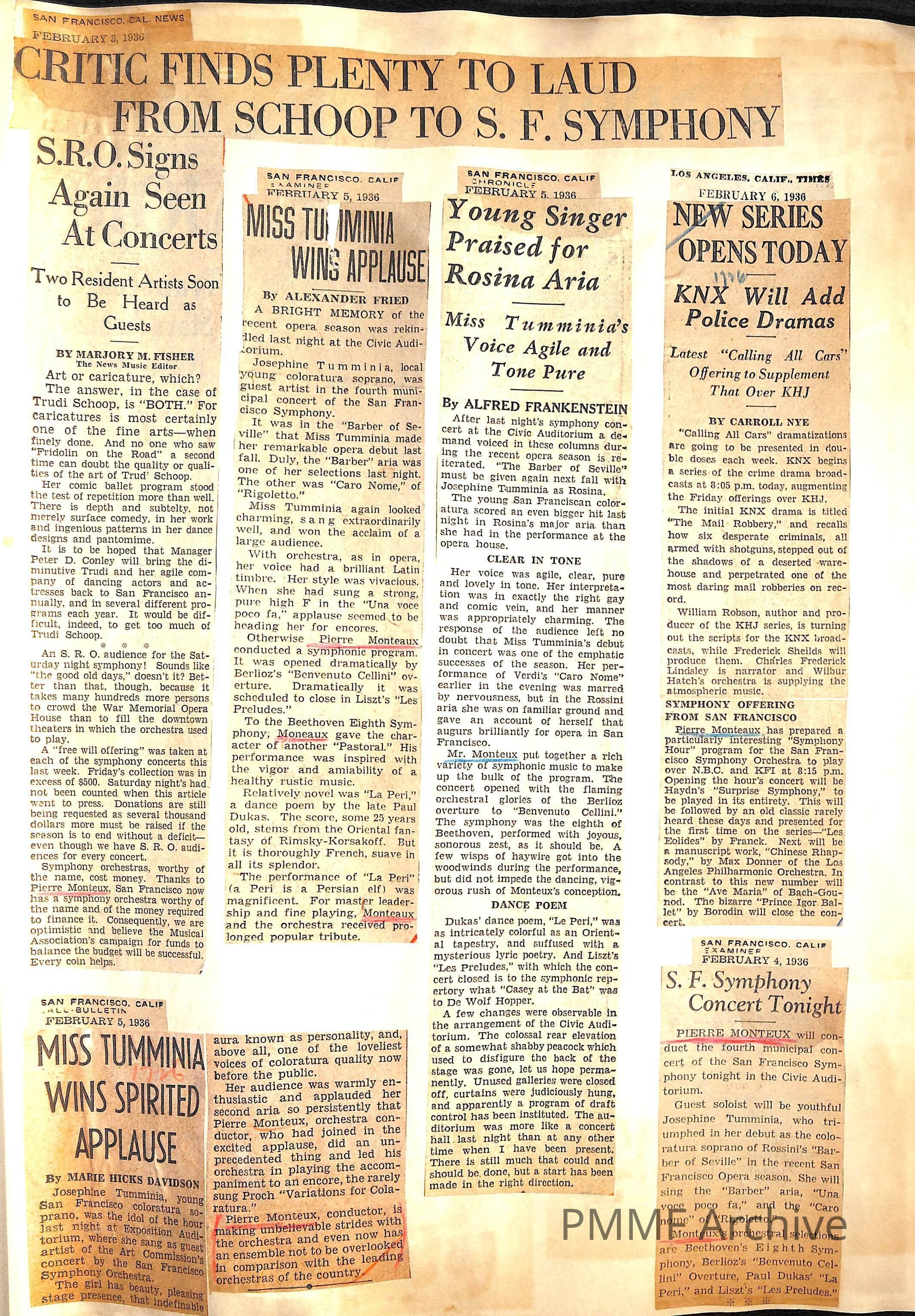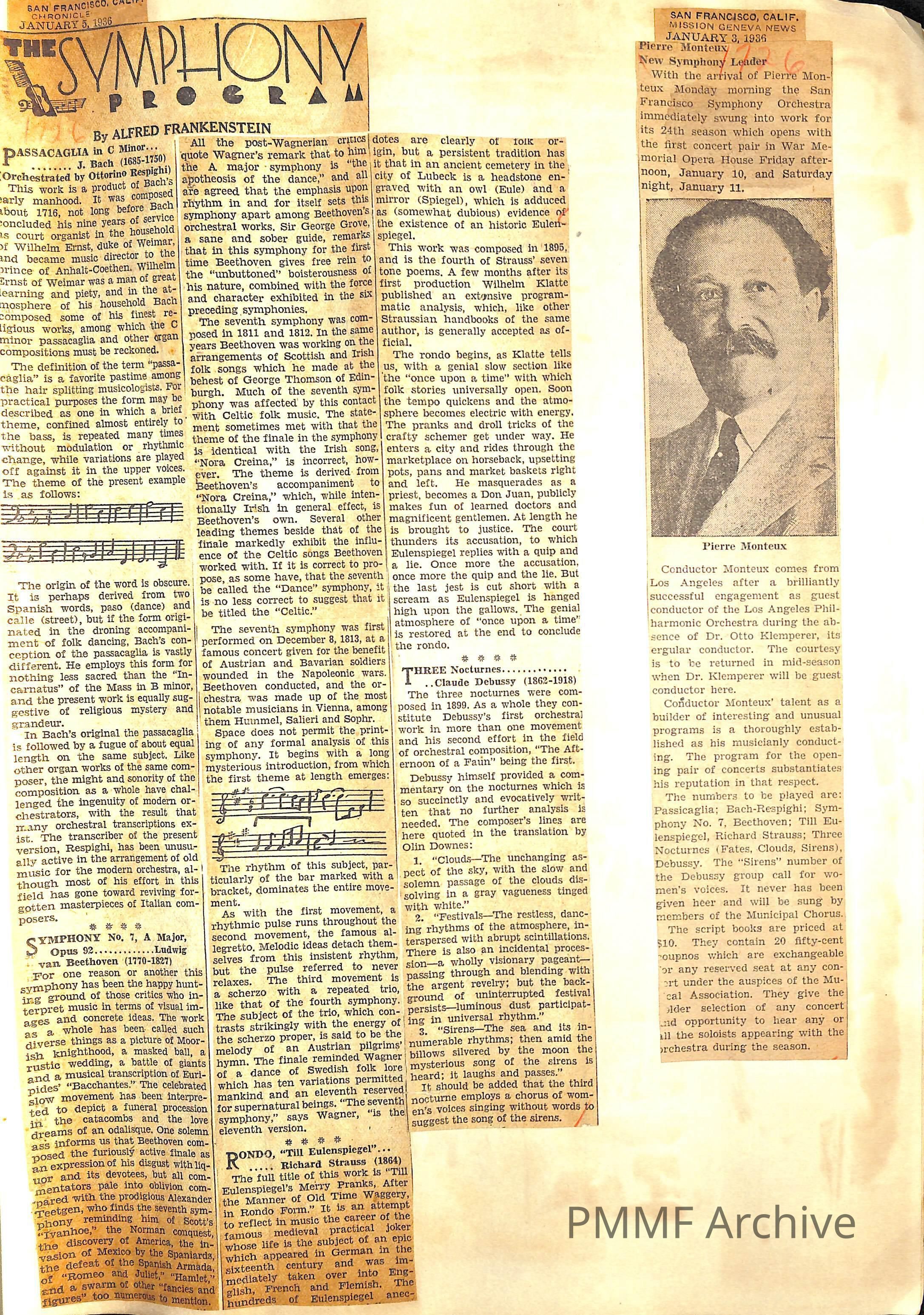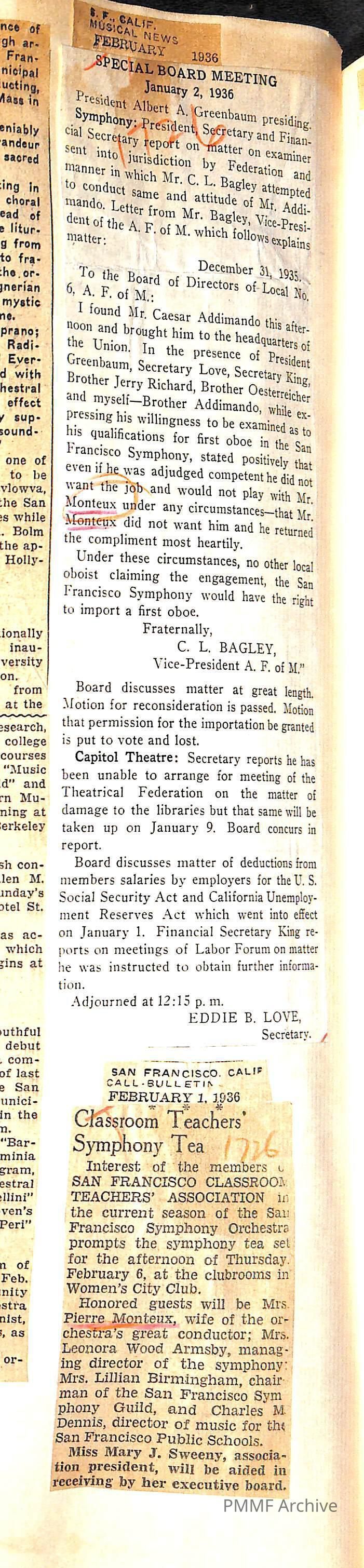 Scrapbook created by Doris Monteux of newspaper articles from 1935-1936 related to the first year of Monteux conducting the San Francisco Symphony Orchestra.