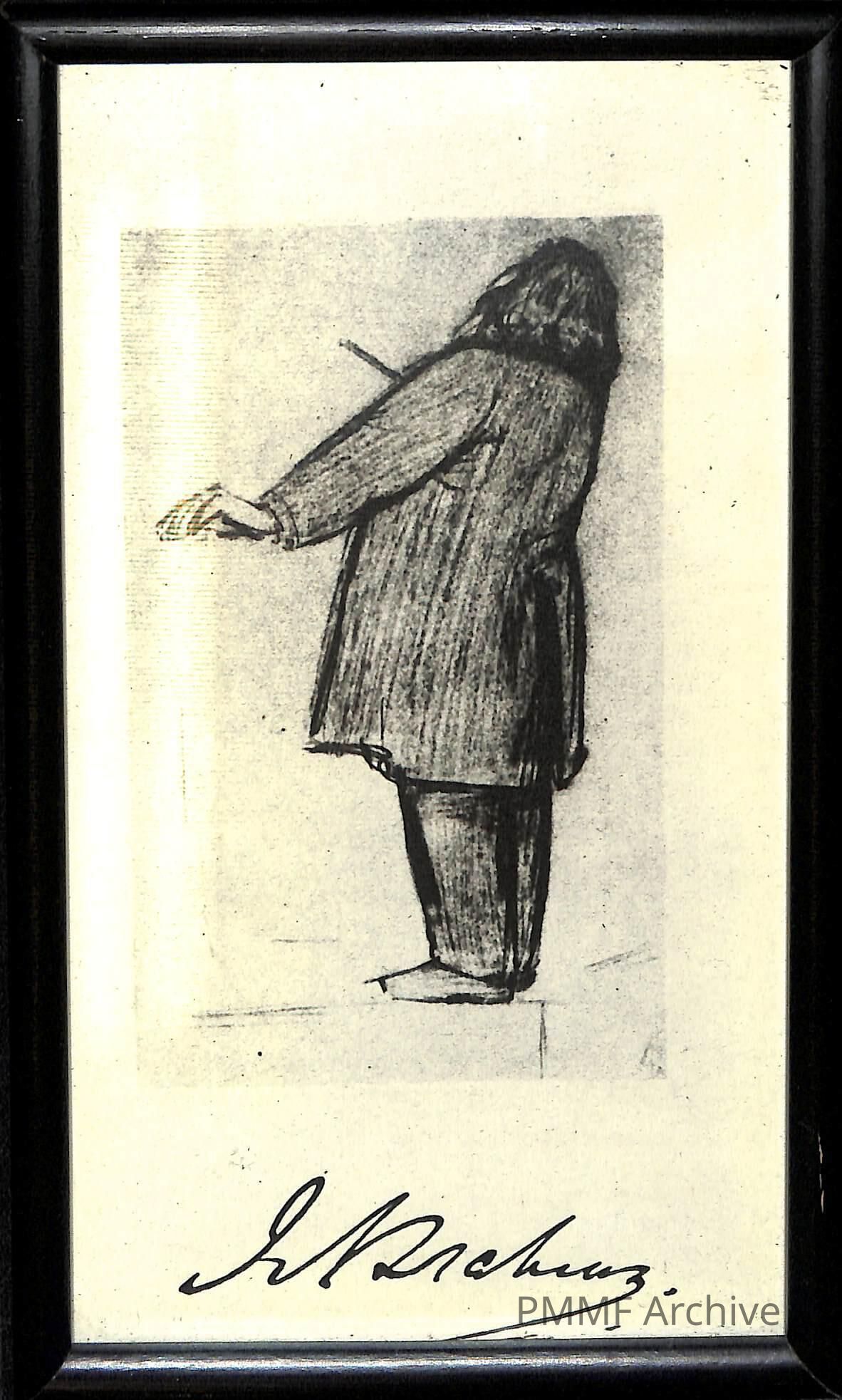 Framed photocopy of charcoal sketch and signature of Johannes Brahms from the left, conducting with baton in hand.