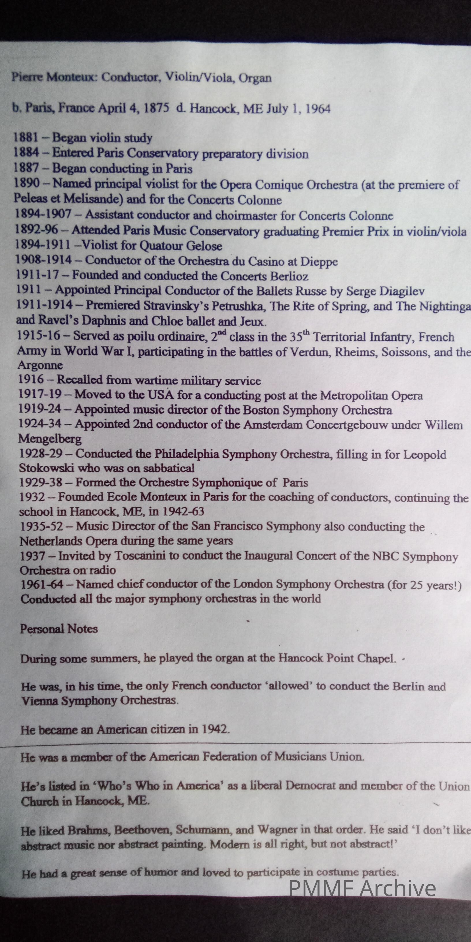 Time line/Resume: Pierre Monteux: Conductor, Violin/Viola, Organ