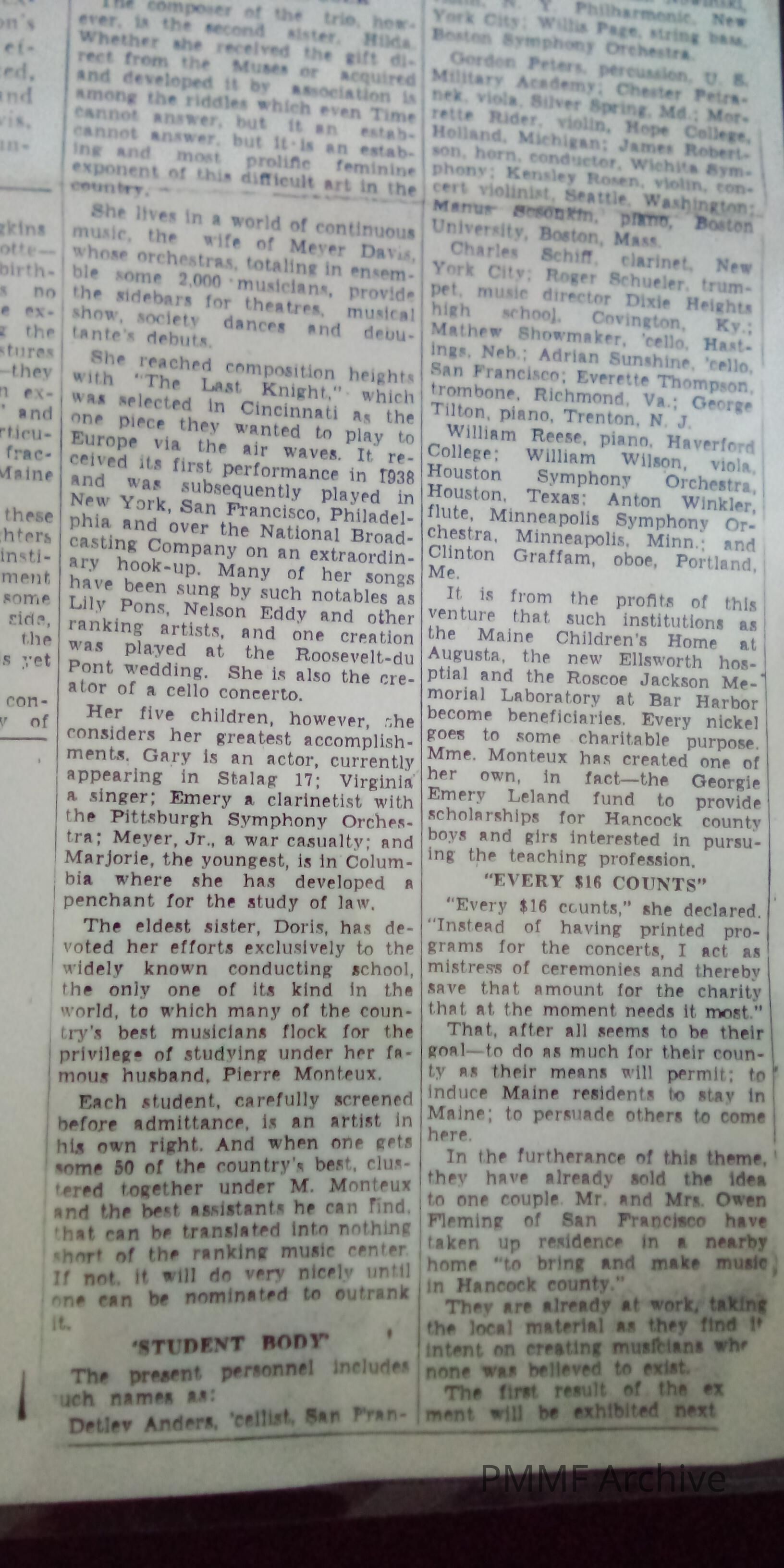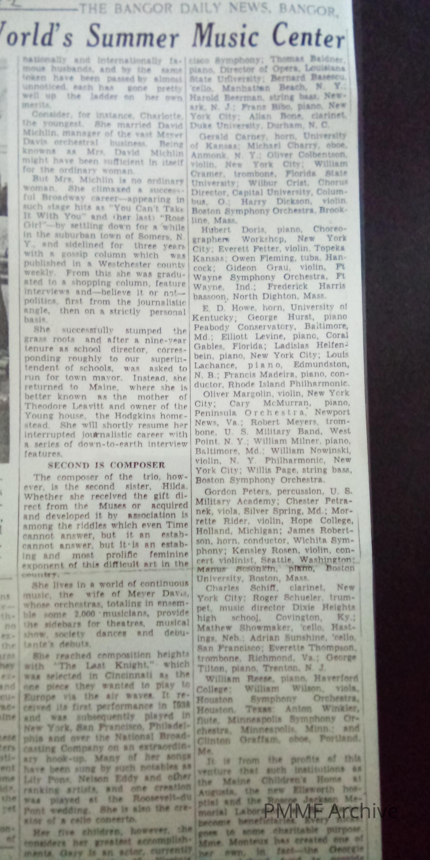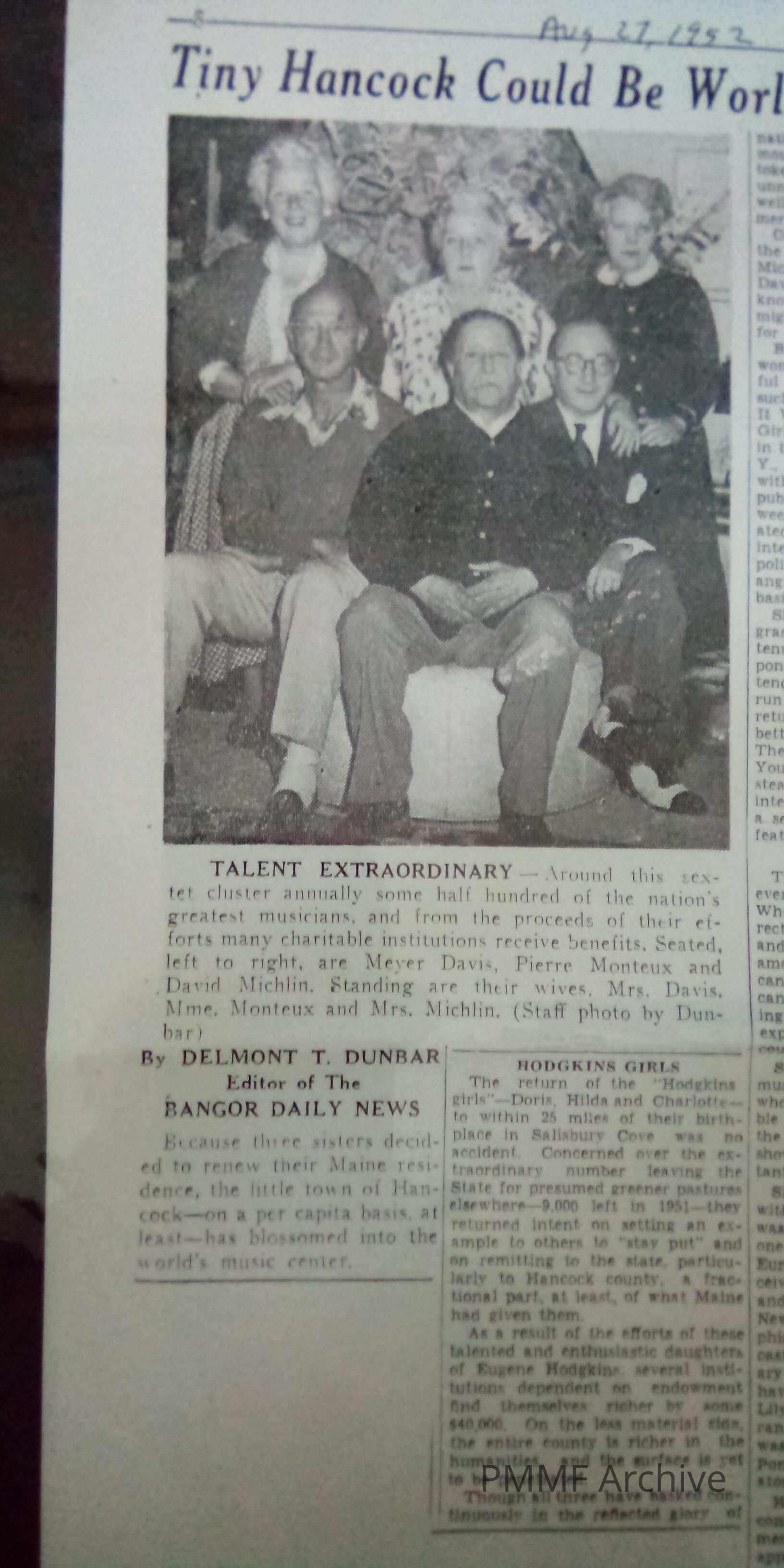 Tiny Hancock Could be World's Summer Music Center (Bangor Daily News 8/1952)