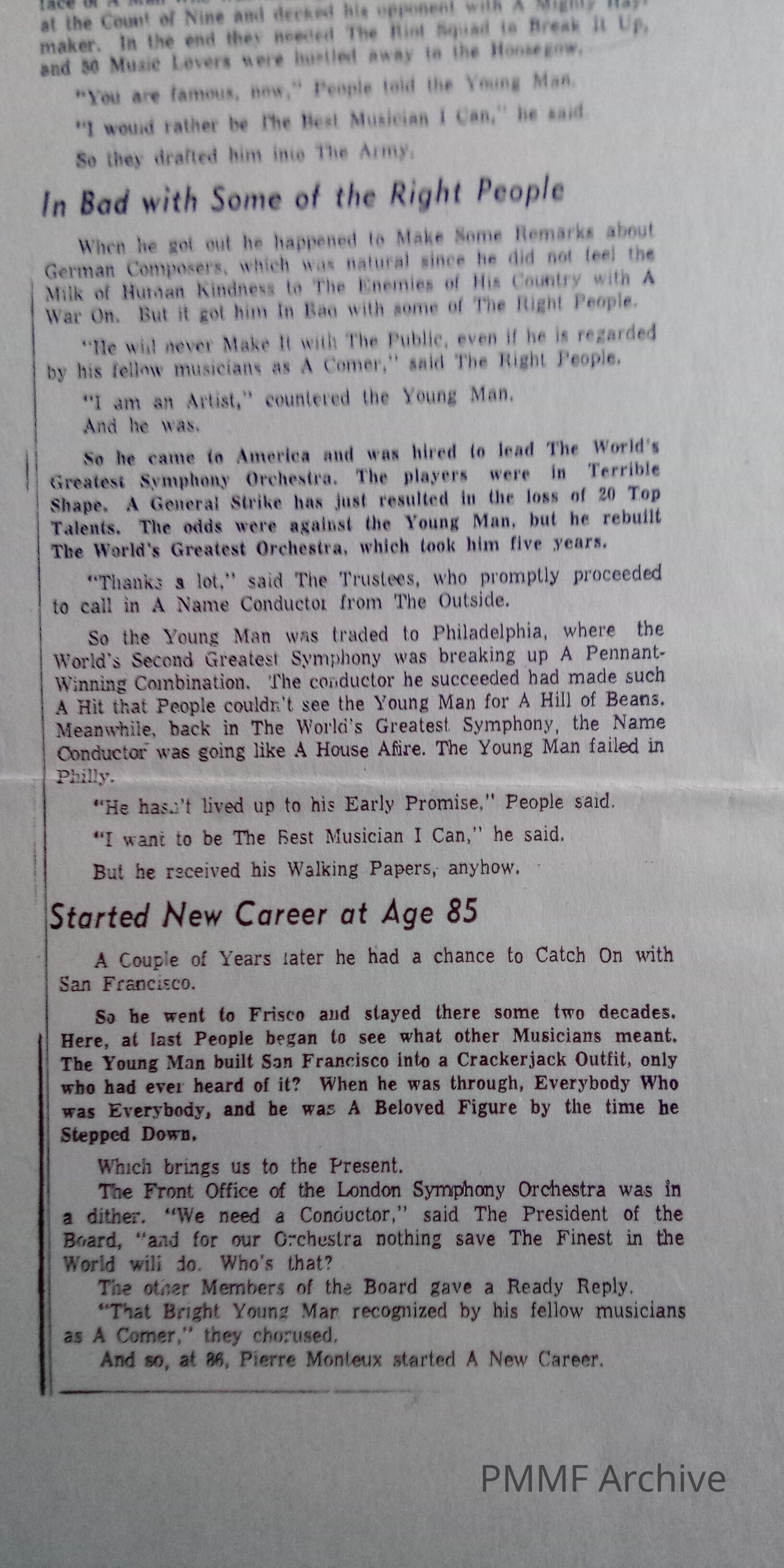 Tongue in cheek essay about Monteux starting new career in London at 85 [Source unknown]