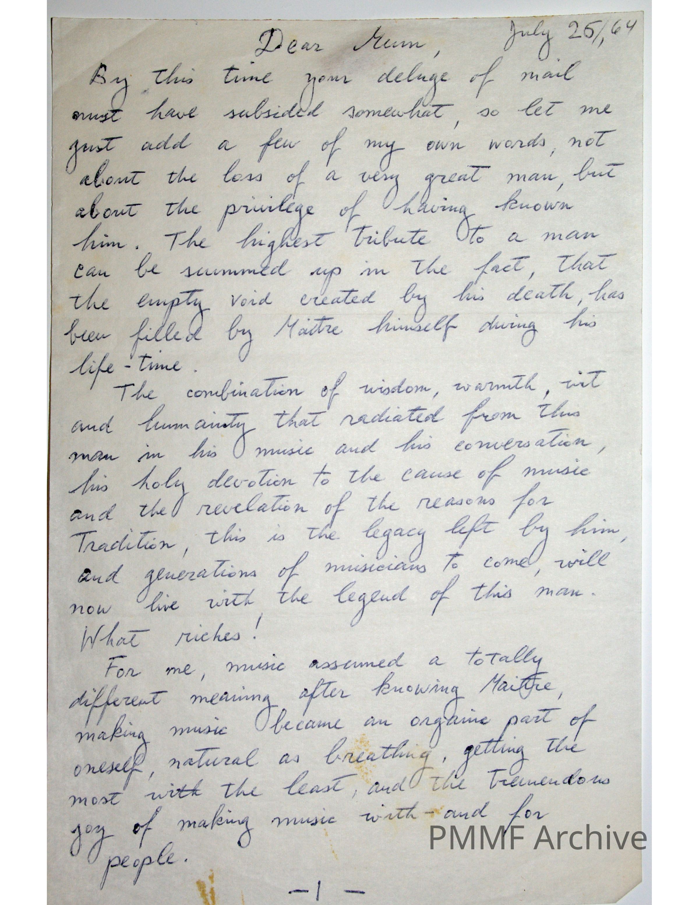 1964 letter to Doris Monteux ("Mum") following Pierre Monteux's death