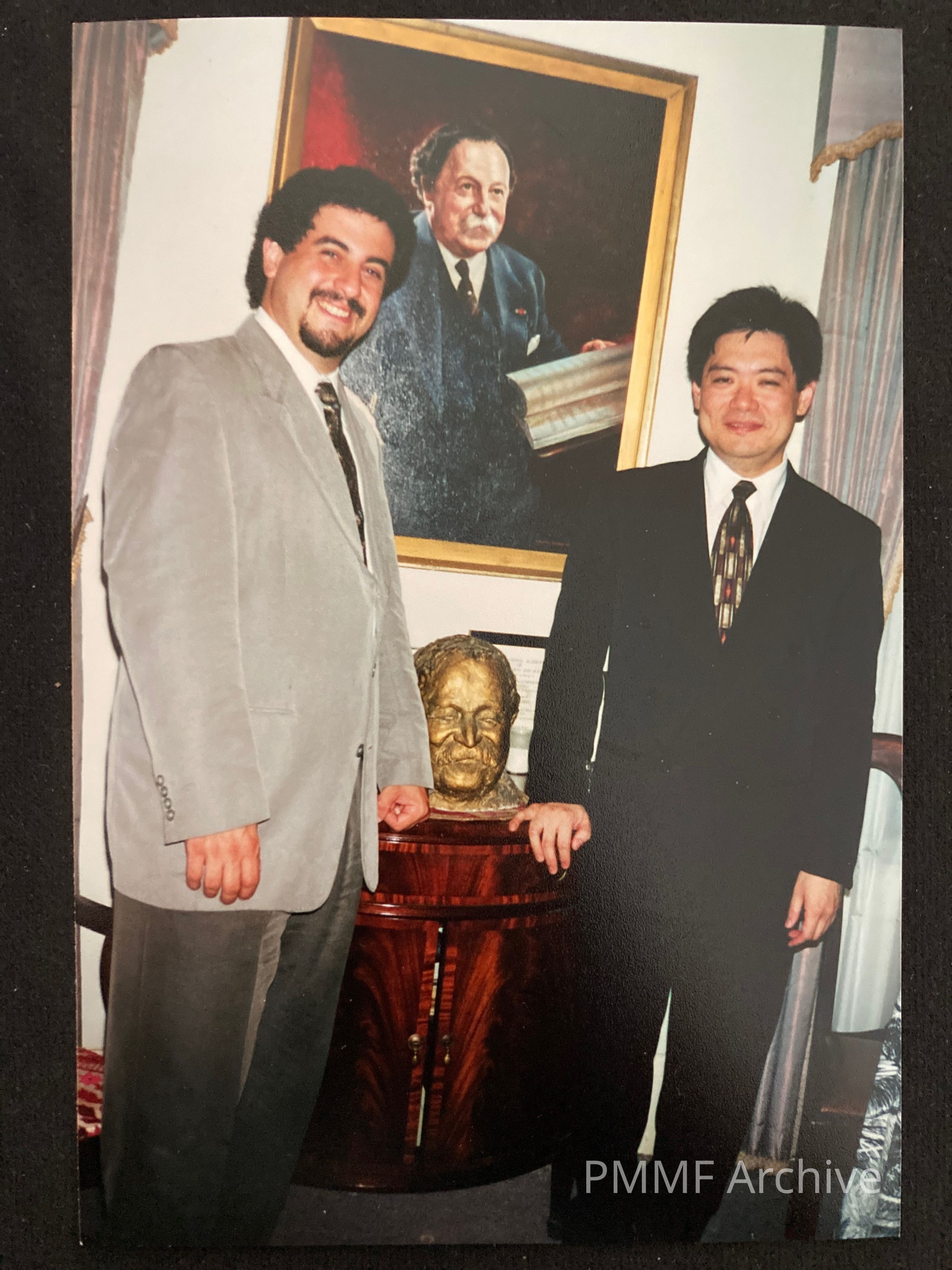 Anthony LaGruth and Michael Jinbo in front of Monteux Portrait and bust Aug 2000