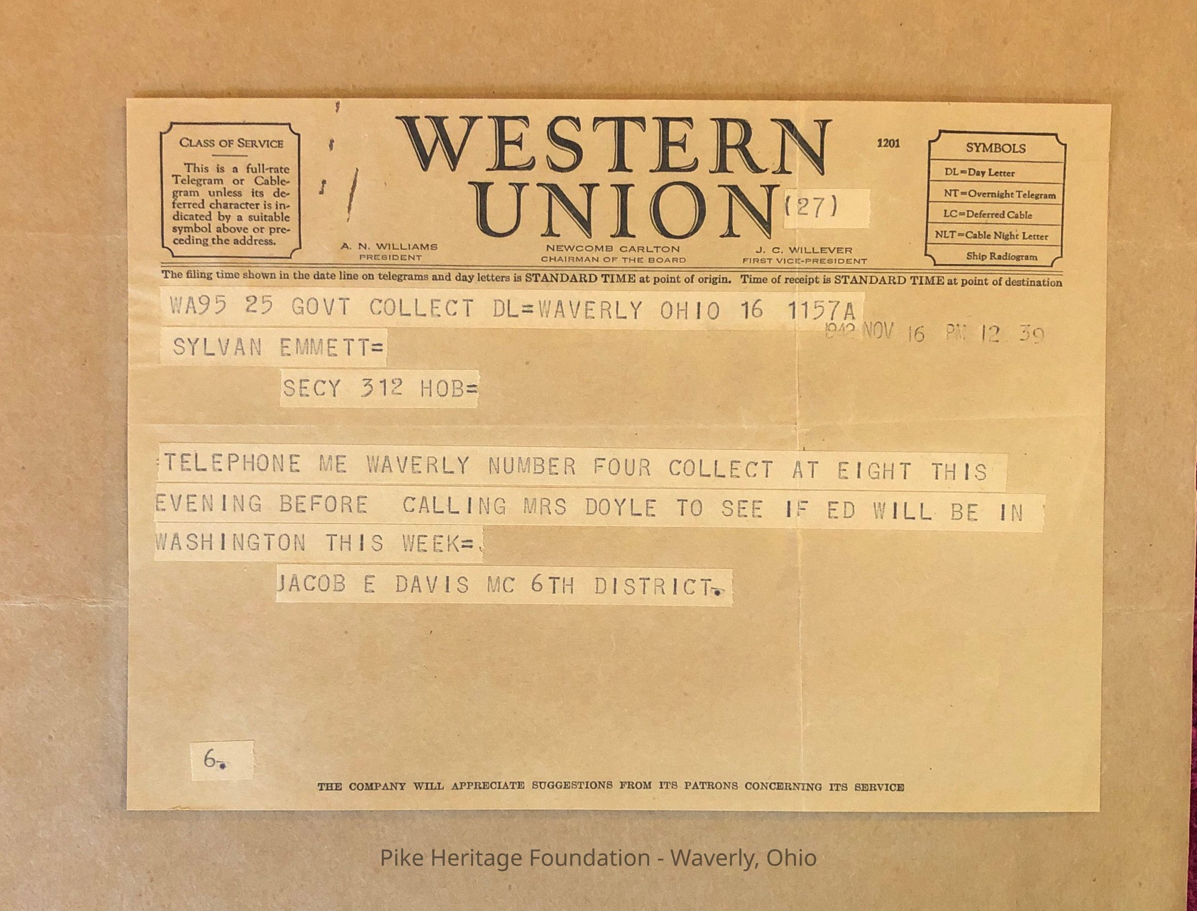Western Union Telegraph from U. S. Congressman Jacob E. Davis - 1942Entry/Object ID
