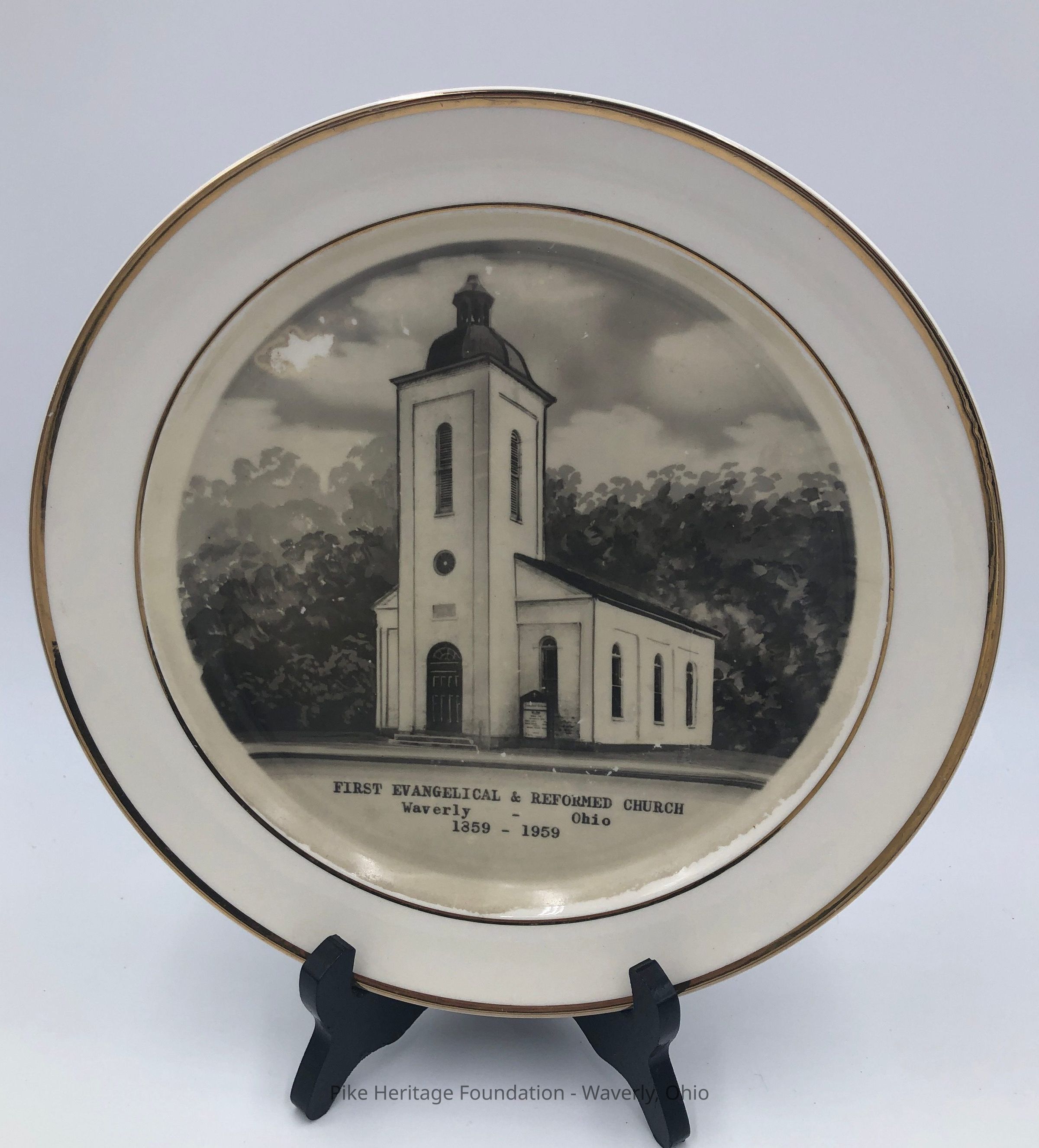 100th anniversary commemorative plate for the First Evangelical & Reformed Church located at 110 South Market Street in Waverly, Ohio. It now houses the Pike Heritage Museum.Acquisition