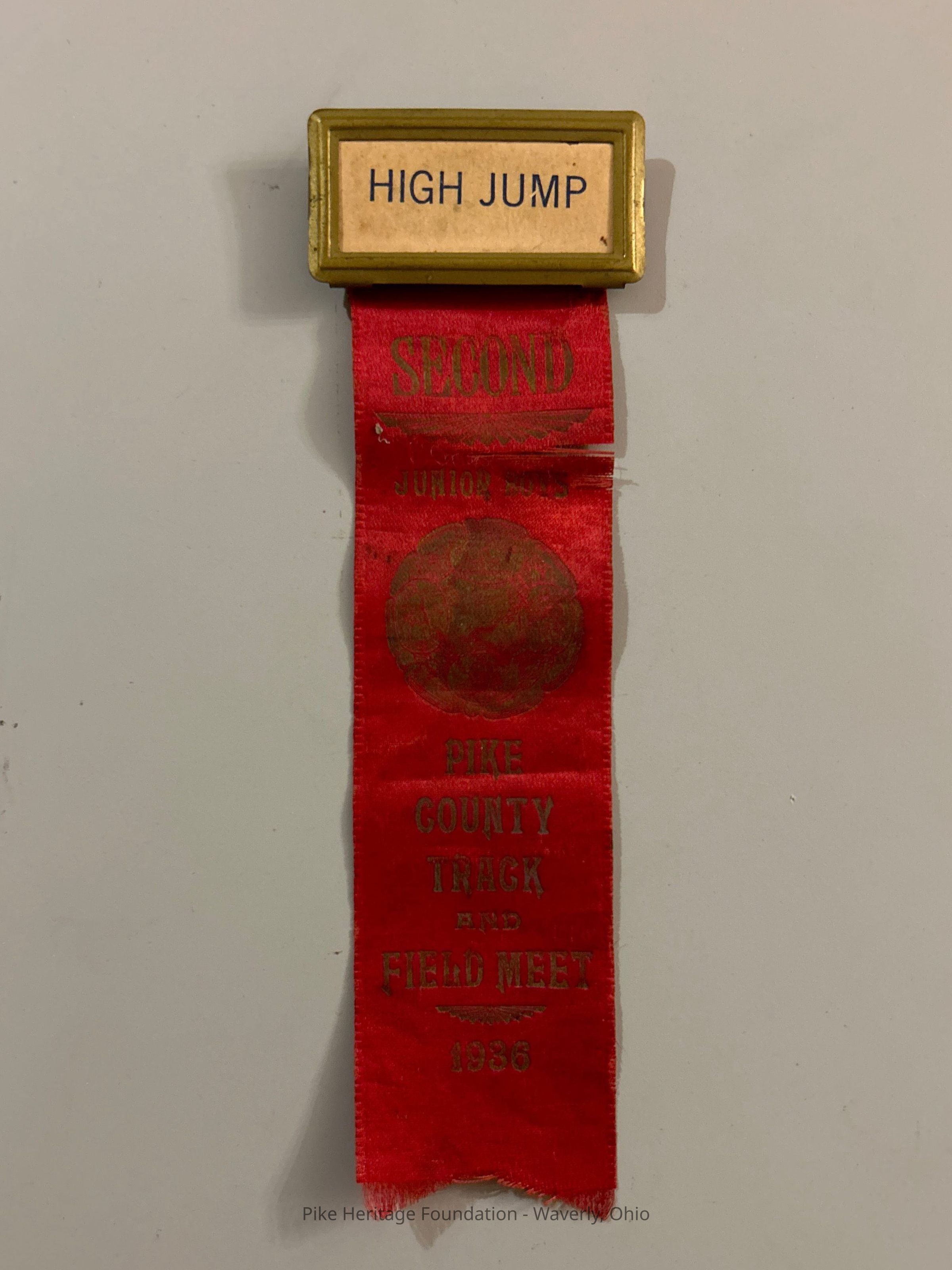 Second place ribbon one by Carl Hartley Senior. At the 1936 Pike County, Ohio track and field meet.Collection