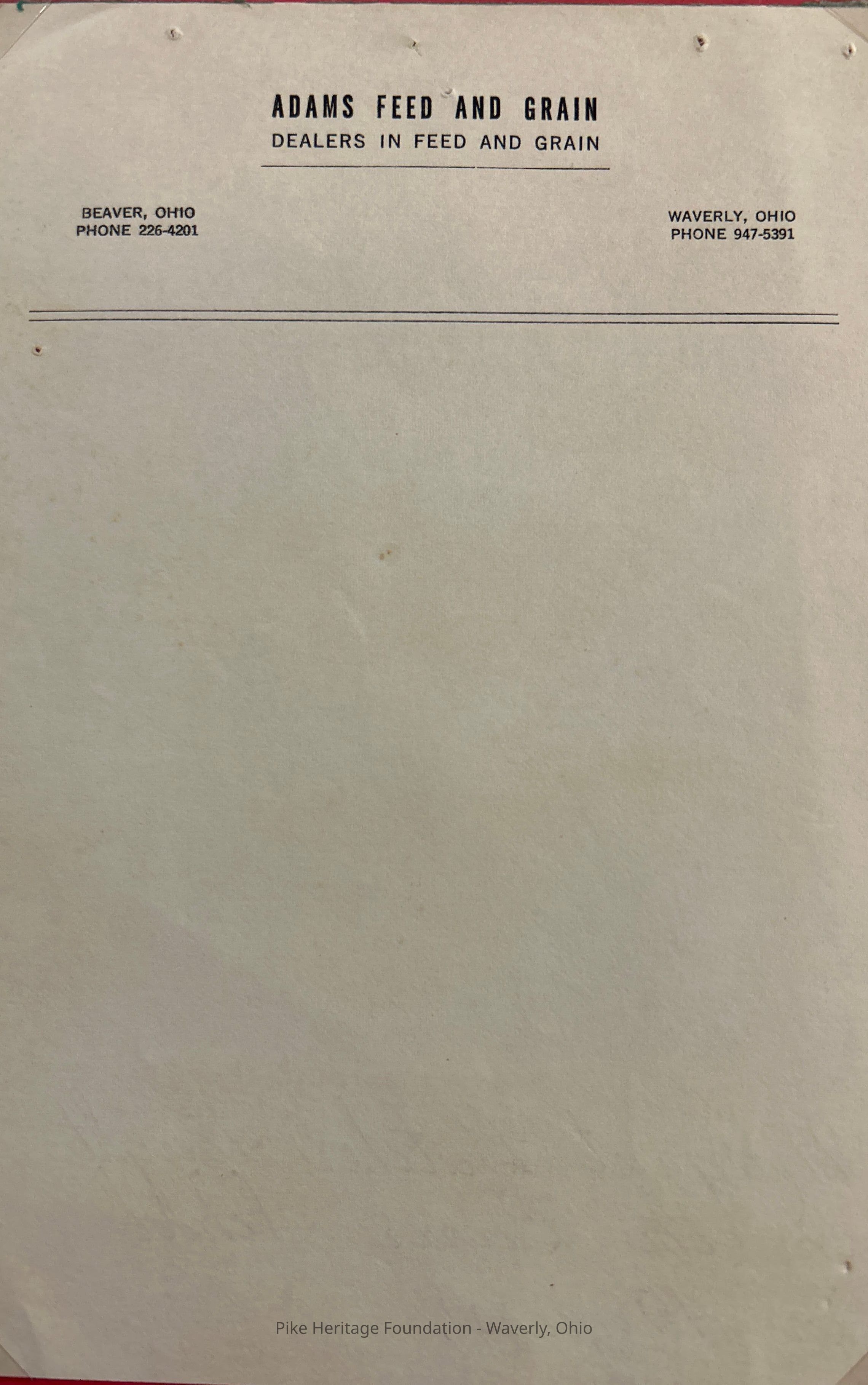 Stationary from Adams Feed & Grain. Though their office was located in Beaver, Ohio, their grain establishment was located in Waverly, Ohio.Collection