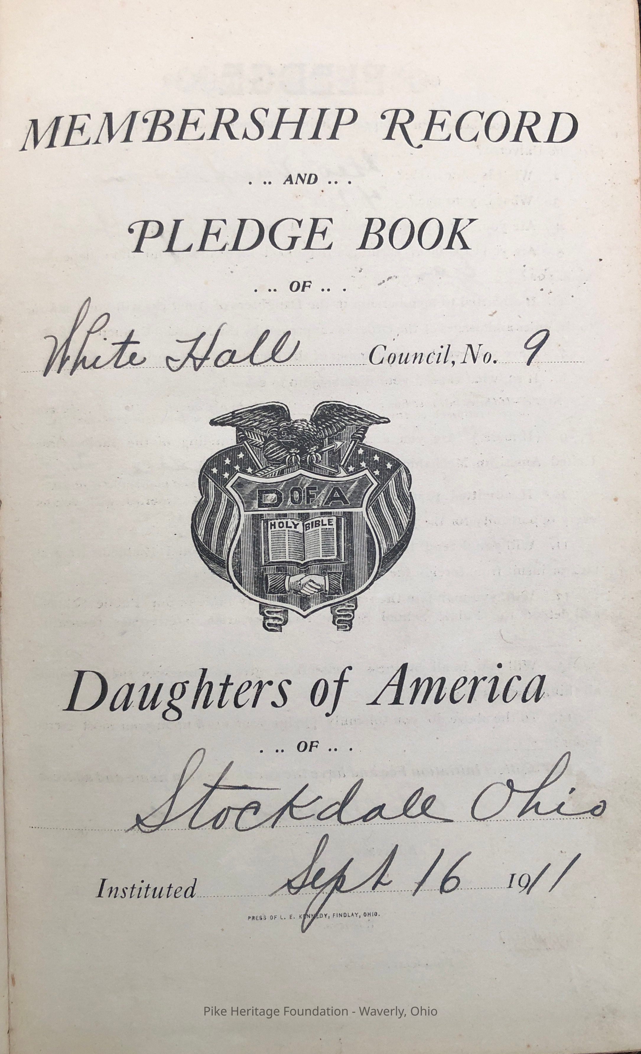 Membership Record and Pledge Book of White Hall Council, No. 9 Daughters of America of Stockdale, Ohio. This book records memberships beginning on September 16, 1911 continuing through June 14, 1976.Collection