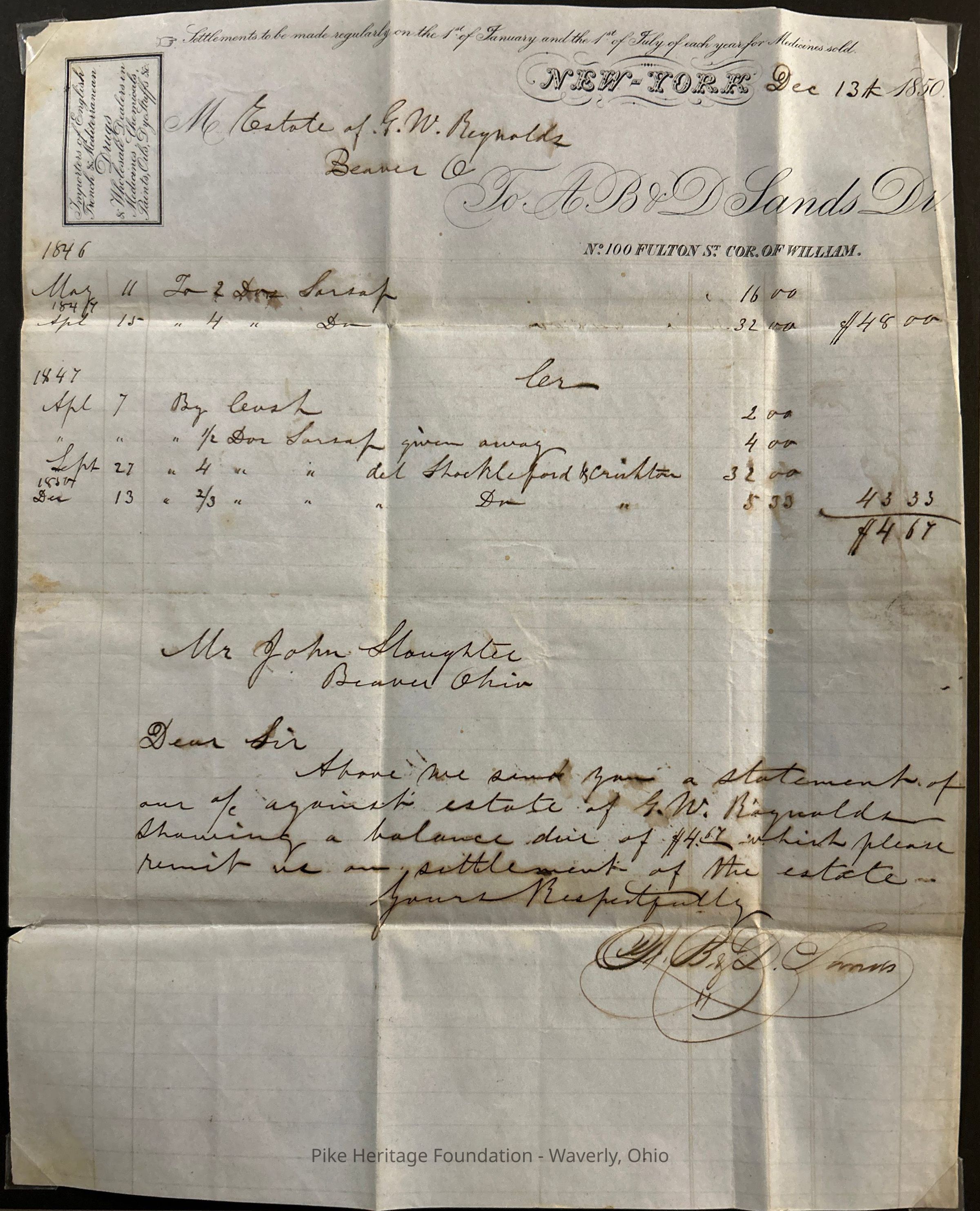 Legal document pertaining to the settlement of the estate of George W. Reynolds who founded the Village of Beaver in Pike County, Ohio in 1839.Collection