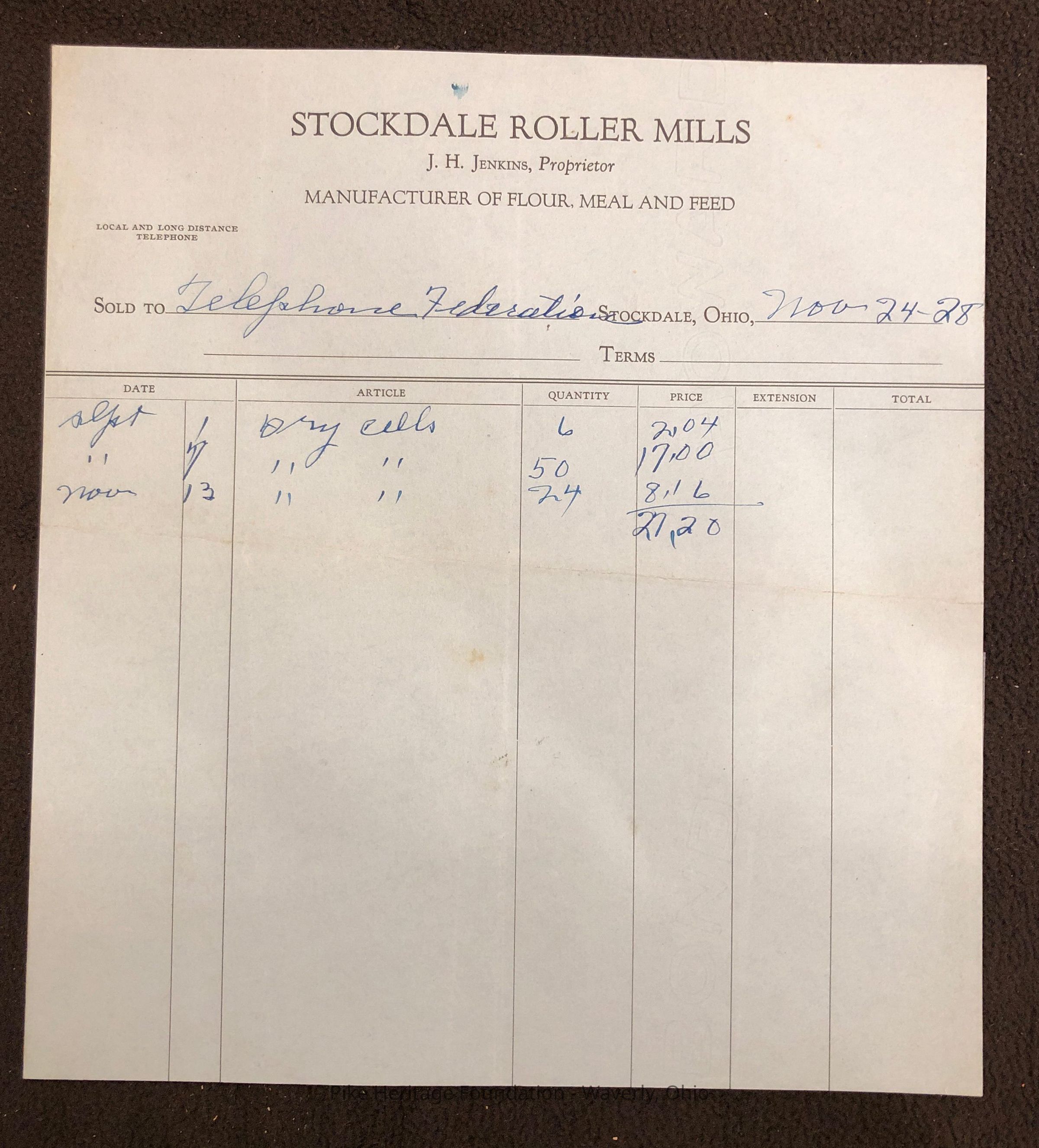Receipt for dry cells for the Stockdale Telephone Federation on November 24, 1928.Collection