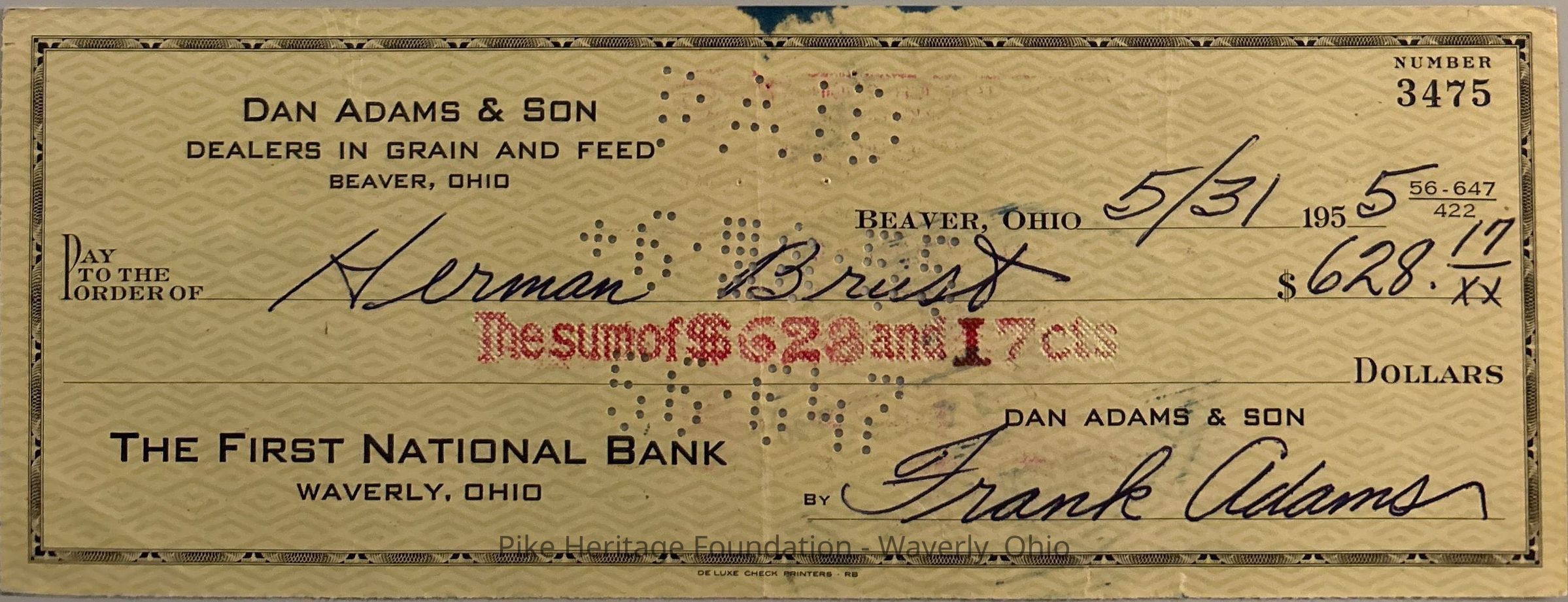 Dan Adams & Son check written to Herman Brust for the purchase of grain in 1955.Collection
