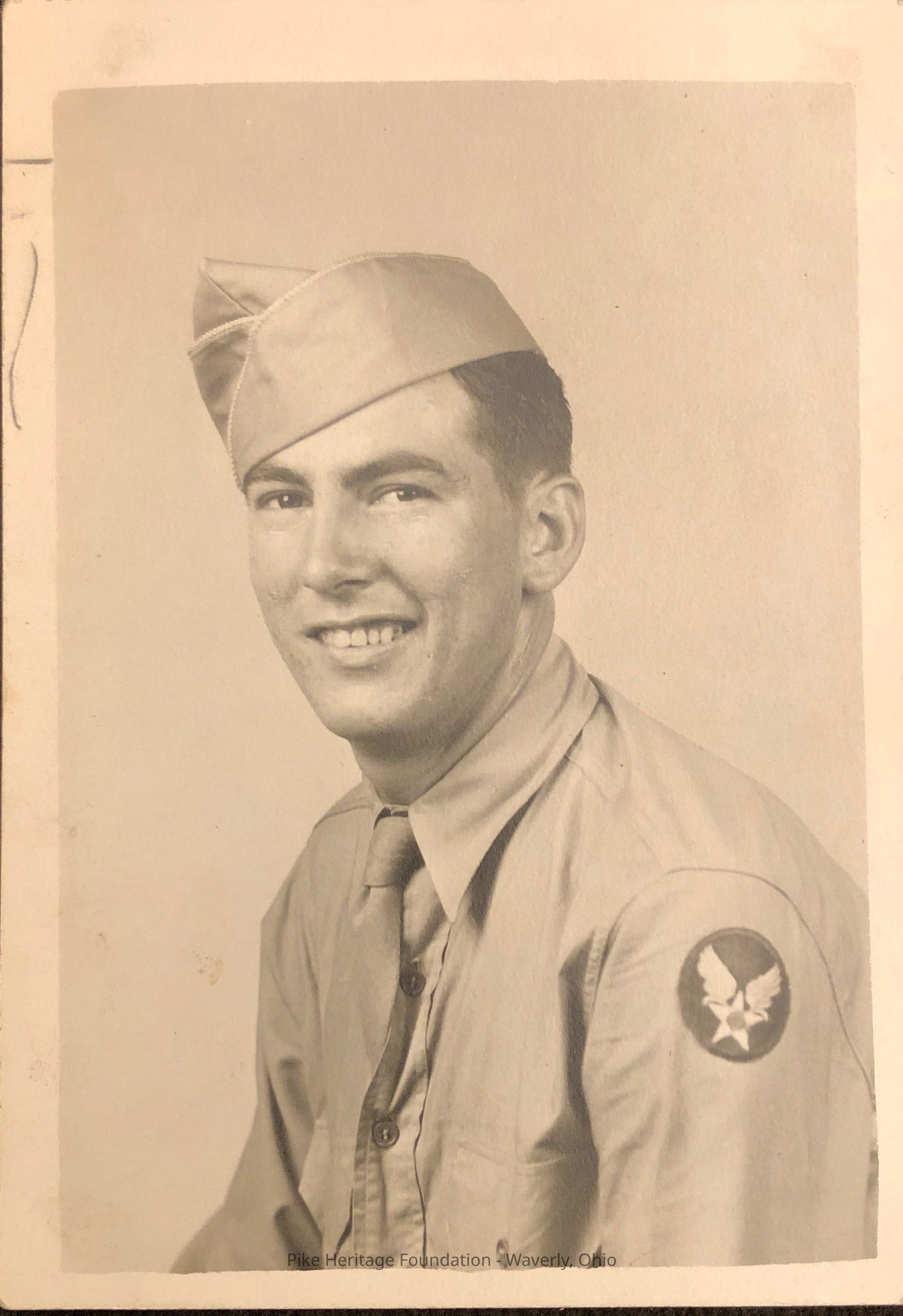 Photograph of World War Two U. S. Army veteran and Beaver, Ohio native Kenneth Thompson. Kenneth Alonzo “Stump” Thompson, aged 86, died March 21, 2010. He was born May 13, 1923 the son of Benjamin Franklin and Bertha Mae Kuntzman Thompson. He graduated from Beaver High School in 1940. Soon after graduation the nation became embroiled in World War Two and Ken joined the United States Army. He enlisted on January 9, 1943 at Huntington WV. He served in India and the Island of Tinian. He was assigned to the 20th Division of the Army Air Corps. He was discharged at Camp Atterbury IN on January 19, 1946. He retired from the Inland Division of General Motors as a general foreman after thirty years and was a charter member of the Inland retiree club. He was a member of American Legion Post 746 and Veterans of Foreign Wars Post 9942 of Beaver. He was married to Donna J. Thompson. Donna was born on February 1, 1942 the daughter of Frank and Roberta Giles Thompson. She died on May 20, 2018. Ken and Donna were buried in Beaver Union Cemetery.Collection