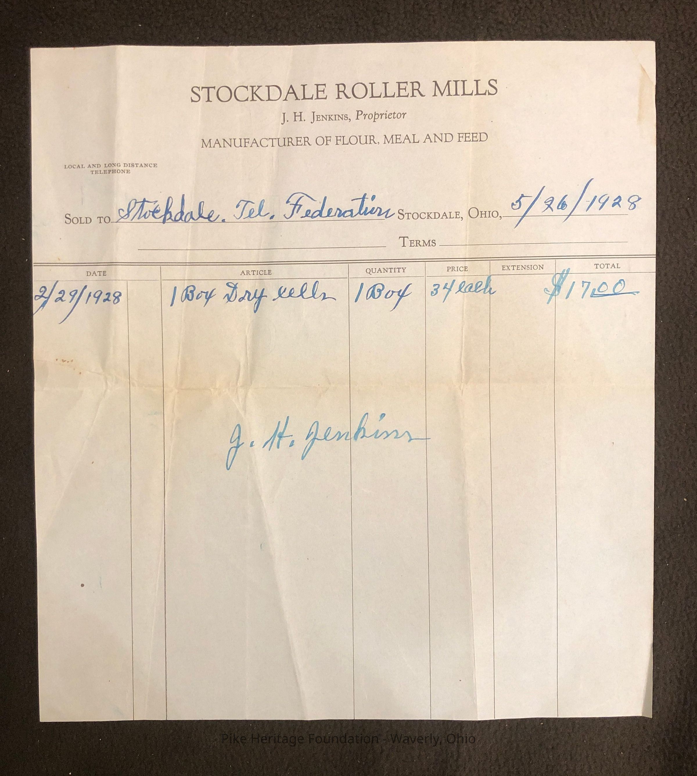 One or two receipts from the Stockdale Roller Mills located in Stockdale, Ohio. The Stockdale Roller Mills was operated by J. H. Jenkins in the Village of Stockdale in Marion Township.Collection