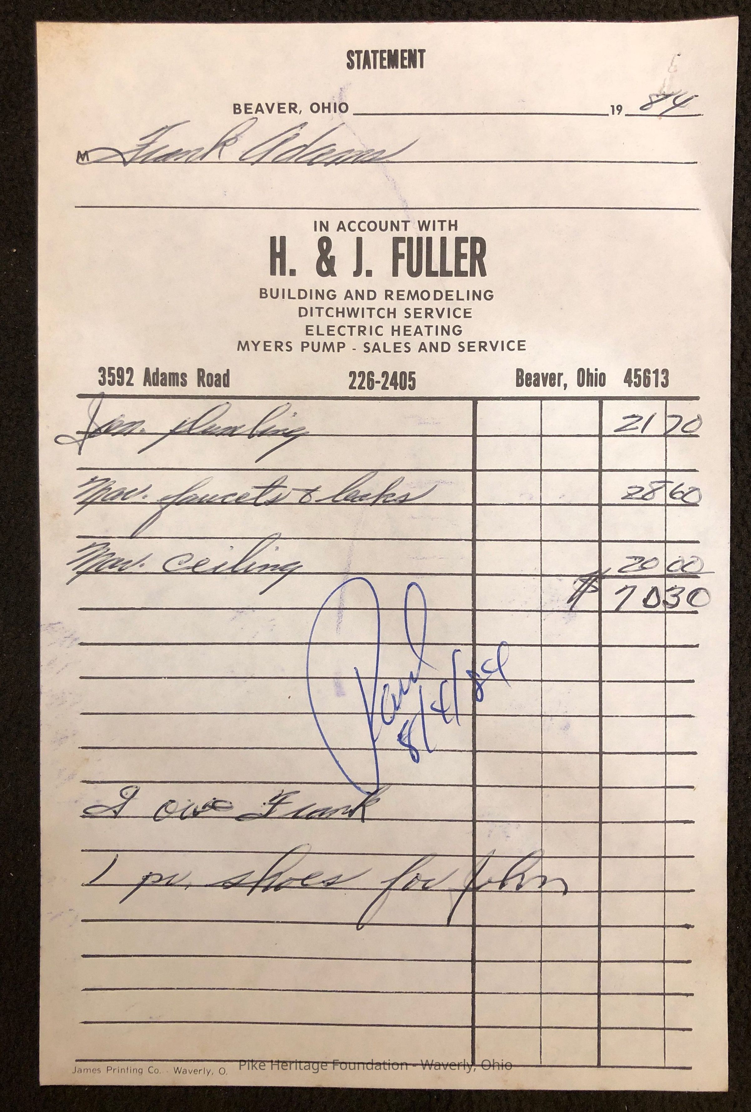 H. J. Fuller Company Receipt - 1984Entry/Object ID