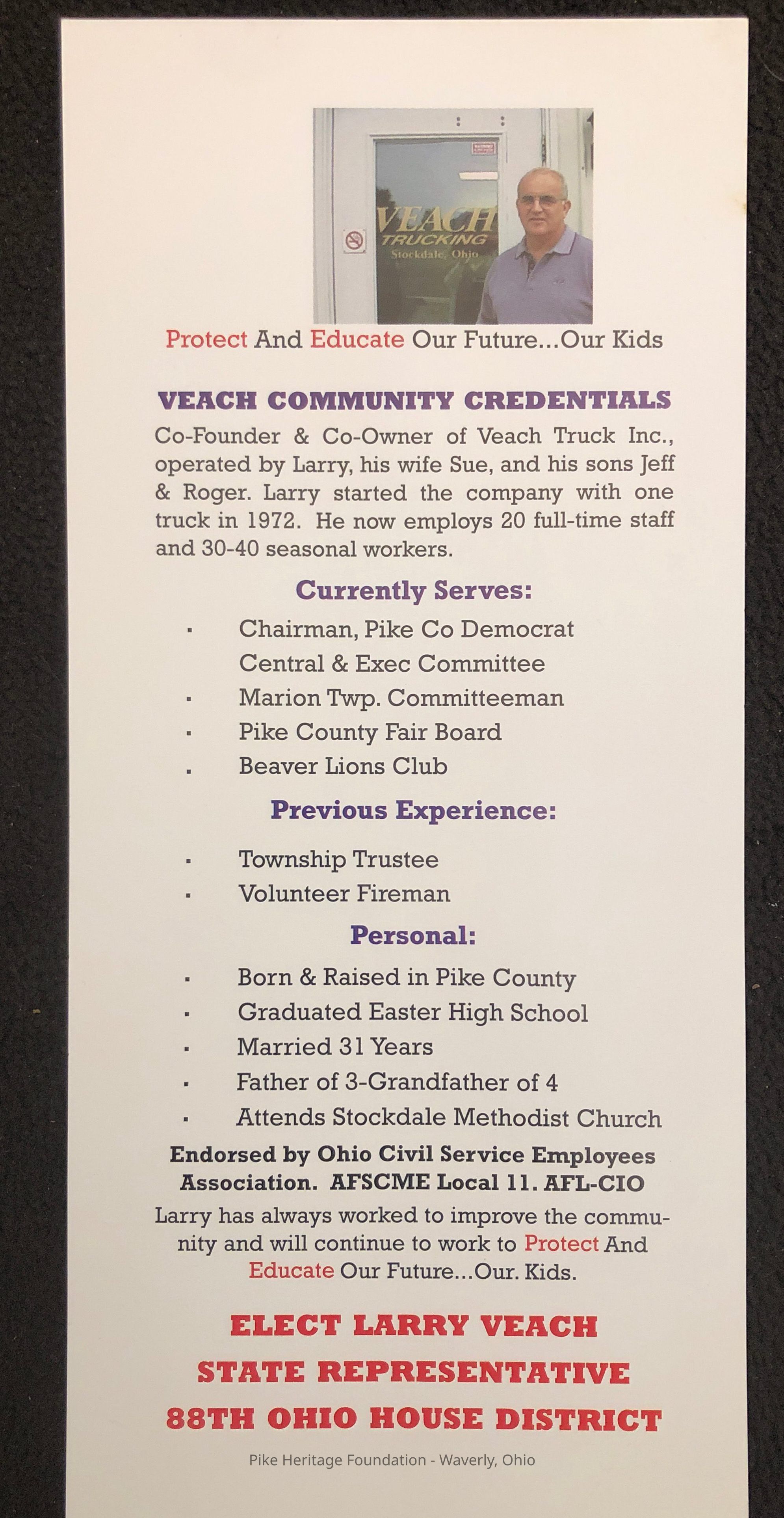 Three copies of an advertisement, published by Larry Veach of Stockdale, Ohio, who ran for the seat of the 88th Ohio House District of the Ohio House Of Representatives in 1998.Collection
