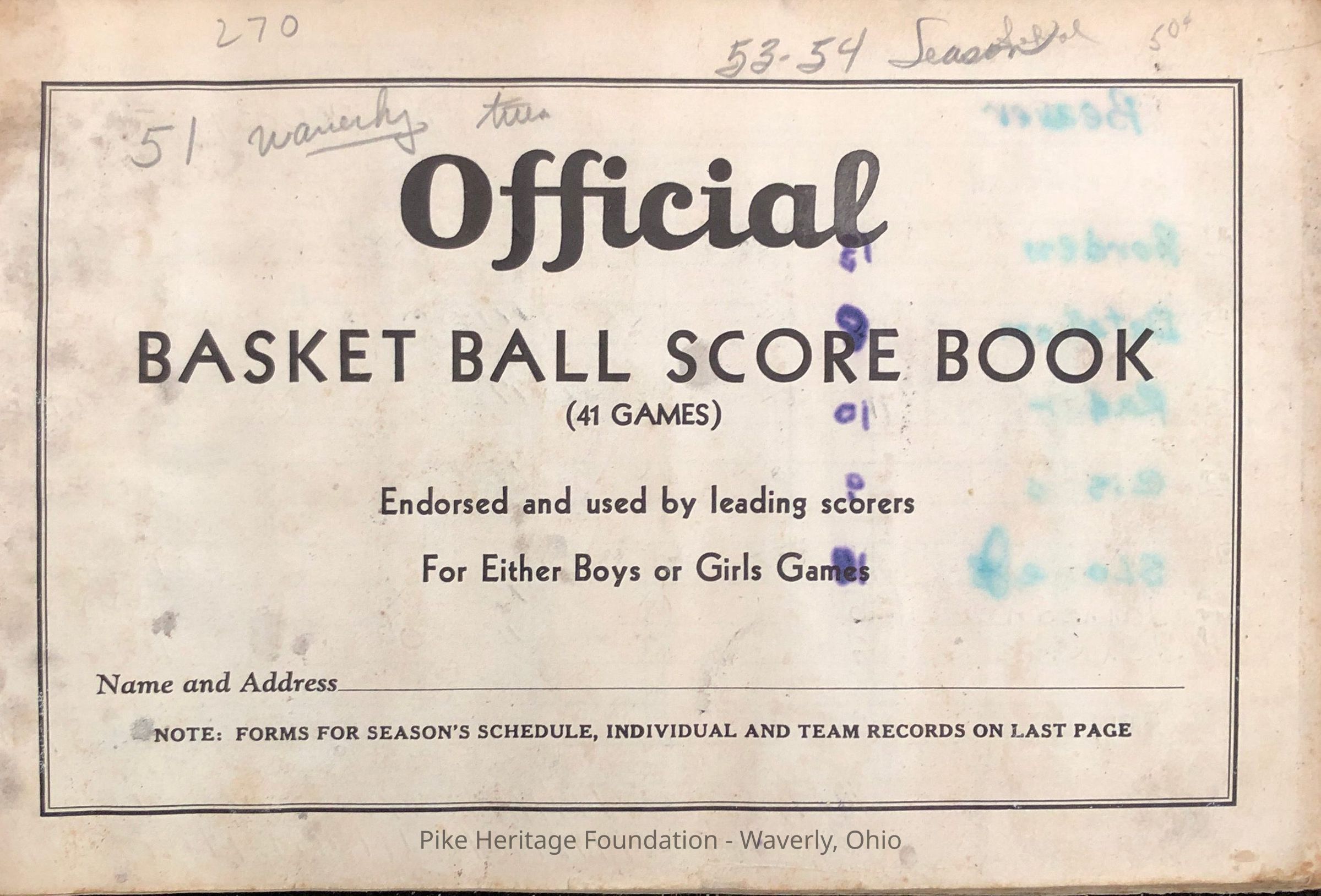 1953-54 Beaver High School Boys Basketball Team scorebook. Teams played include Richmondsle, Hamden, Rio Grande, Piketon, Waverly, Scioto, Oak Hill, Western, Stockdale, and Twin Township.Collection