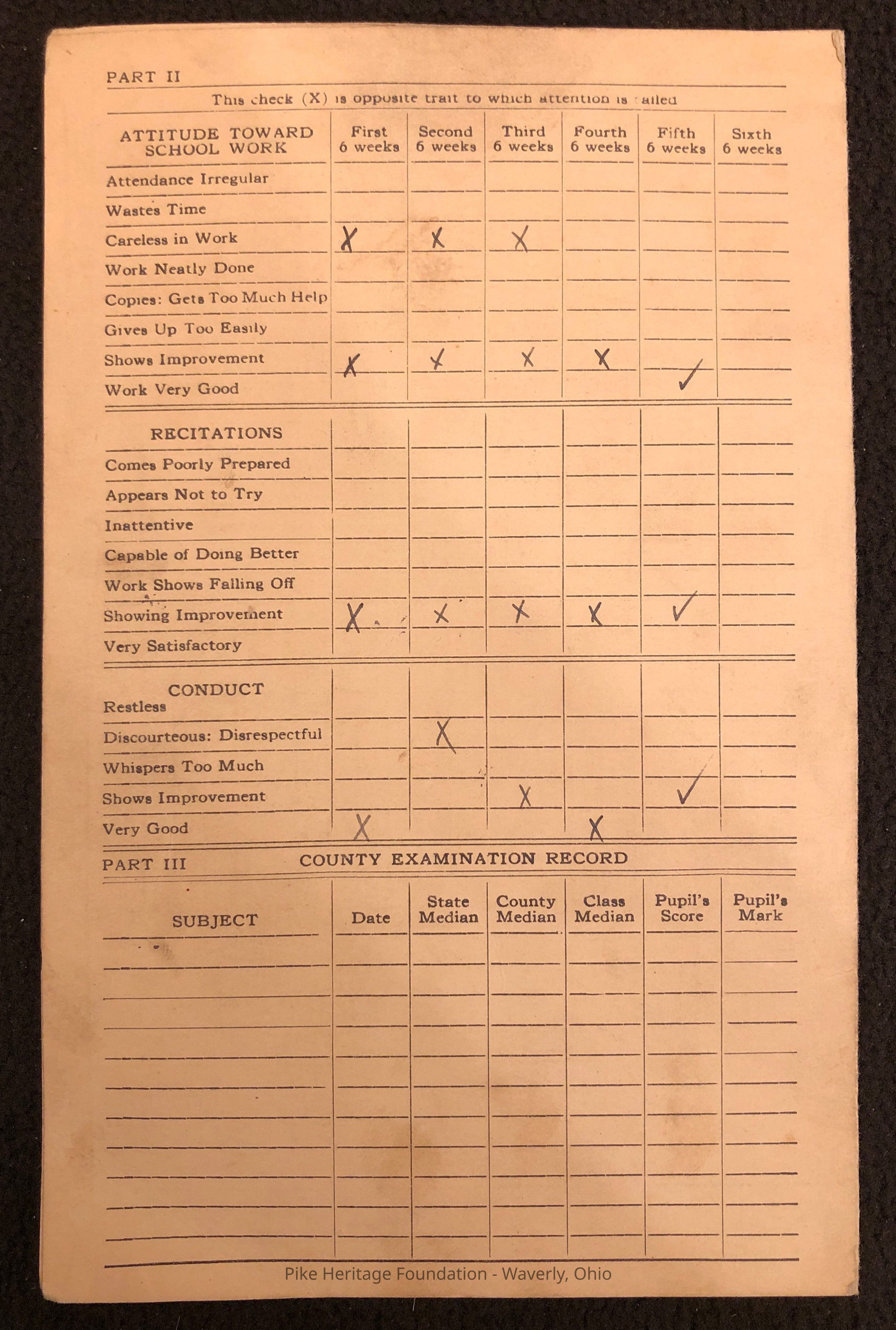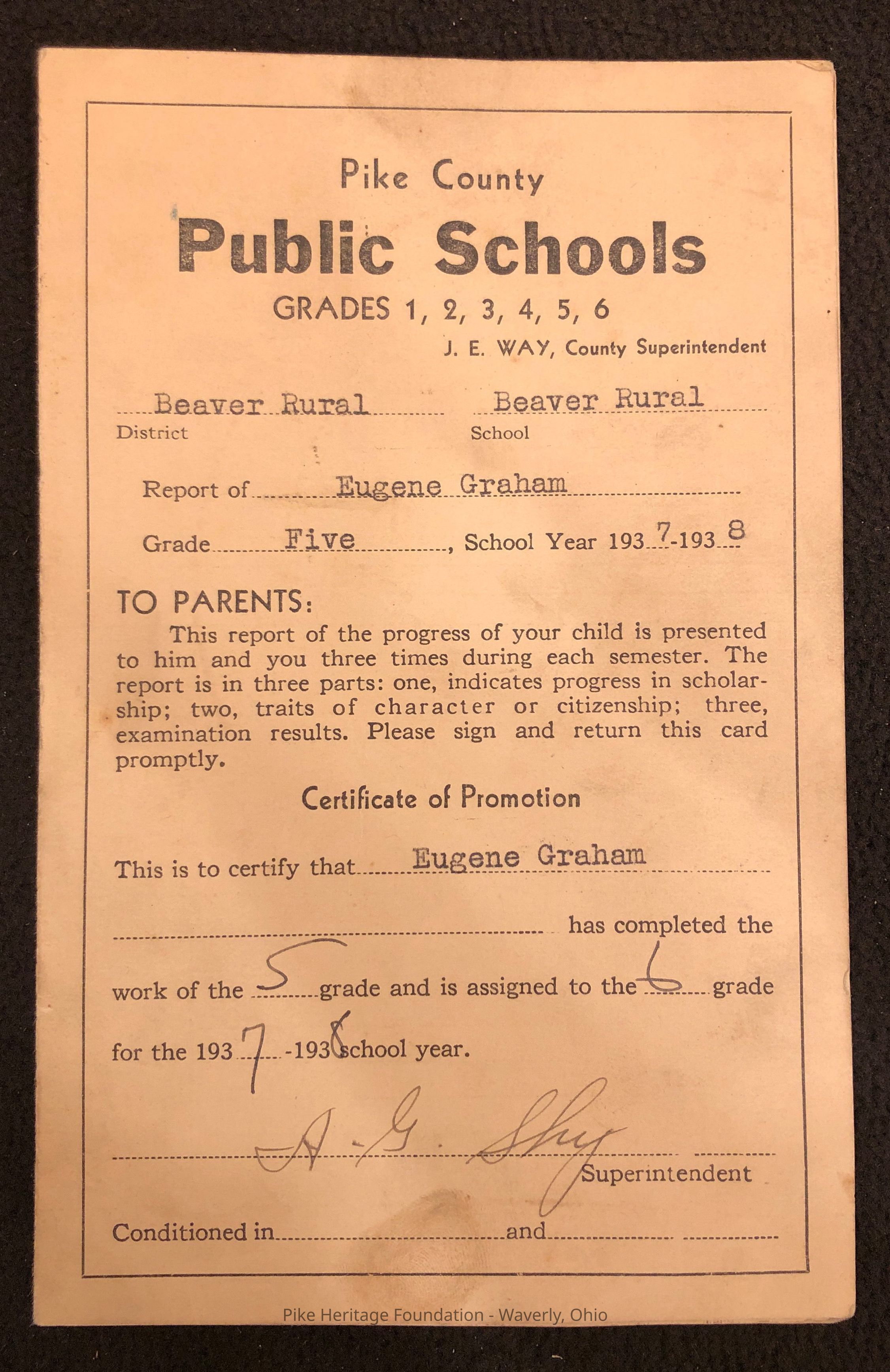 Grade card from the 1937-38 school year for Eugene Graham when he attended Beaver Local School in Beaver, Ohio.Collection
