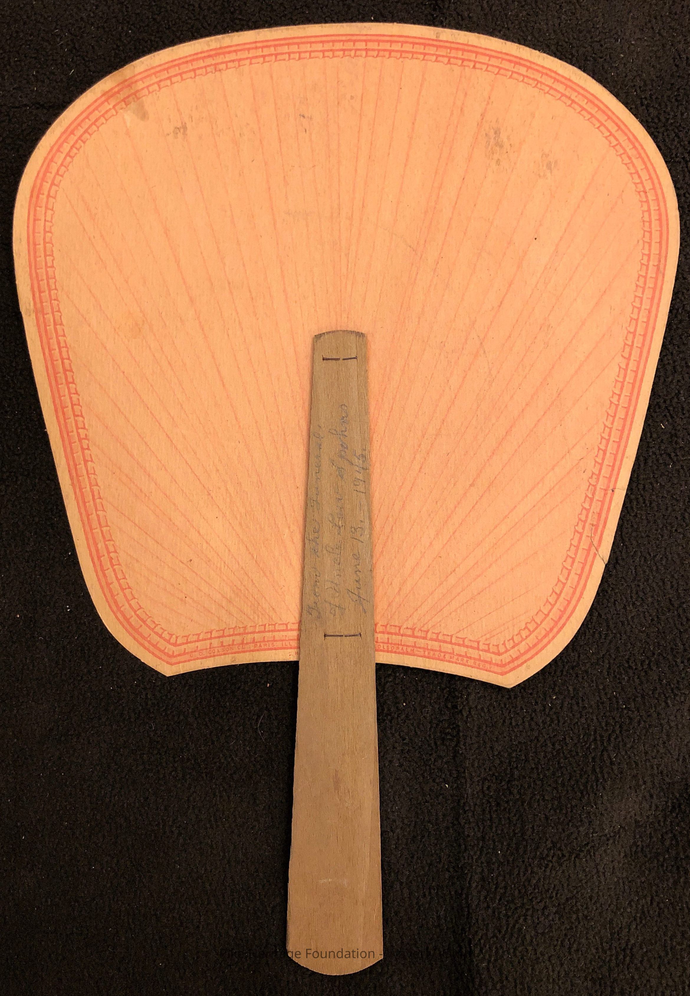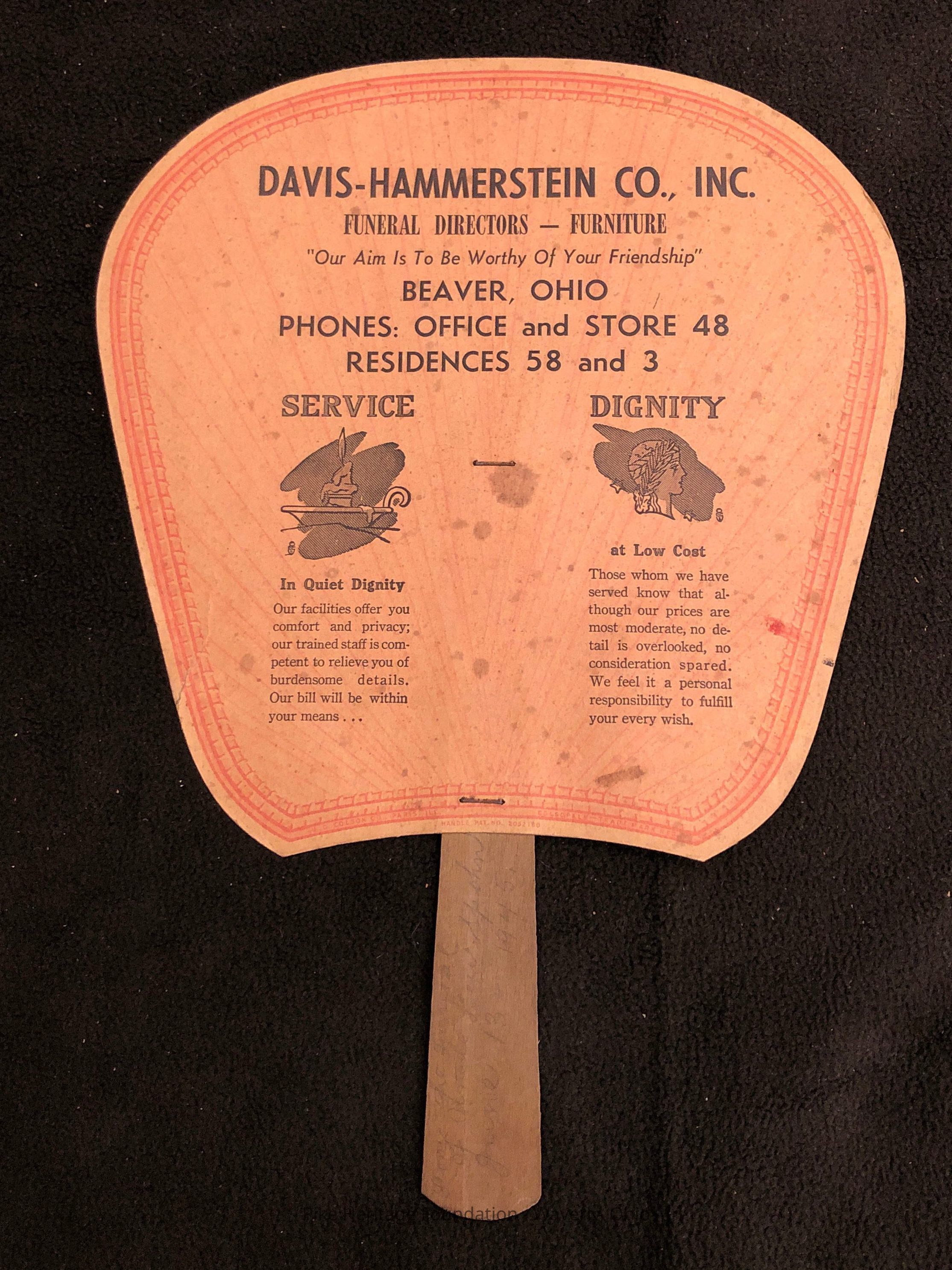 Cardboard and wood fan from the Davis-Hammerstein Compnay located on Main Street in Beaver, Ohio. Firm was owned by George Omer Davis and Lamar Hammerstein. Written on handle in pencil are the following words: “From the funeral of Uncle Lew Spohn June 13, 1945”.Collection