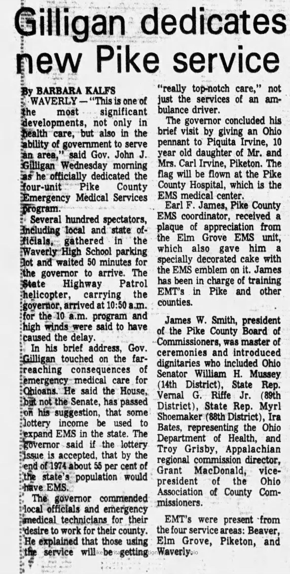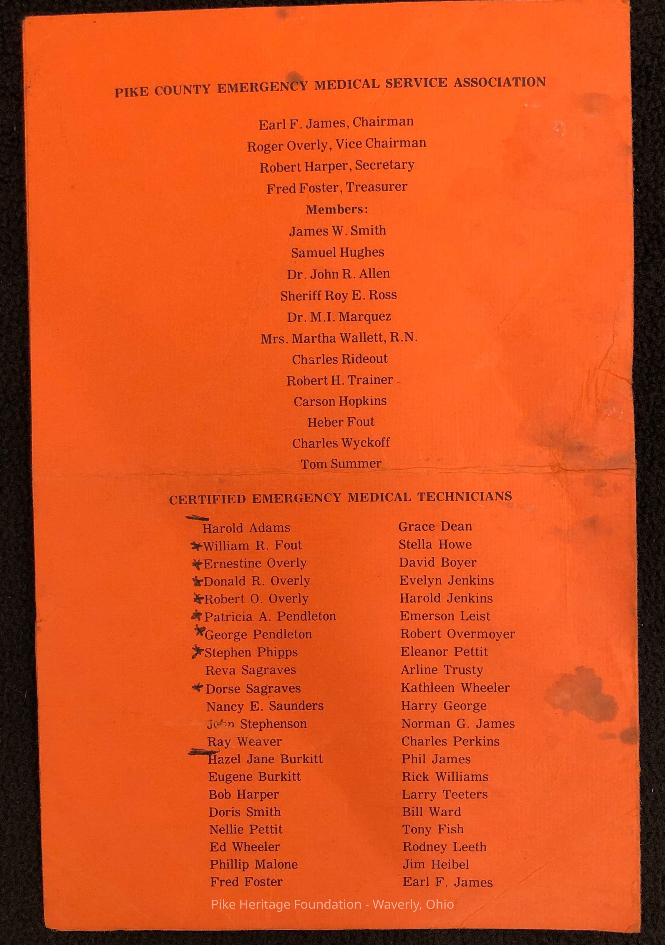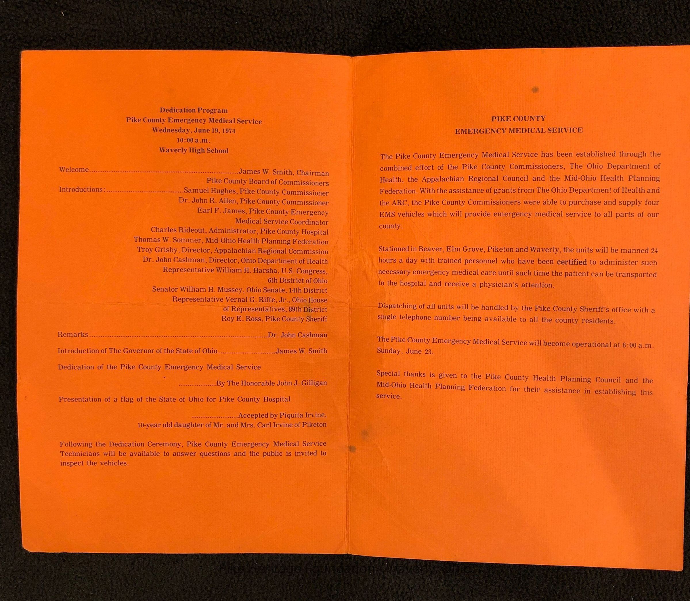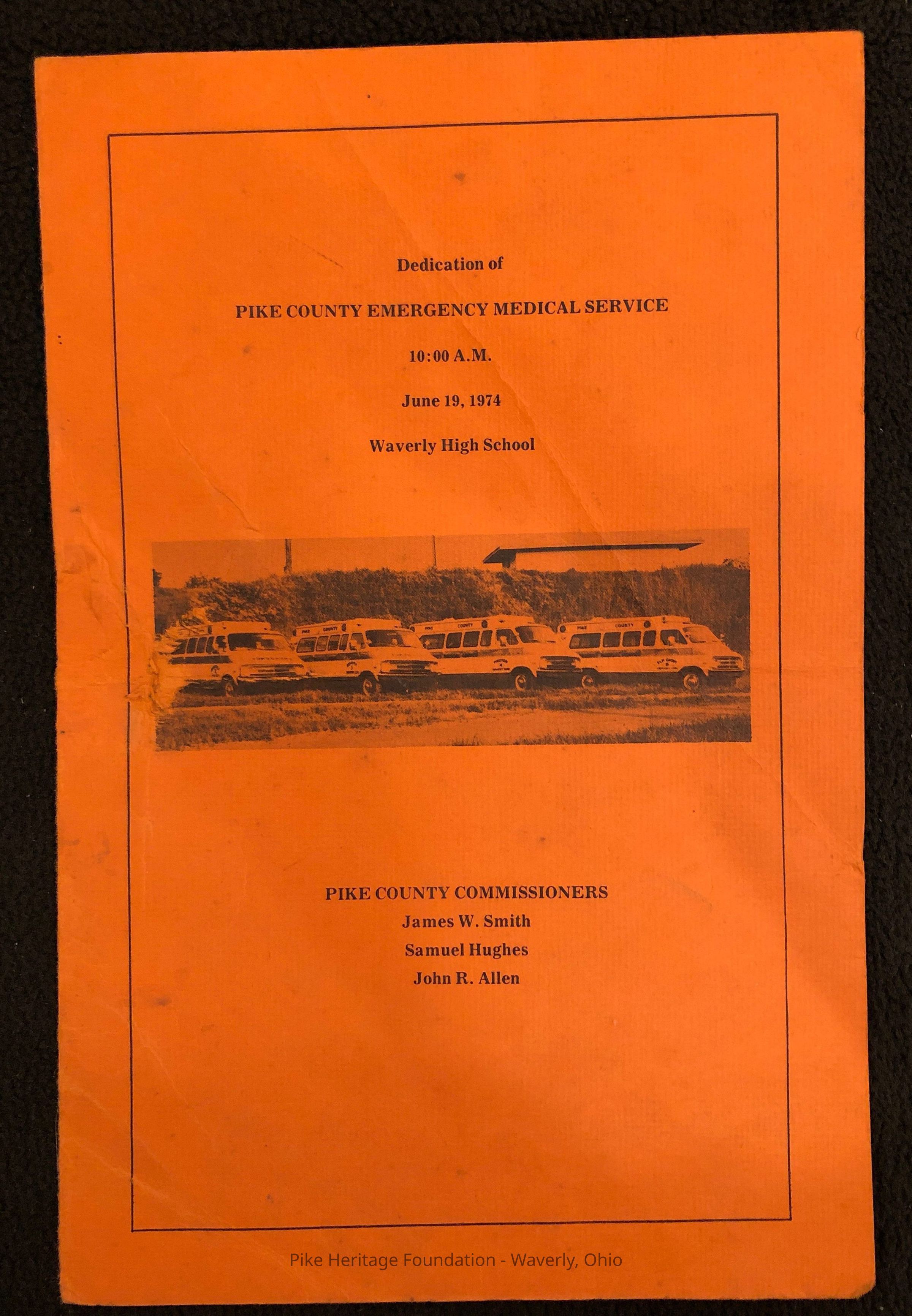Program dedicating the newly created Pike County Emergency Medical Service on June 19, 1974. Dignitaries at the dedication included Ohio Governor John J. Gillian. Units were manned by volunteers and located in the communities of Waverly, Piketon, Beaver, and Elm Grove.Collection