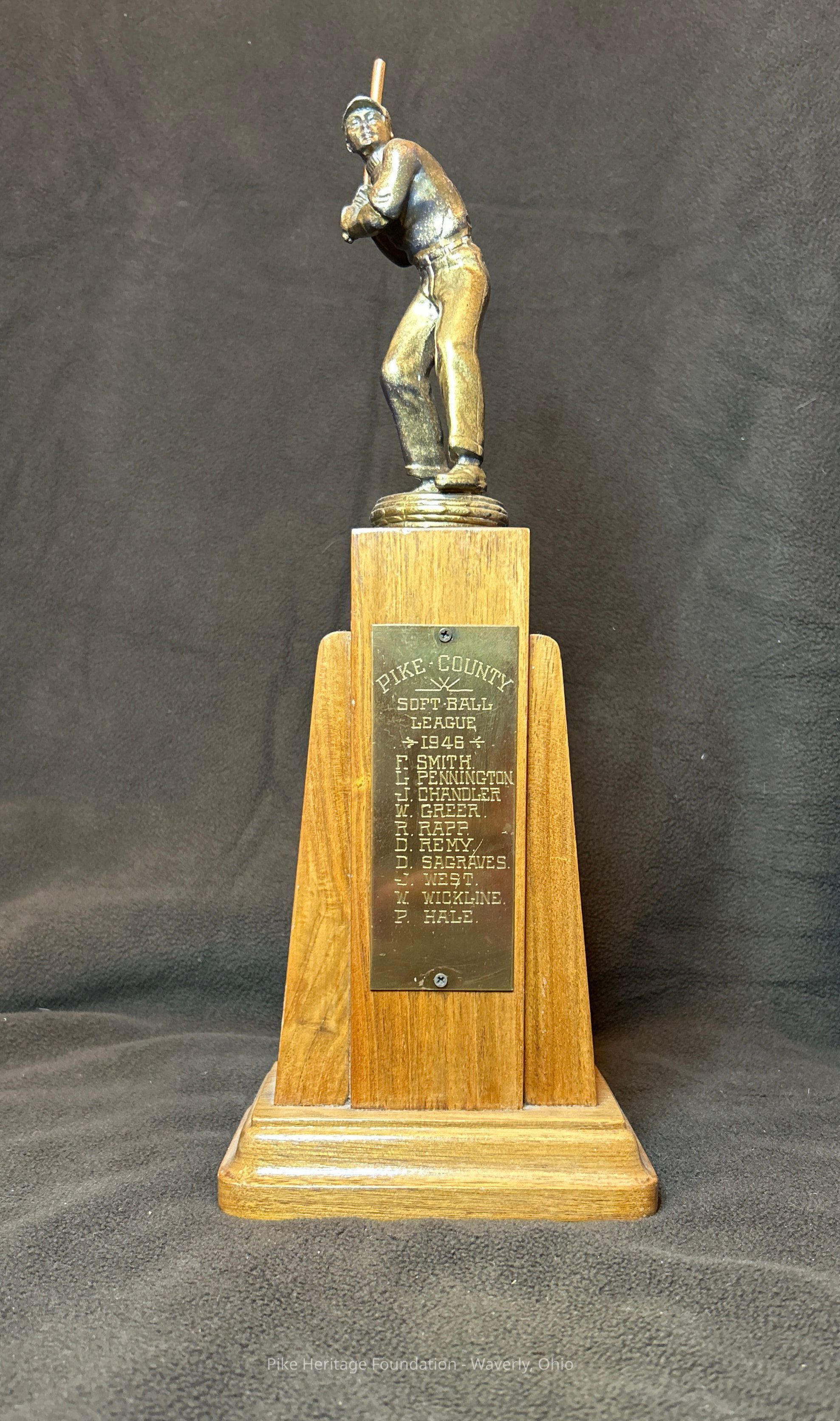 1946 Pike County, Ohio softball league championship trophy. Players included Smith, Pennington, Chandler, Greer, Rapp, Ramey, Sagraves, West,Wickline, and Hale.Collection