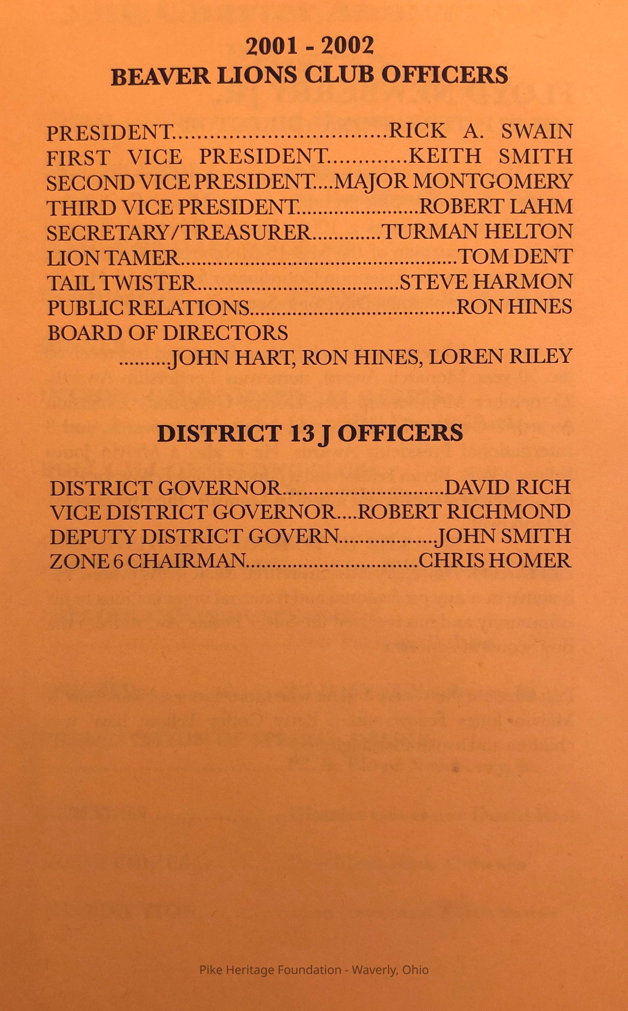 Beaver, Ohio Lions Club Program -2002Collection