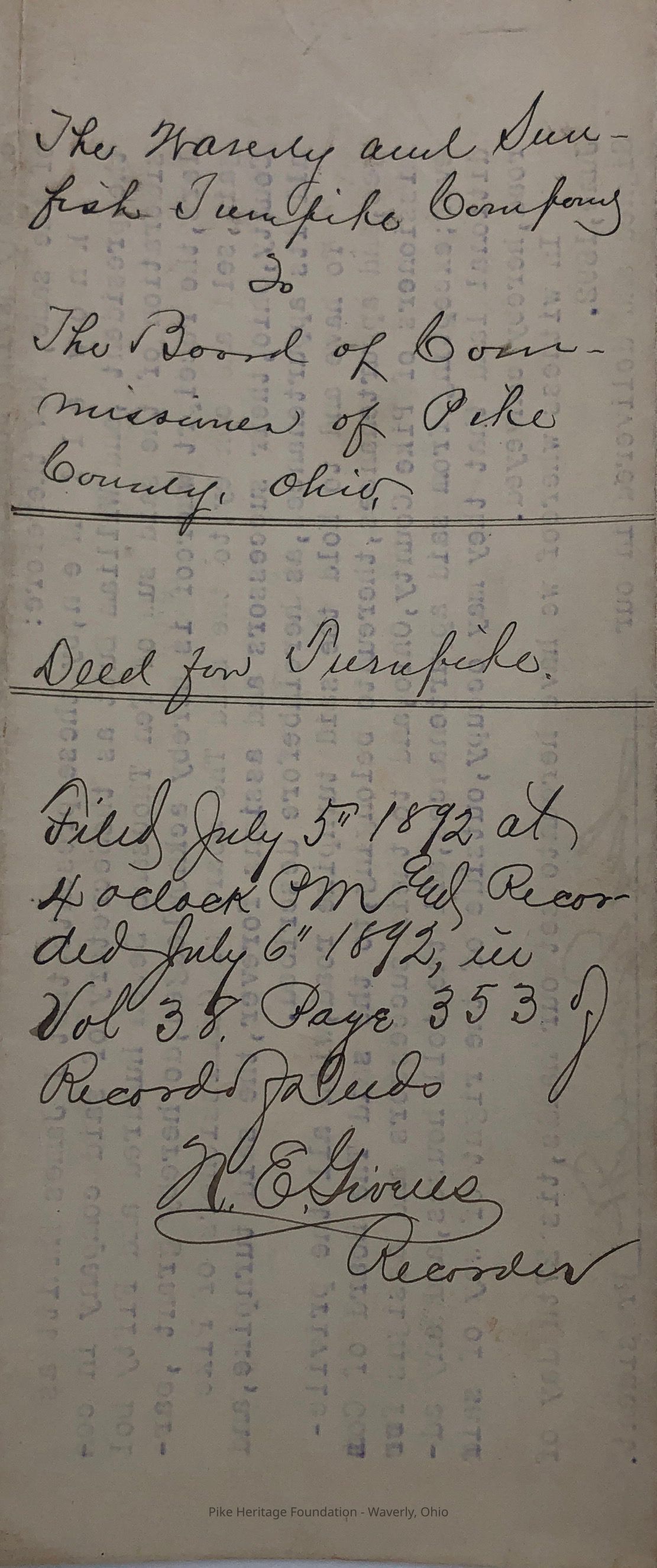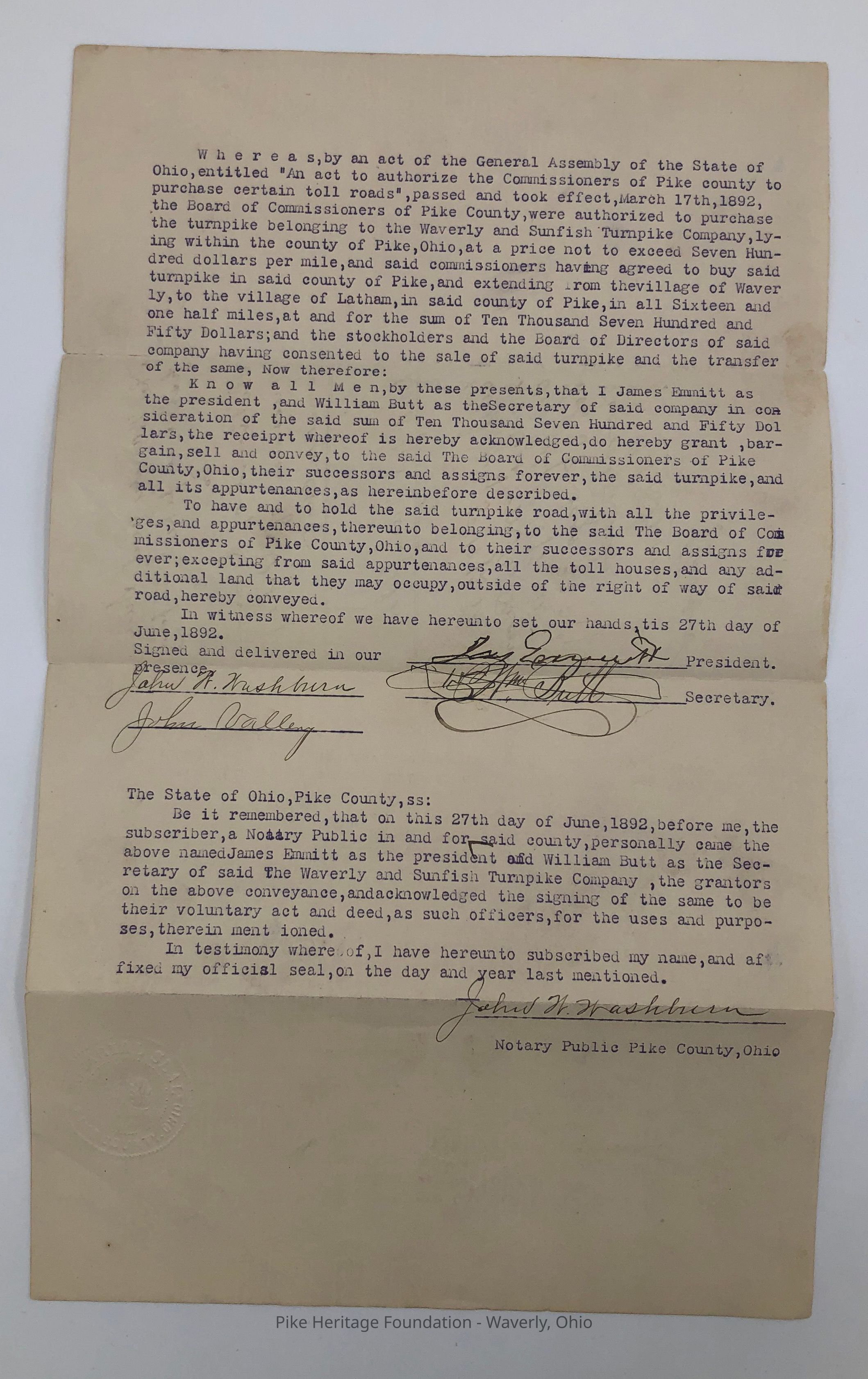 Deed from the sell of the Waverly and Sunfish Turnpike to the Pike County Commissioners from James Emmitt for $10,750. Signed June 27, 1892 and includes embossed stamp.Acquisition