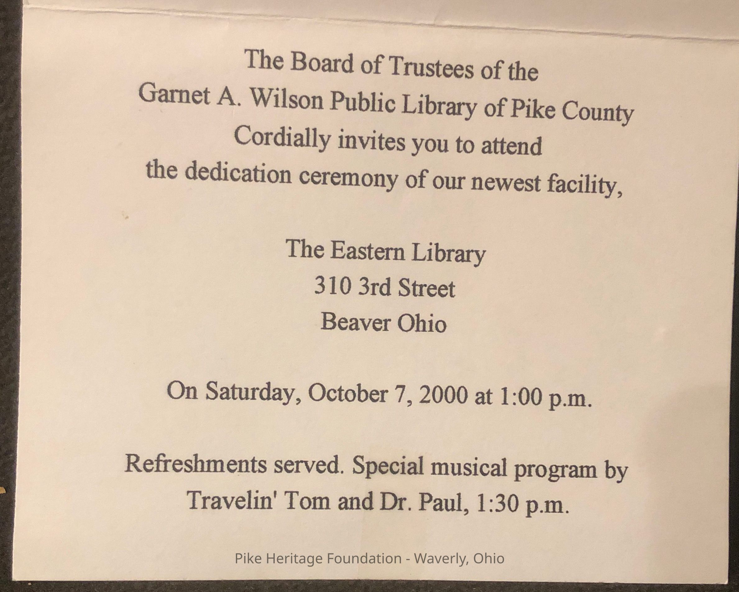 Dedication invitation for the Eastern Branch of the Garnet A. Wilson Public Library of Pike County, Ohio. Located in the Village of Beaver, the library was dedicated on October 7, 2000.Collection