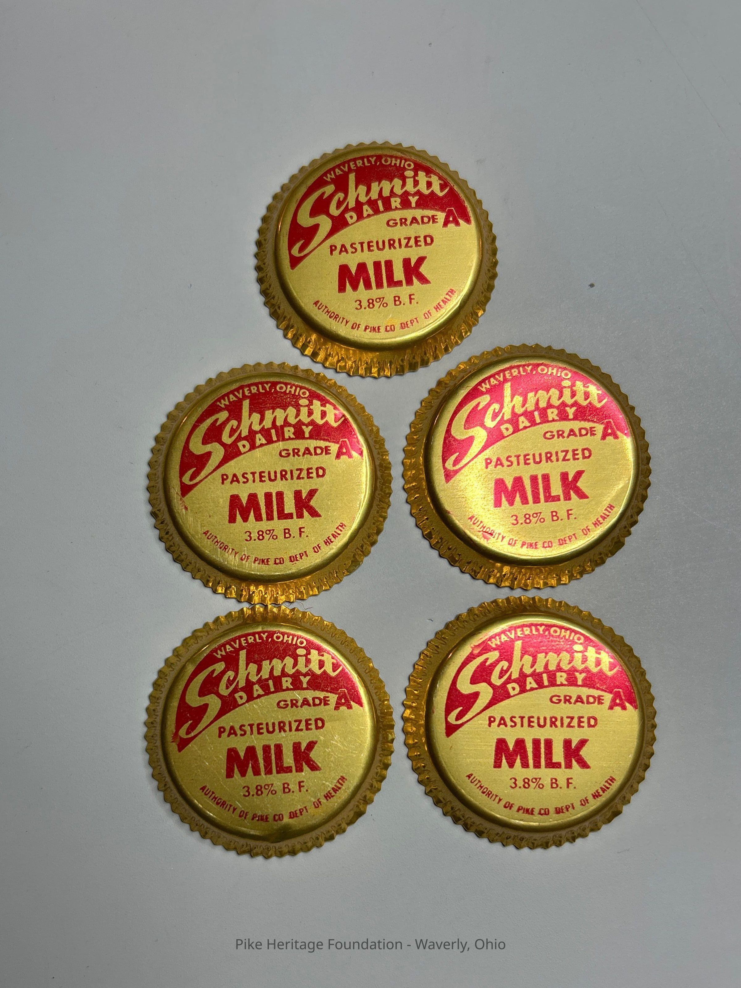 Collection of five pasteurized milk bottle caps from the former Schmitt Dairy of Waverly.