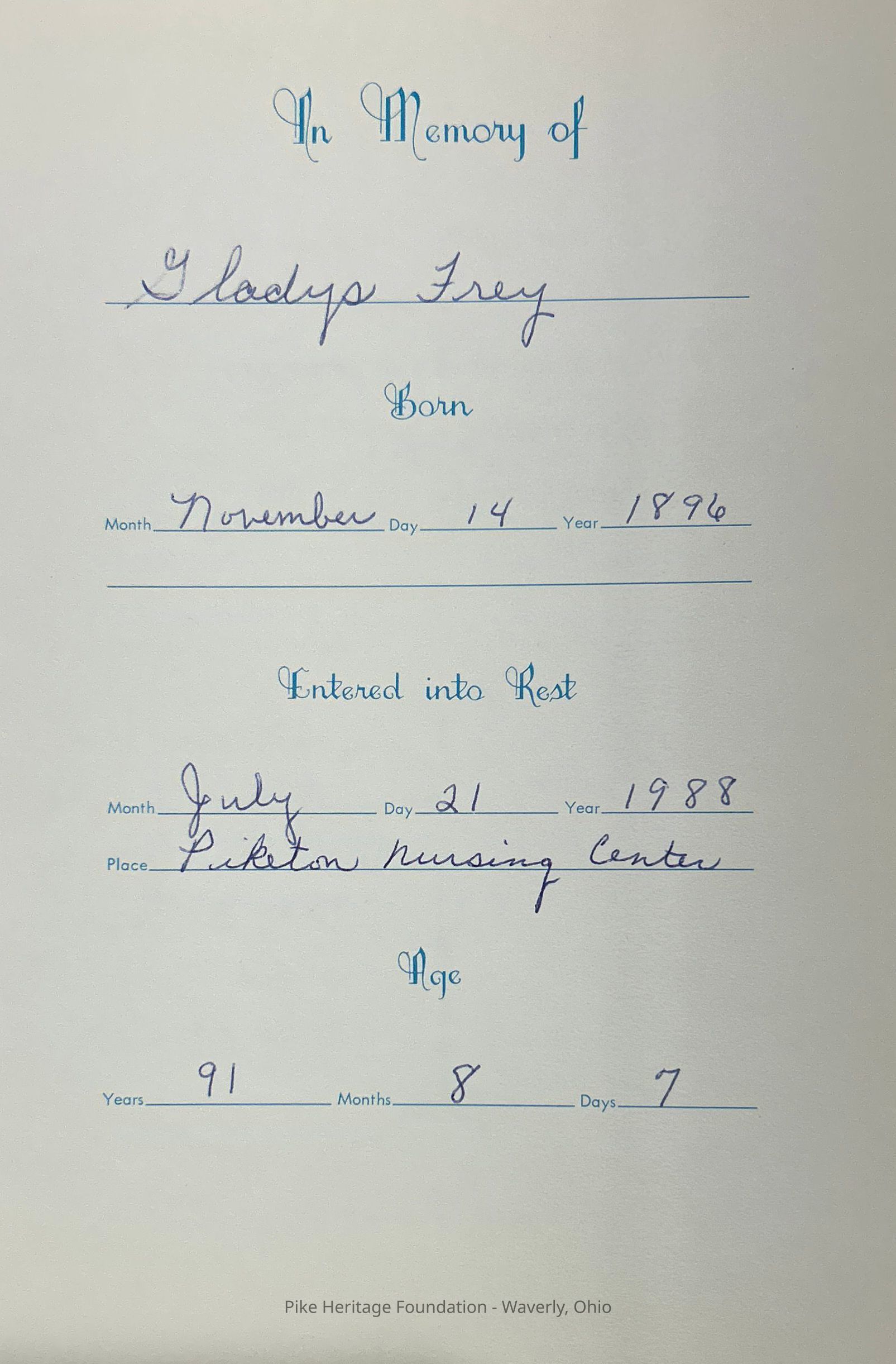 Artifacts from the funeral of Gladys Halterman Frey, who died July 21, 1988 at the Piketon Nursing Center. Collection includes the funeral home attendance record, handwritten obituary and funeral home memorial from the Cox Funeral Home in Beaver, Ohio.Collection