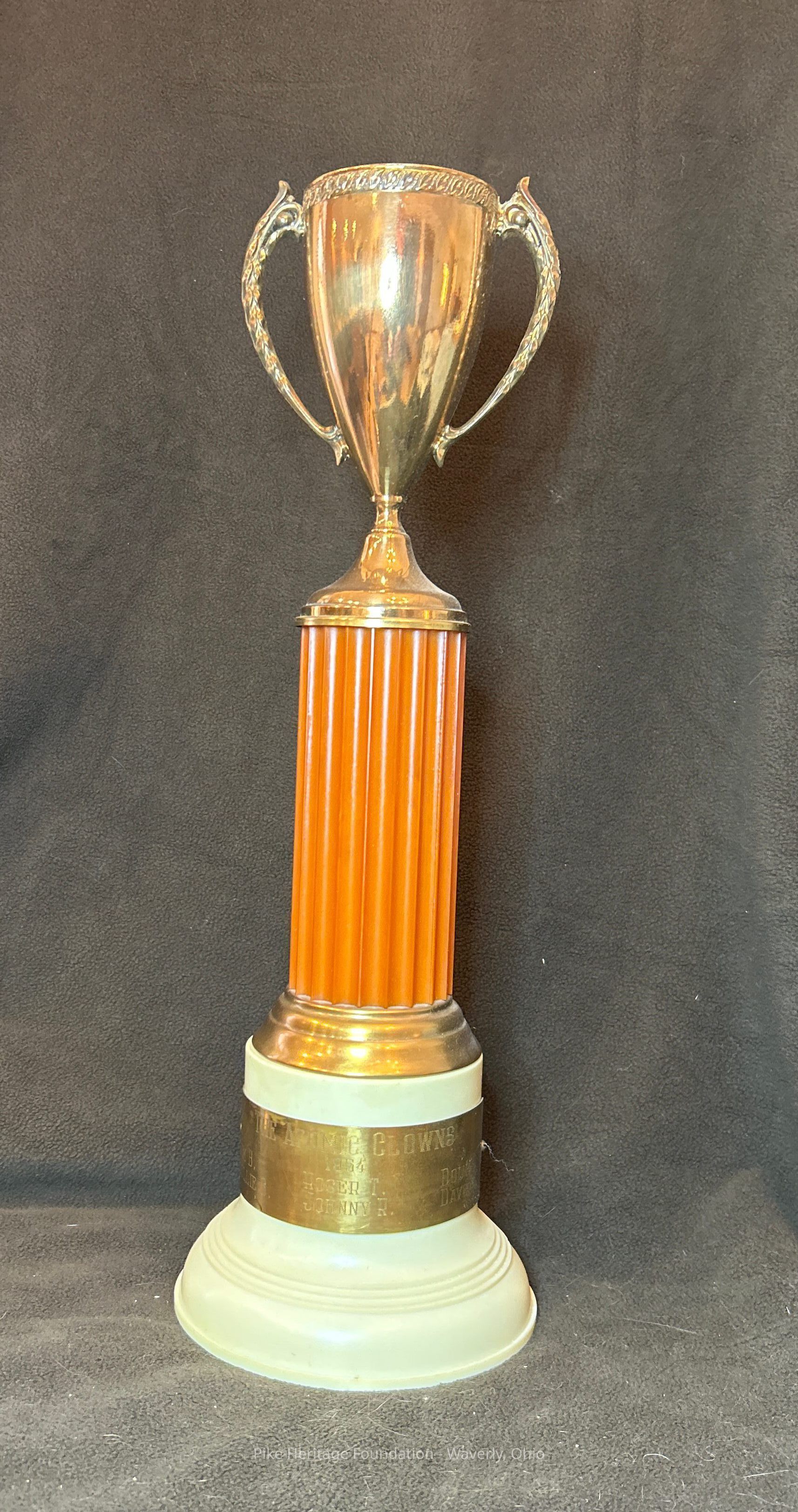 1954 trophy presented to a group entitled The Atomic Clowns. Members included Jim B., Jolly Slone, Roger T., Johnny R., Doug G., And Dave H.Collection