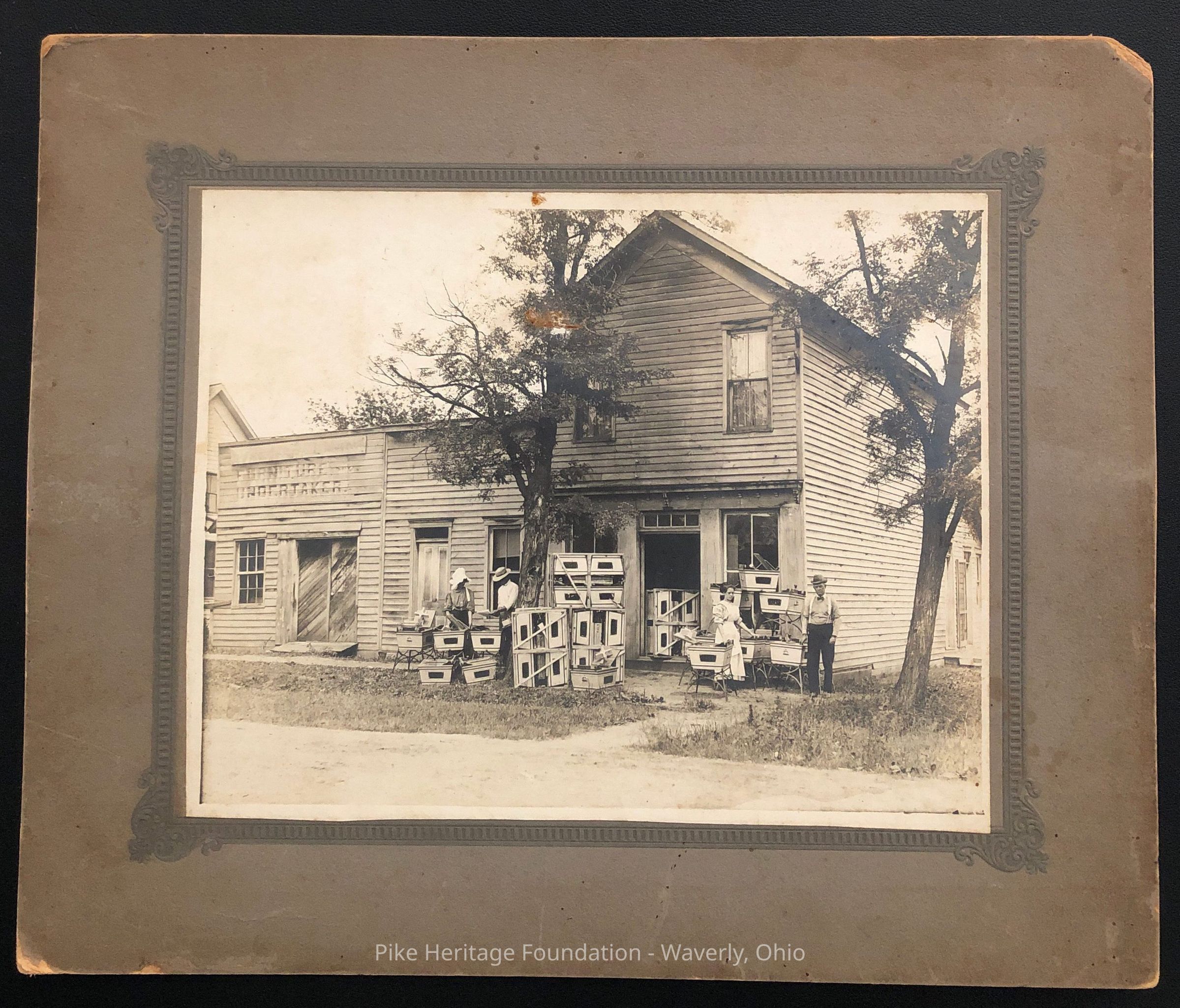 Circa 1920’s hardware store located on Church Street in Beaver, Ohio. Building on left is village’s first undertaking shop. Persons in image are inspecting a shipment of early washing machines.Photograph Details