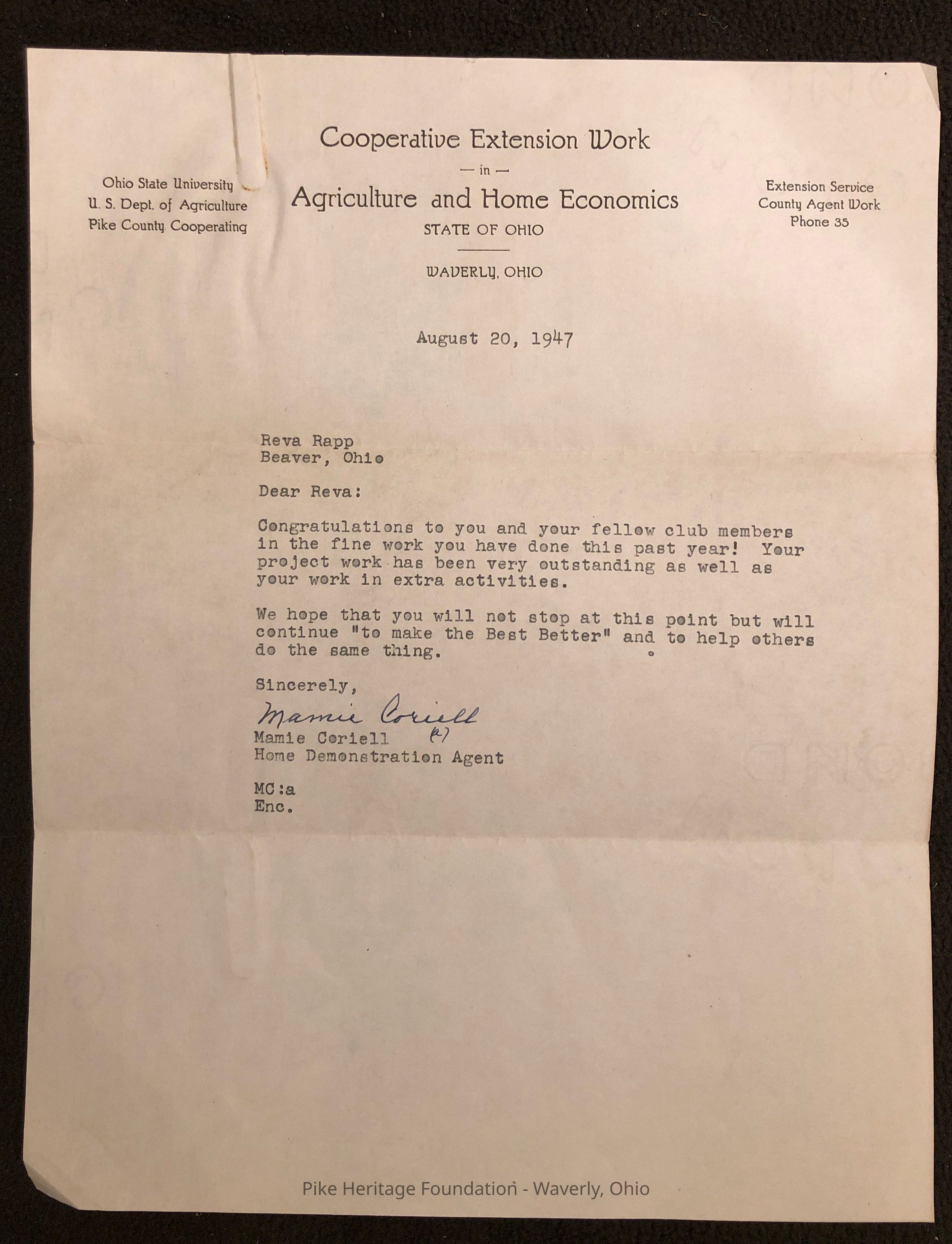 Letter to Reva Rapp of Beaver, Ohio, congratulating her and her fellow club members on the work they had done concerning agriculture in Pike County in 1947.Collection