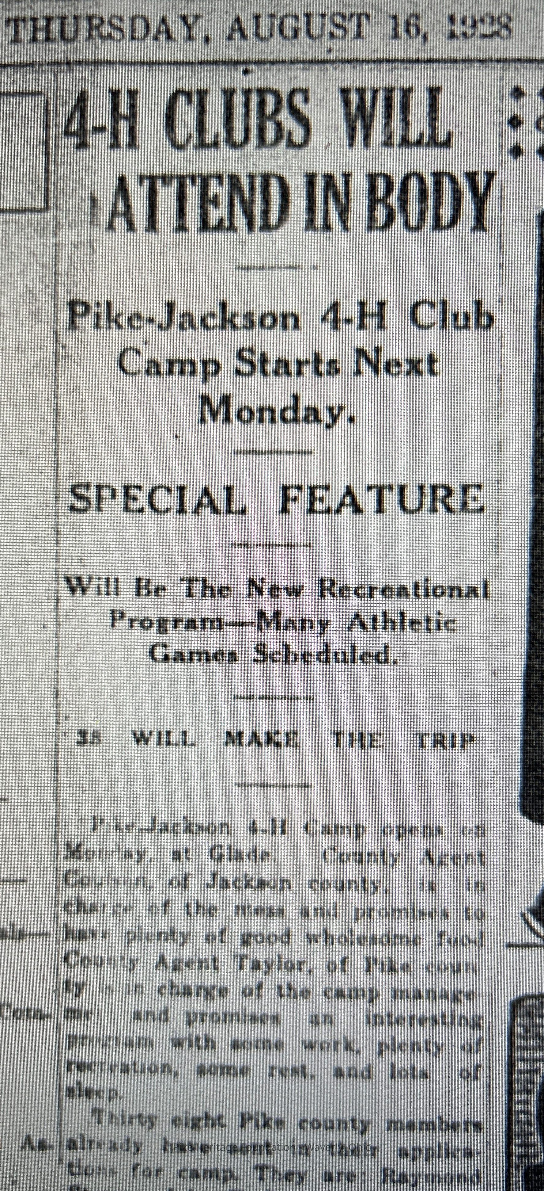 Collection of photographs from the Keechle family of Waverly, Ohio. Photographs include candid shots in Pike County, and a August 1928 4-H camp located in the community of Glade near the Pike/Jackson County line.Collection