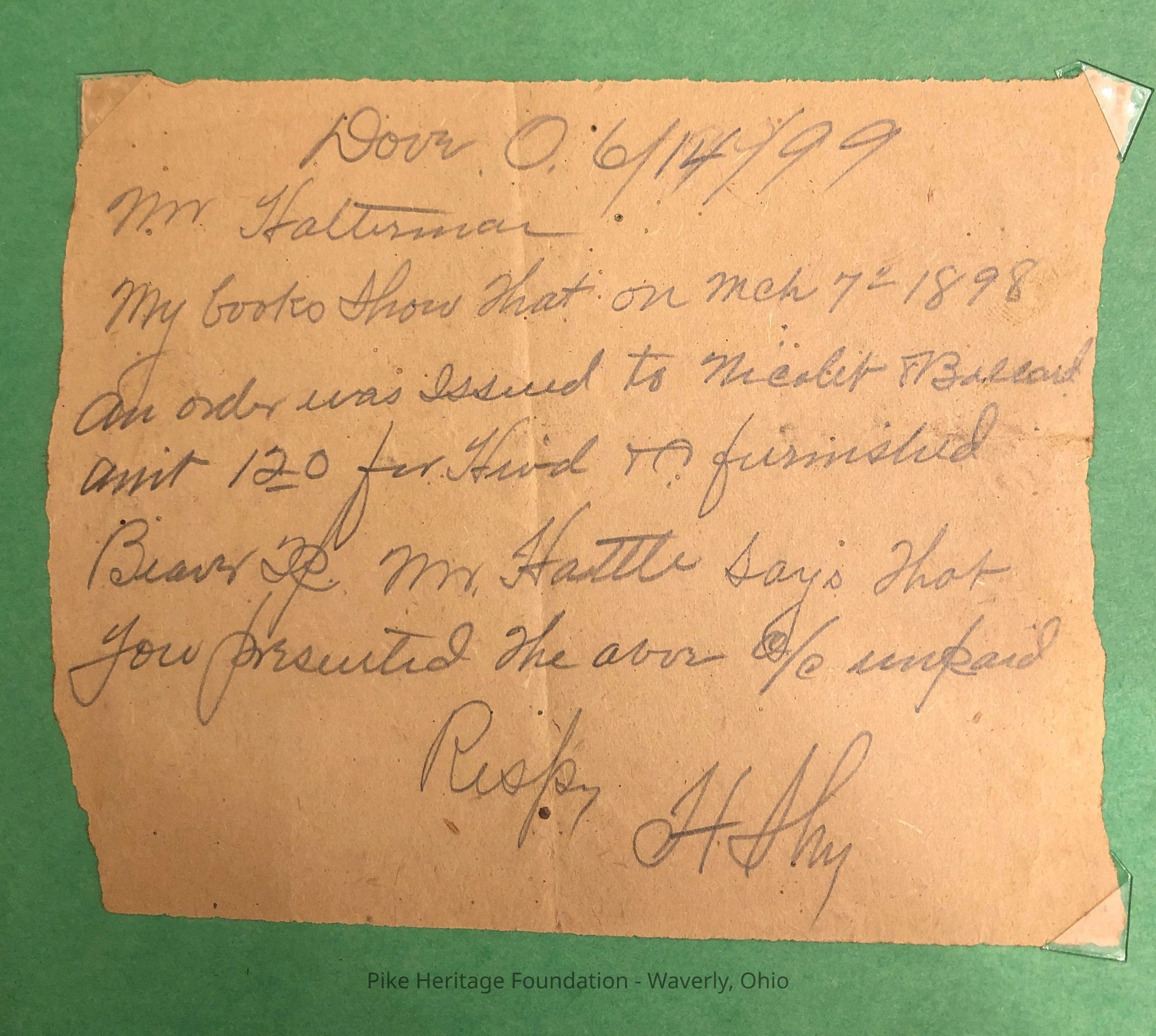 This turn-of-the-century note was sent from Herman Shy to William Tecumseh Halterman of Beaver, Ohio. Mr. Shy operated the grocery, post office, and train station at Dove for many years. Dove was a small community located at the present day intersection of Red Hollow Road and the old Detroit Toledo in Ironton railroad in Beaver Township just north of Beaver Chapel Church.Collection