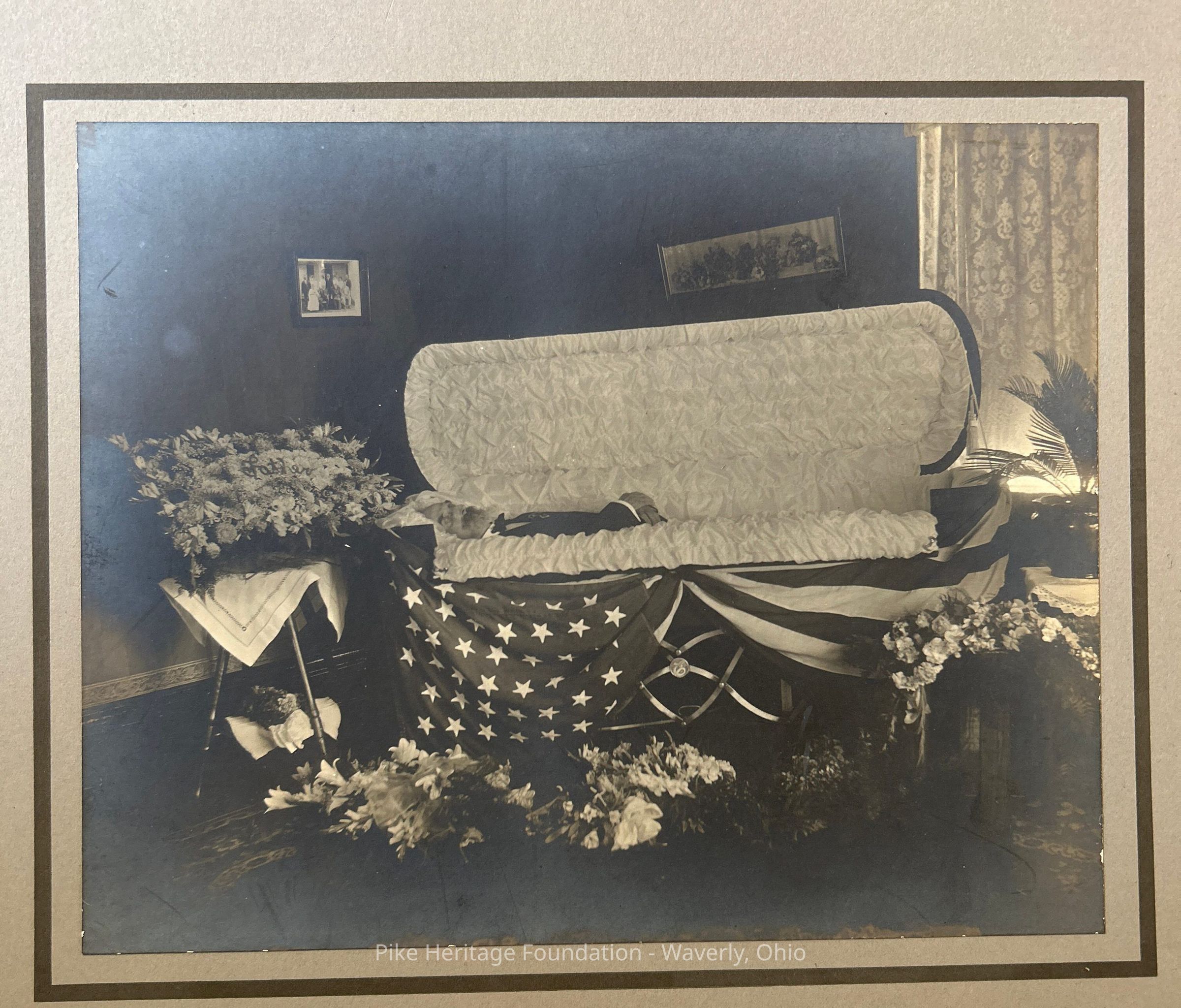 Photograph taken of the deceased Eli Halterman photographed in the Omar Davis funeral home located in Beaver, Ohio. Mr. Halterman was a local businessman, postmaster, and a Civil War veteran of the 53rd Ohio Volunteer Infantry.