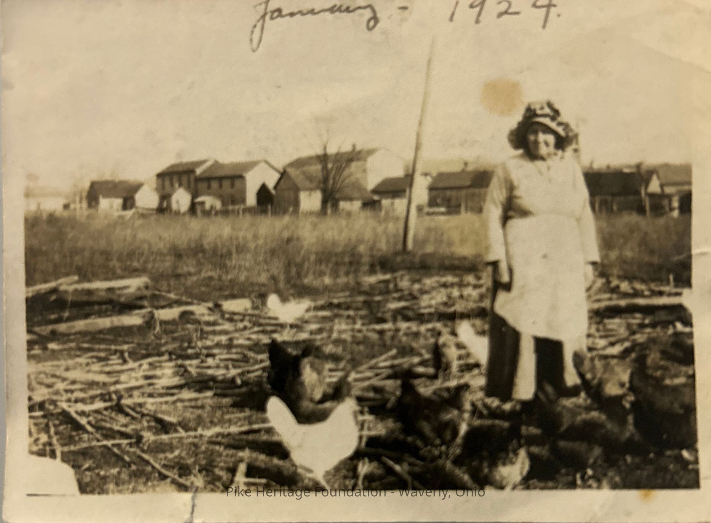 Image believed to be Mrs. Scheutle of Beaver taken at the rear of their State Route 335 property looking northeast toward Main Street.Collection