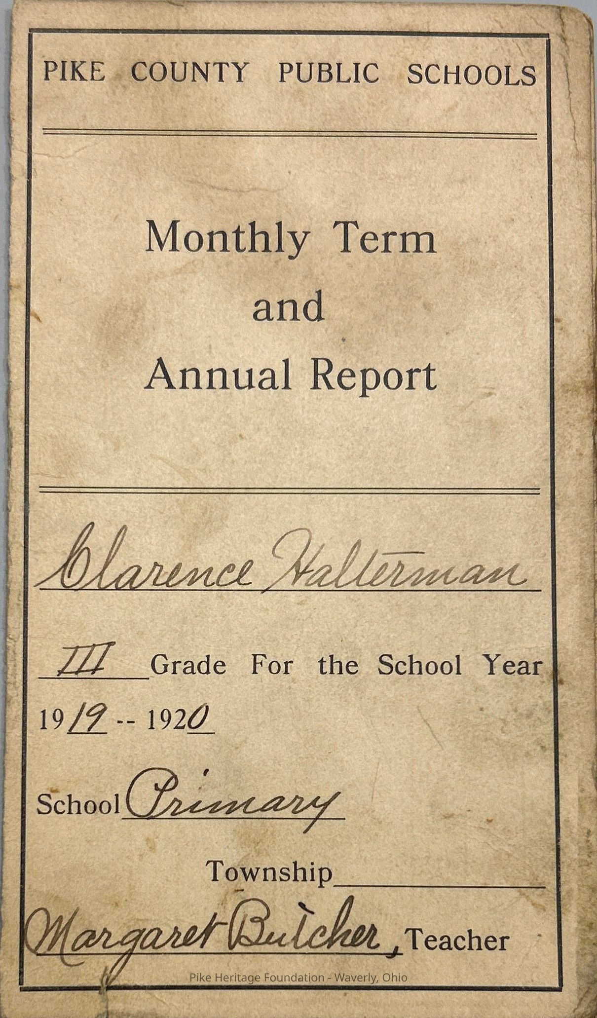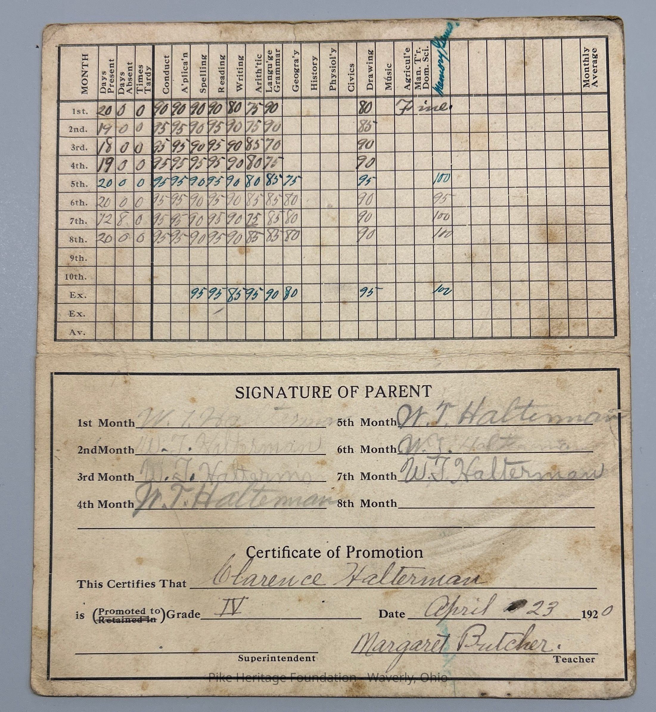1919 –20 Pike County Public school grade card assigned to Clarence Halterman of Beaver primary school. Grade card is signed by his teacher, Margaret Butcher, and his father William to come to Halterman.Collection