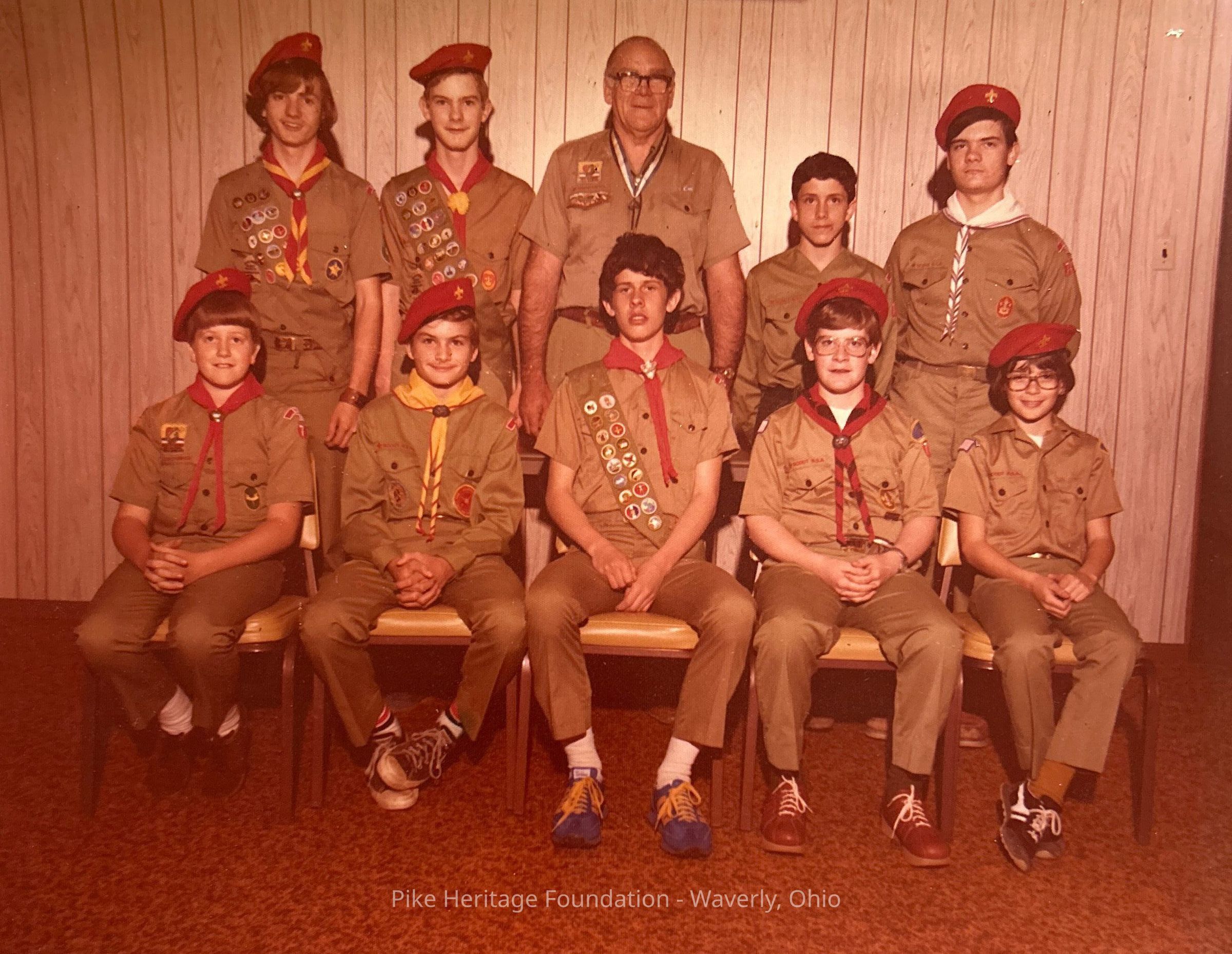 Members of Beaver Boy Scout Troop 73 sponsored by the Beaver Lions Club pictured about 1980. Scouts include Scott Slone, David Teeters, Alton Davis, Brad Pendel, Bruce Overly, Greg Chapman, Mitch Chapman, scoutmaster Roy Manning, unknown, and Mark Rigsby.Collection