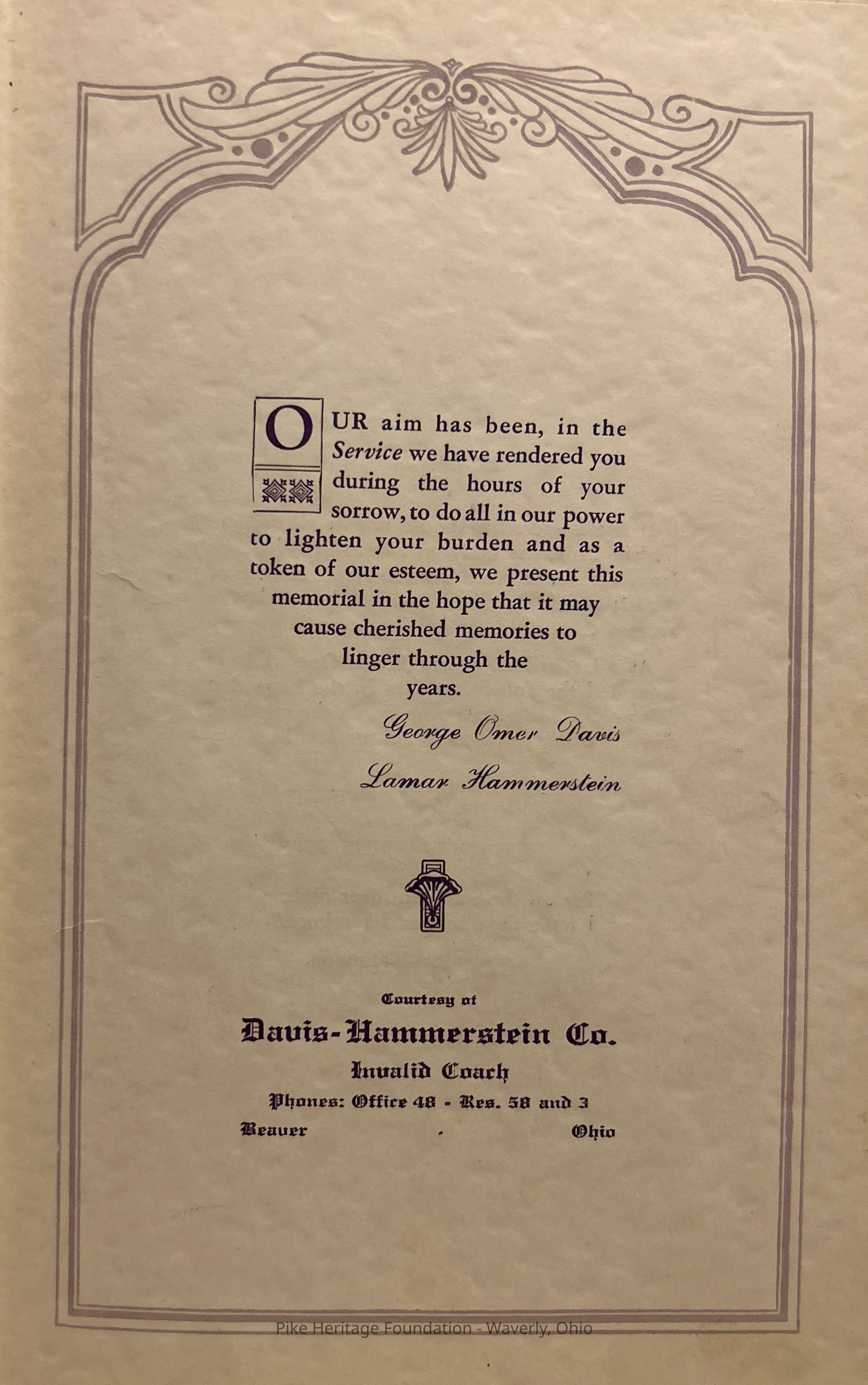 John Friedley, son of Jacob and Barbara Friedley, was born at Bloom furnace, Scioto county, Ohio, on August 5, 1859. He was educated in the public schools and was confirmed in the Lutheran church at the age of 16. He was married on February 21, 1897 to Miss Zumba Westfall of near Beaver, and lived near Gregg’s Hill for a number of years, where he worked on a farm. Later, moving to Beaver he passed away at his home, February 12, 1937, at the age of 77. He leaves the devoted wife; one sister and numerous other relatives and friends. He was a very quiet nature and kind disposition and always enjoyed doing something to lighten the cares and burdens of others. He had been feeling ill of health for the last four years and a while his illness was a very painful nature. He endured his suffering very patiently and was conscious to the very last and left the assurance that he was at peace with God. He lived his own life and nothing that we might say can add or take away. His funeral was held at the United Brethren Church in Beaver, Ohio, with the services conducted by Reverend Wilson.Collection
