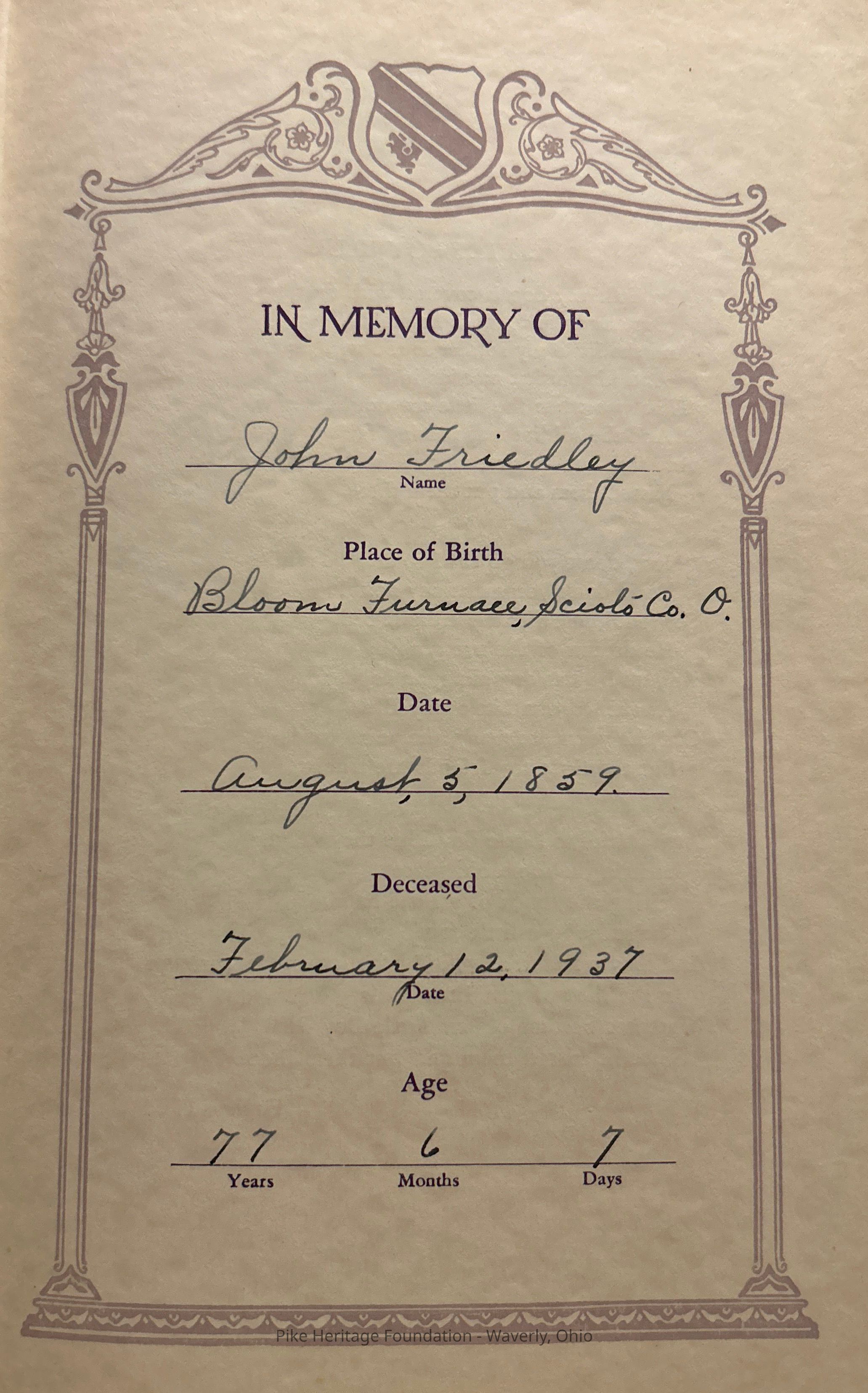 Memorial book for John Friedley, who was born in Scioto County Ohio on August 5, 1859 and died February 12, 1937 at the age of 77. Book includes information about where the service was located, the service text, the casket bearers, those who attended the service, And various other information regarding his funeral.