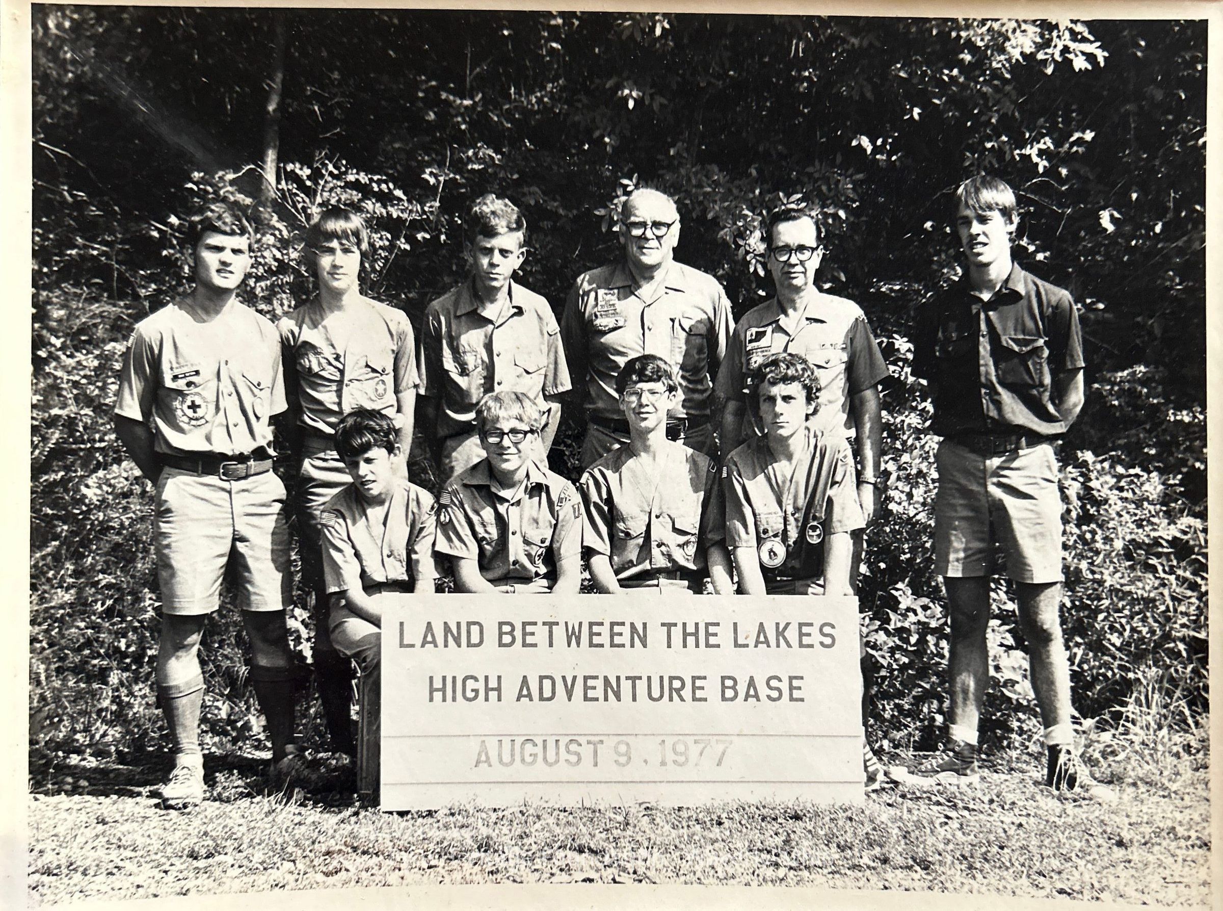 Members of Beaver, Boy Scout Troop 73 pictured at the Land Between the Lakes High Adventure Base in August 1977. Members include Alton Davis, Ronnie Brown, Brad Teeters, Darrell Brown, Rick Slone, Roy Manning, and Roger Jackson.Collection