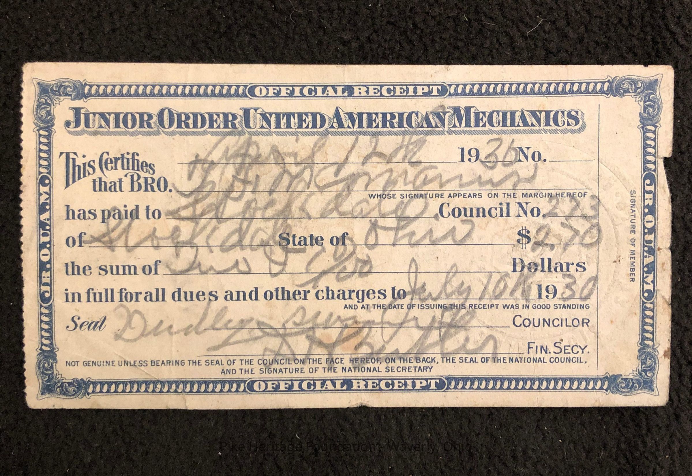 The Junior Order of United American Mechanics was organized in Stockdale, Ohio, in 1907. This fraternal organization flourished for many years and had a hall on Main Street, which was raised in 1963. The women’s auxiliary was called the Daughters of America. This 1930 receipt for dues included an embossed seal stamped on the right hand side.Collection