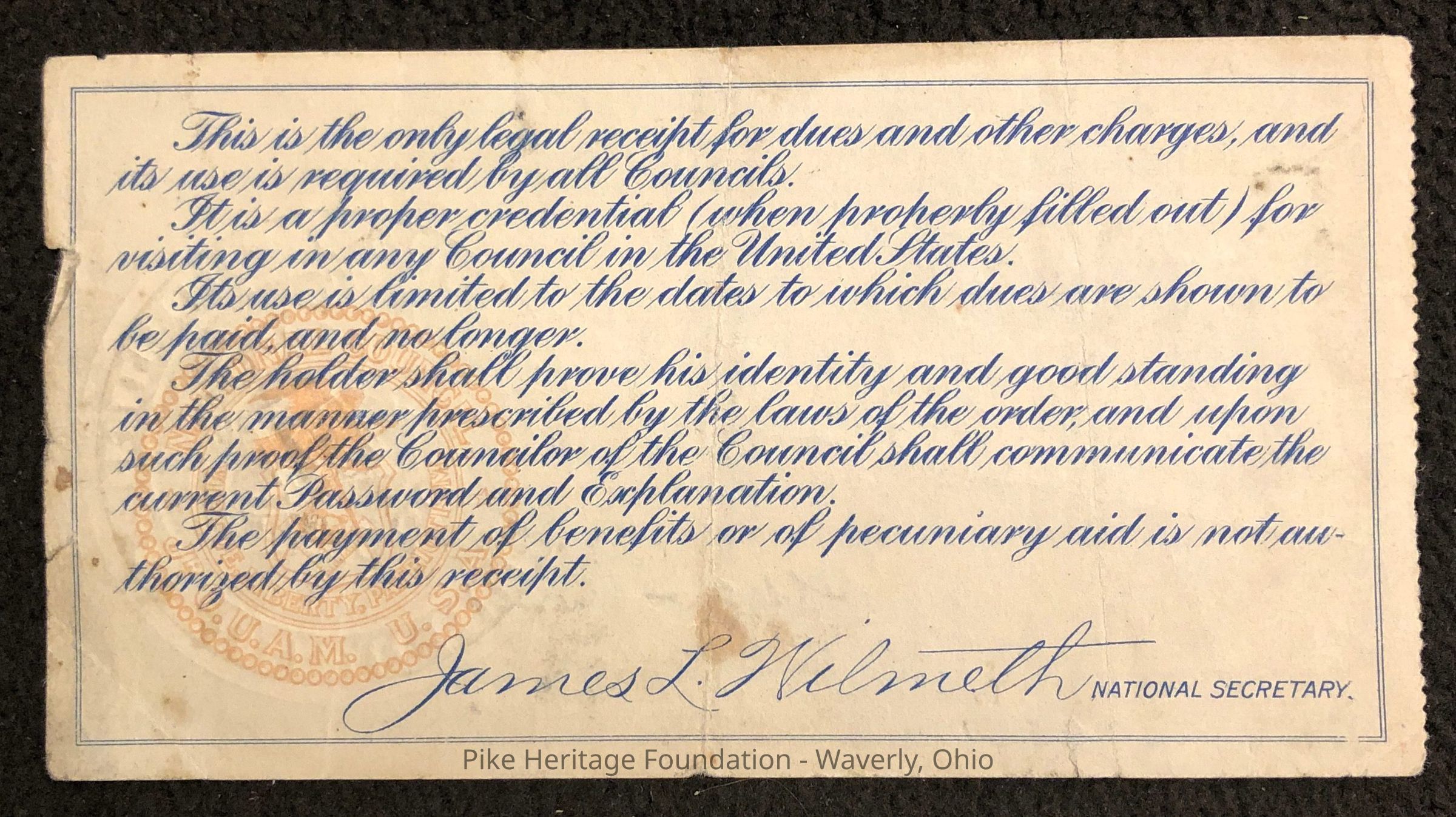 Junior Order of United American Mechanics Membershhip ReceiptEntry/Object ID