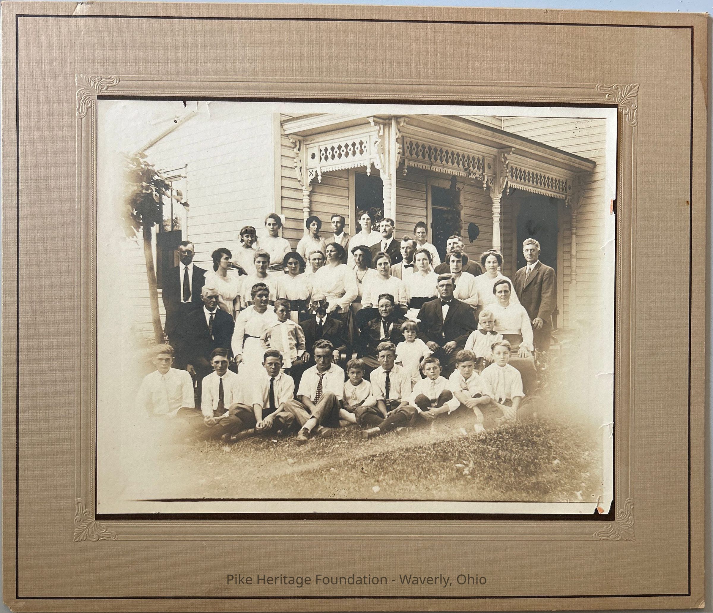 Photograph taken in honor of the 50th wedding anniversary of Eli and Mary Elizabeth Halterman taken in August 1915. First row left or right: Ora Rapp, H. G. “Dick” Halterman, Harold Adams, Chauncey Halterman, Bob Witherspoon, Louis Adams, Raymond Dailey Jr., Kenneth Brust, and Herman Halterman. Second row left right: Mr. and Mrs. Everett Dailey and Orville, Eli and Mary Elizabeth Halterman, Helen Halterman, Claude Halterman, C. W. Halterman, and Lizzie Halterman. Third row left right: Henry Albin, Cordis Brust, Norma Halterman, Gladys Frey, Emma Trenner, Orpha Witherspoon, Luella, Halterman, Edna, Halterman, Newton Halterman, Mabel Balzer, Ola Halterman, Arma Adams, and Louis Adams Sr. Fourth row left right: Margaret Brust, Myrtle Dailey, Myrtle Halterman, John Brust, Ollie Brust, Oscar Halterman, Nancy Wheeler, and William Tecumseh Halterman.